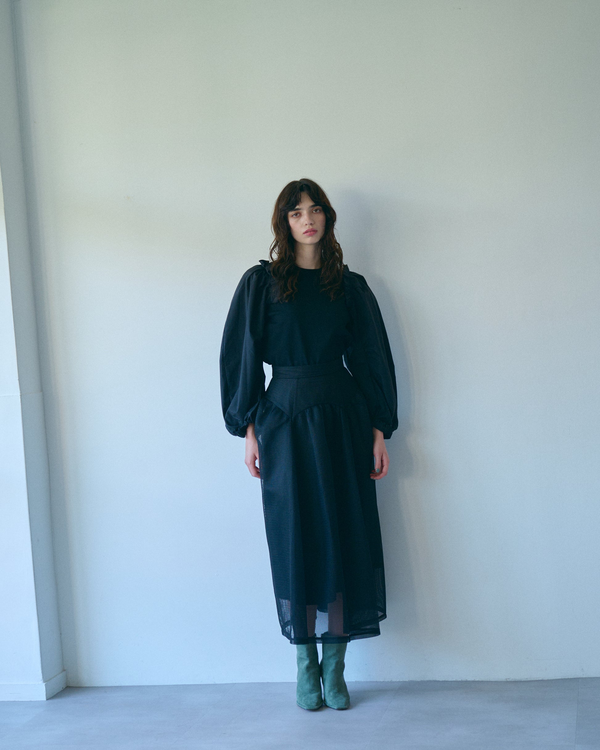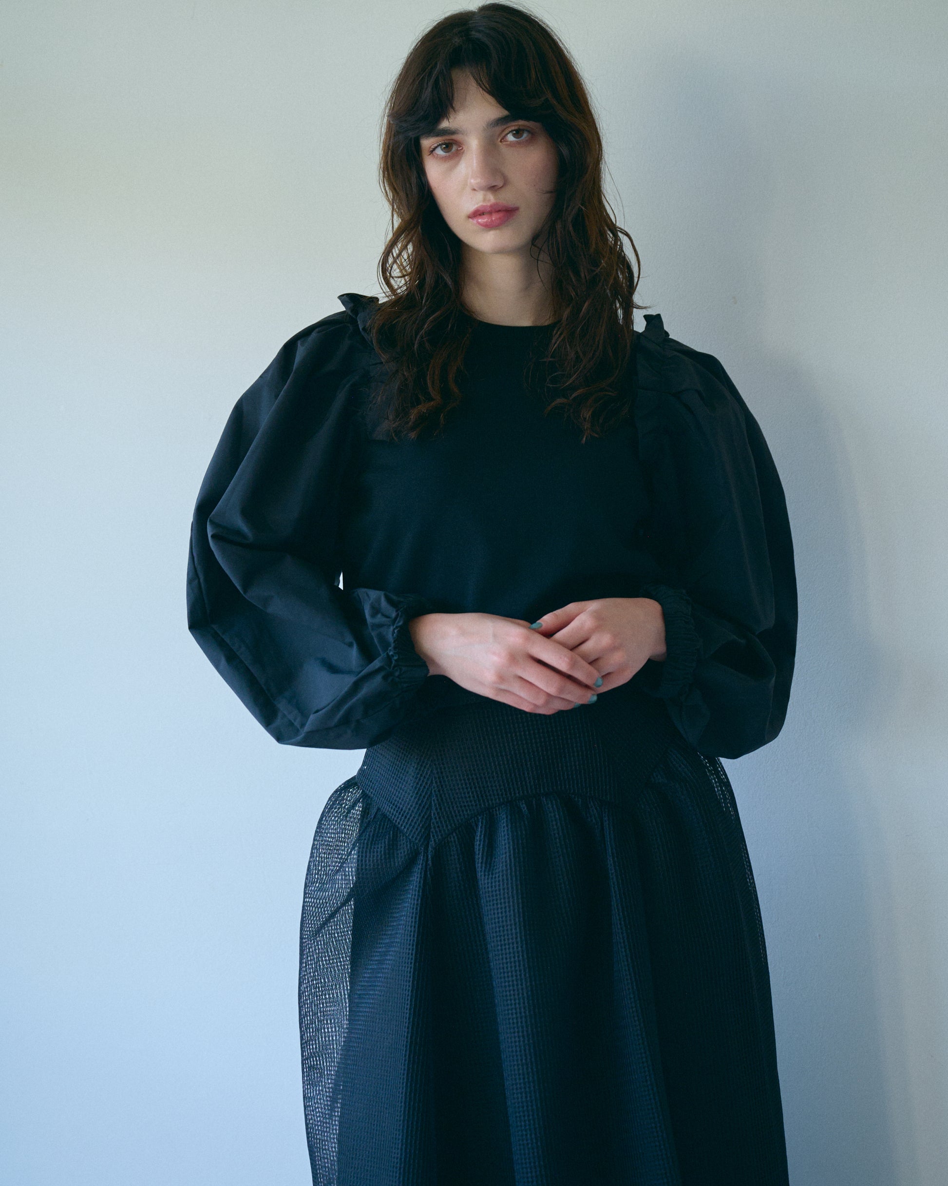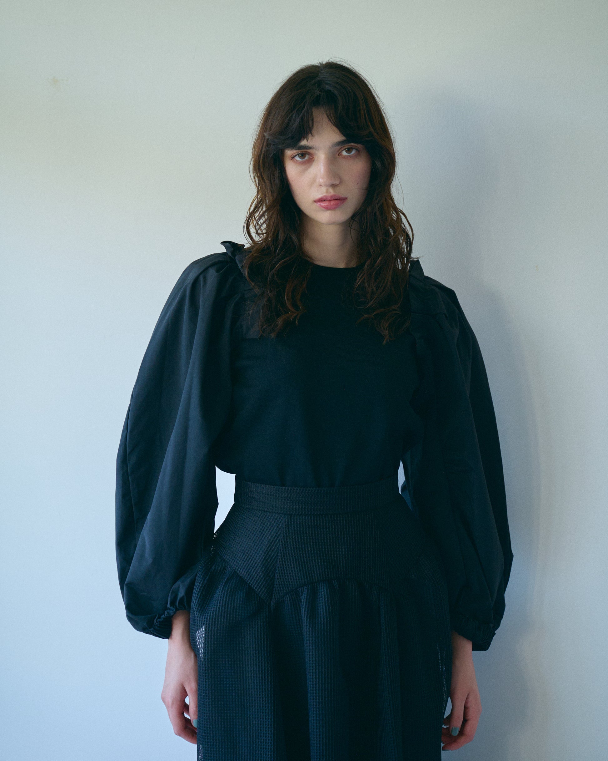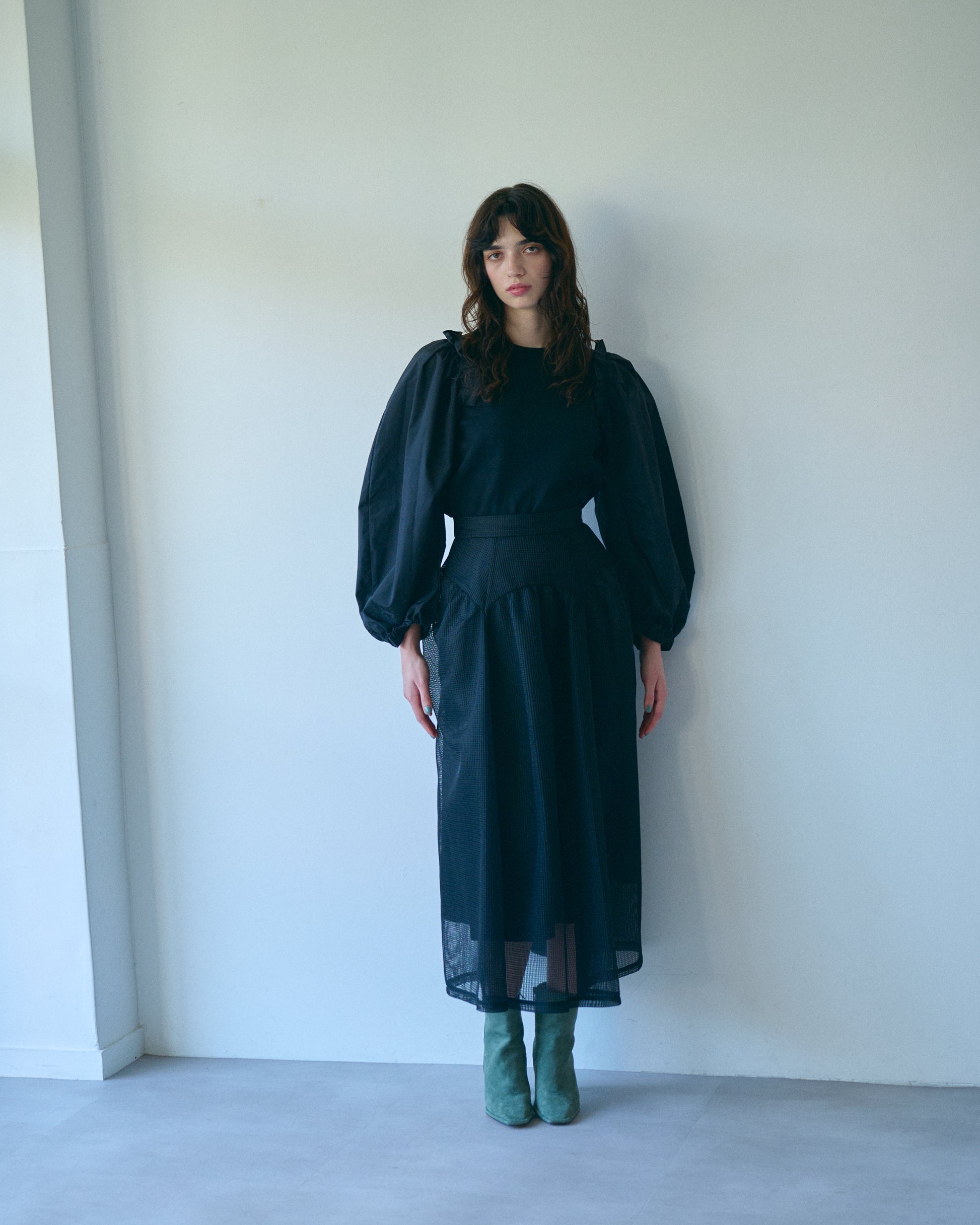 袖は立体的にボリュームを出して身頃ニットで着心地の良いすっきりとしたデザインに仕上げました。