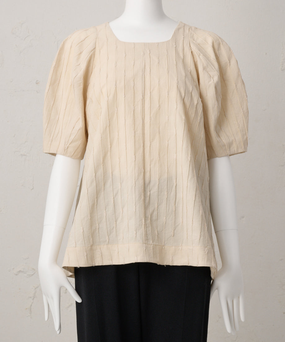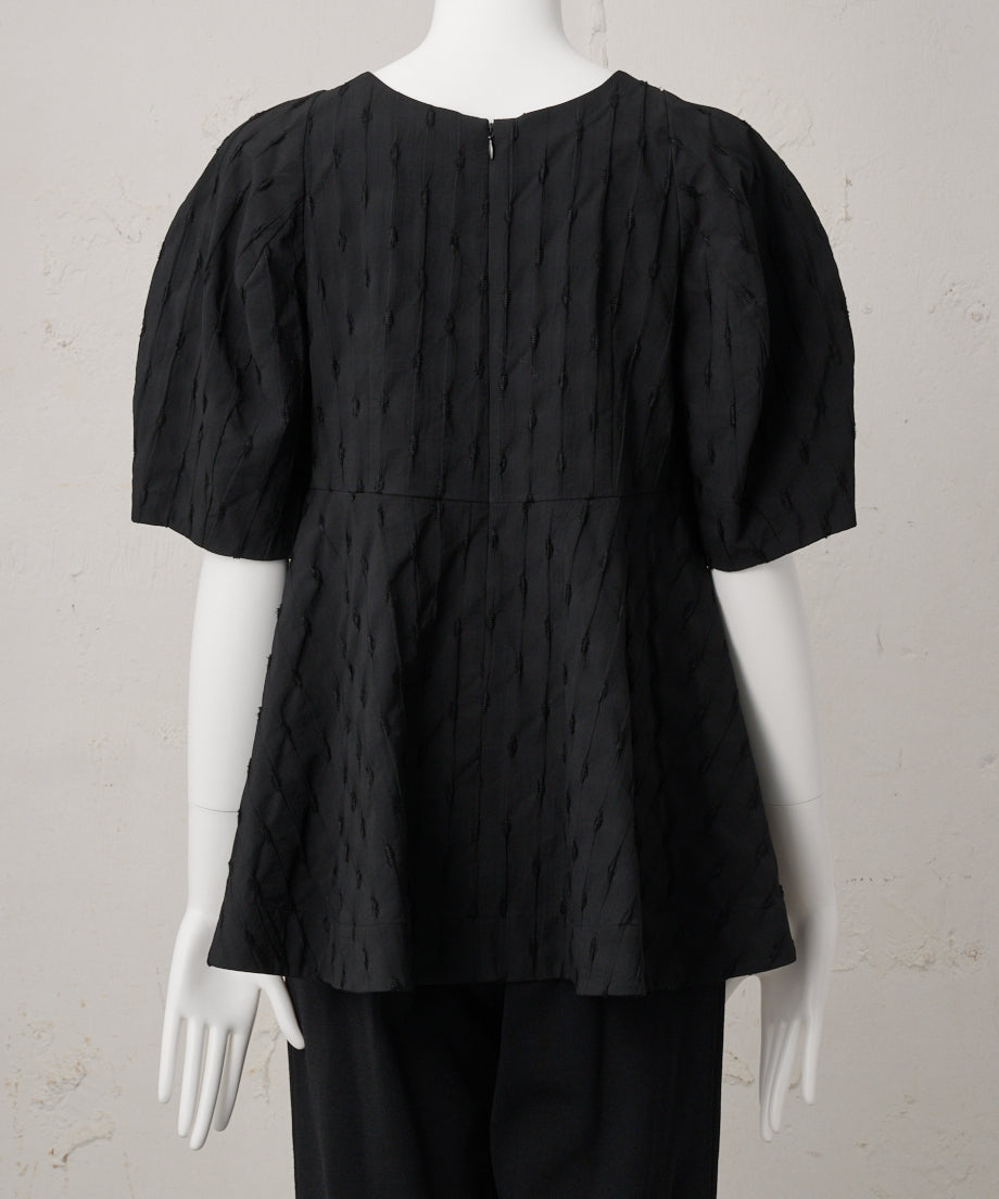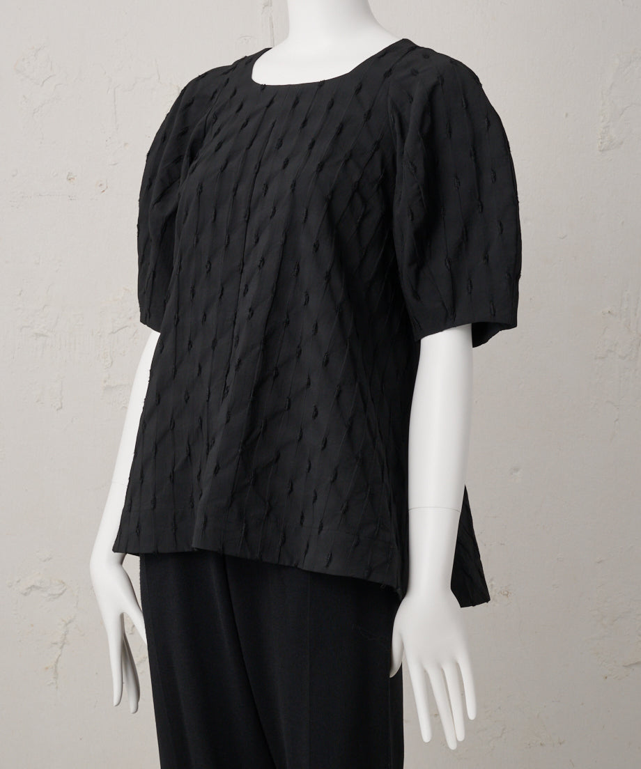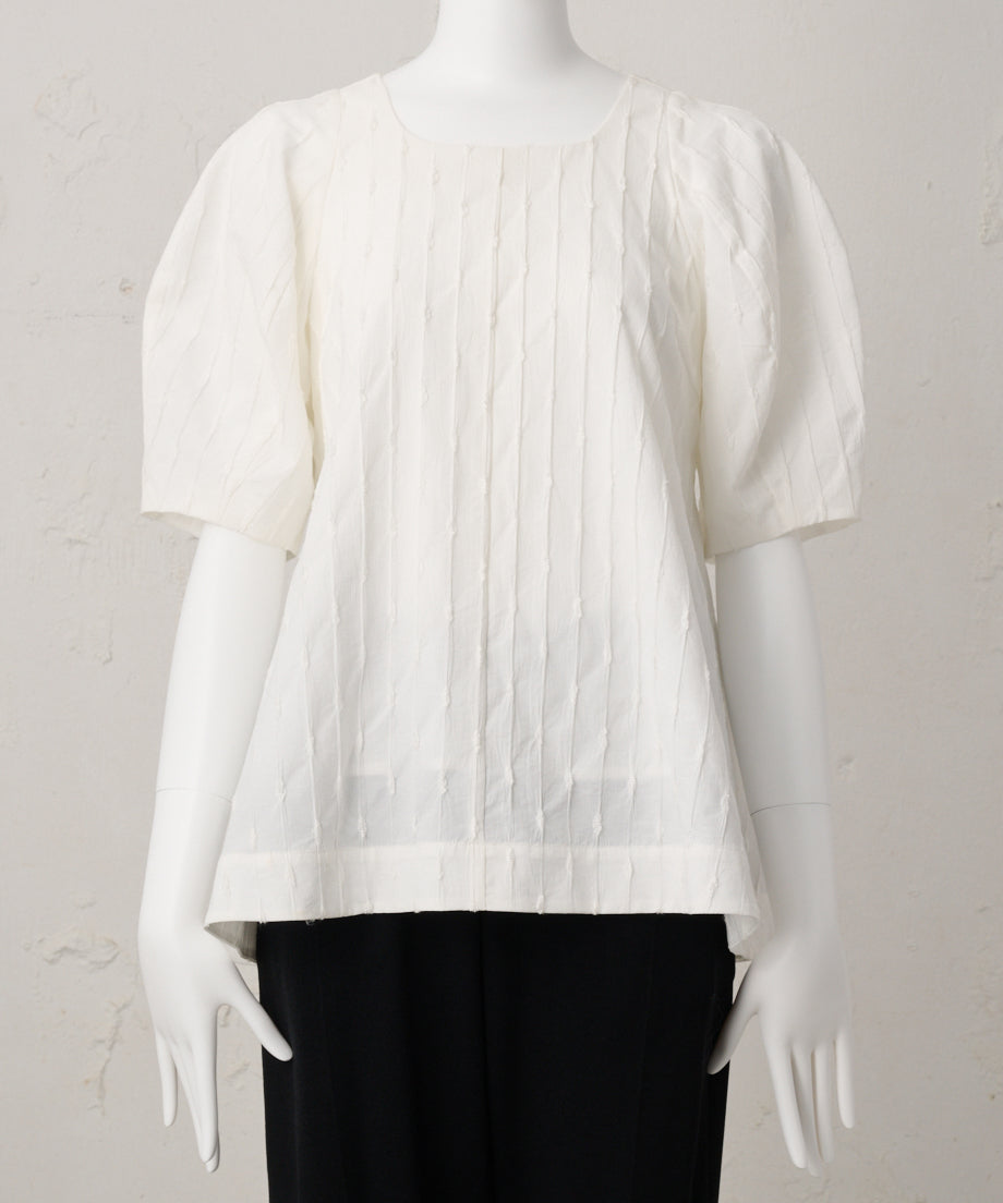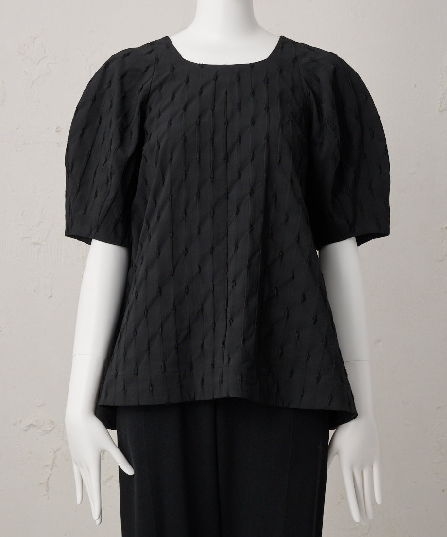 立体的に切り替えた丸みのある袖がポイントのドットジャカード生地のブラウスです。