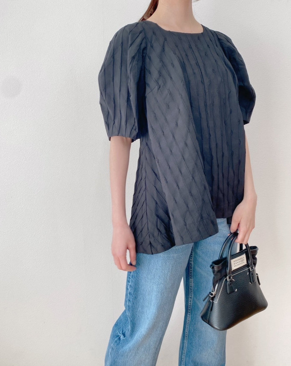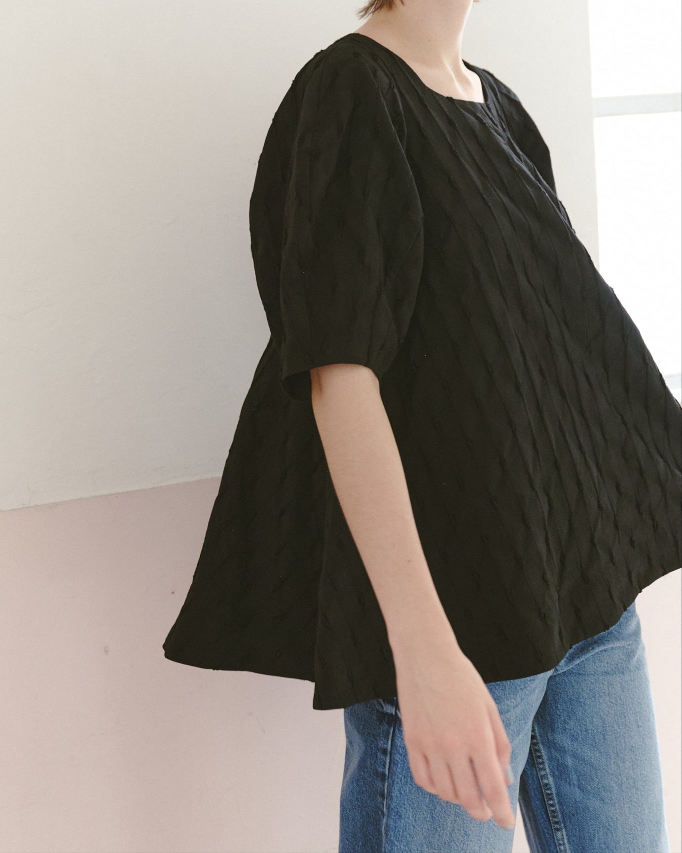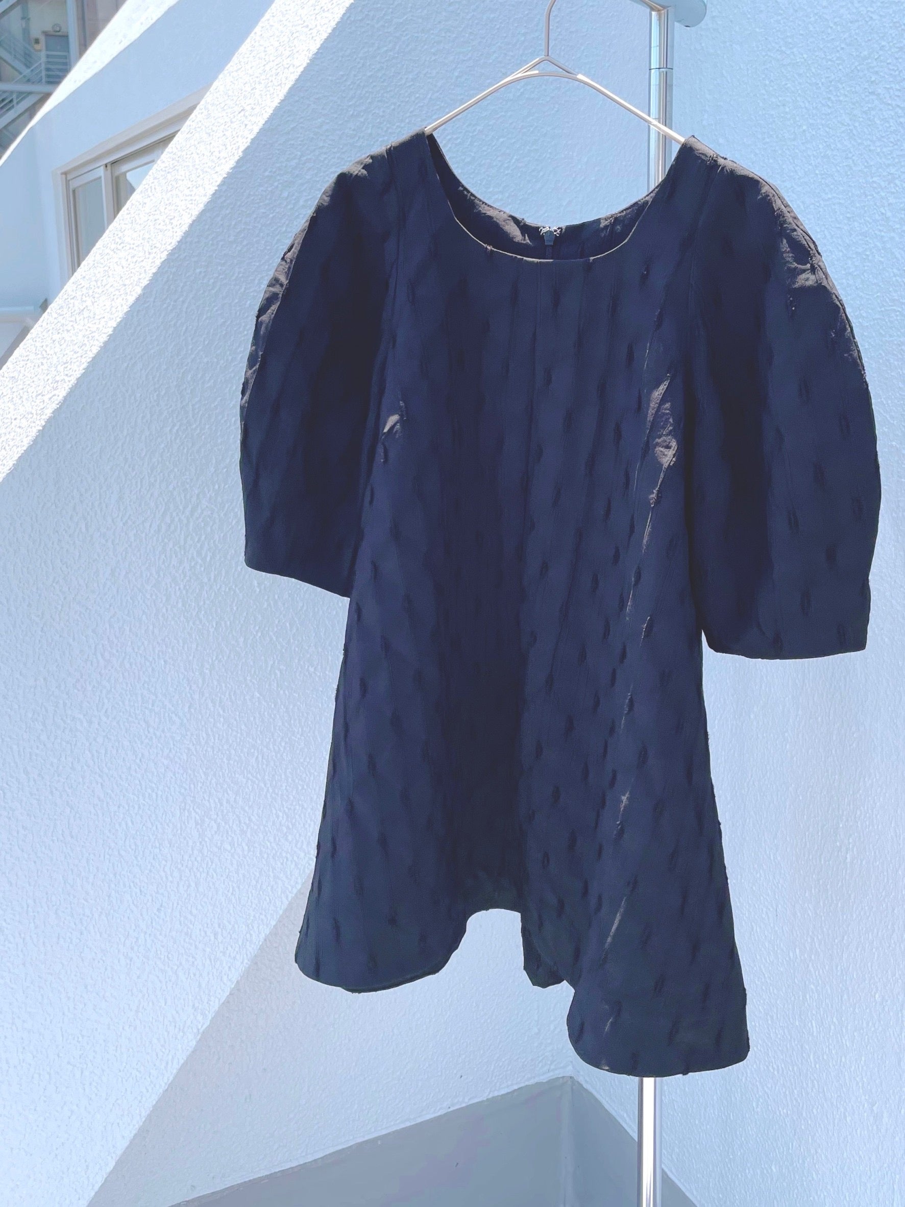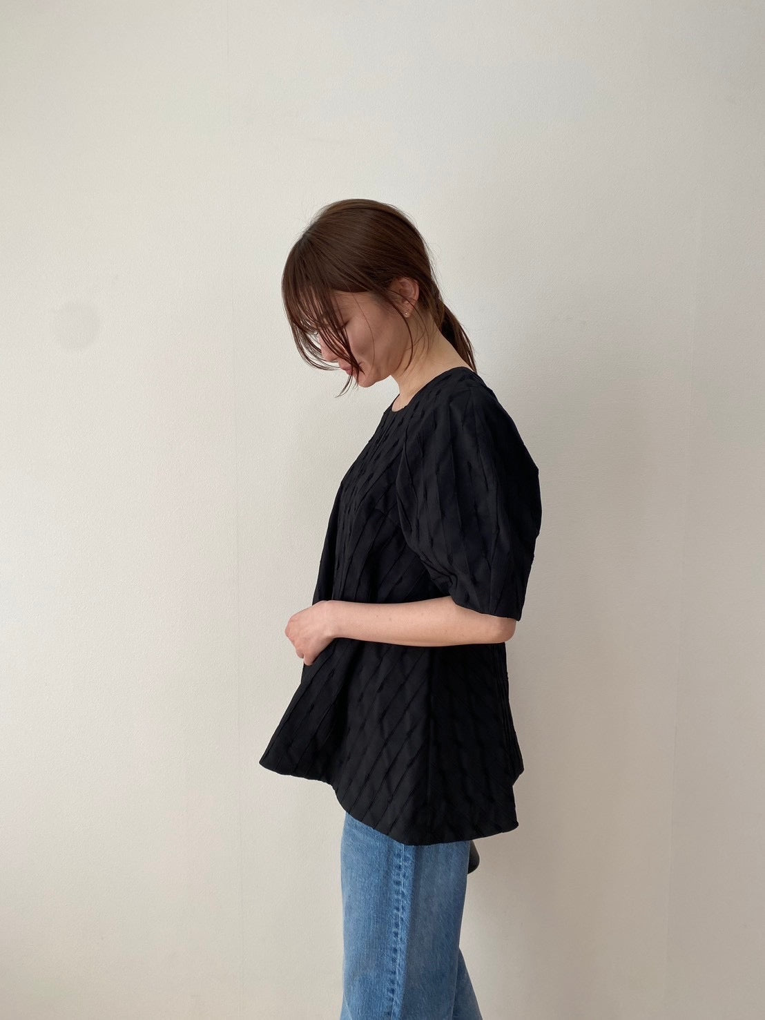 立体的に切り替えた丸みのある袖がポイントのドットジャカード生地のブラウスです。