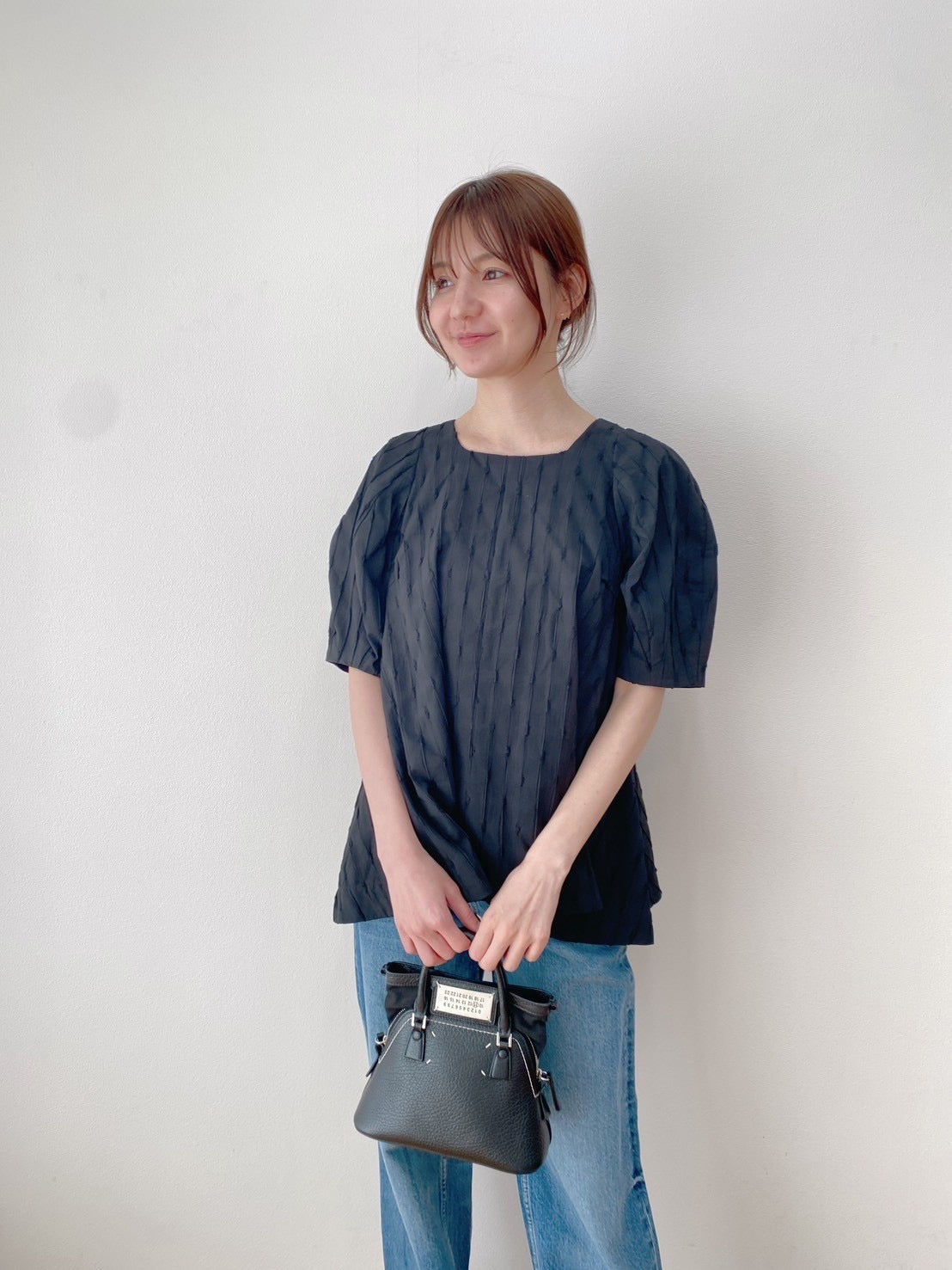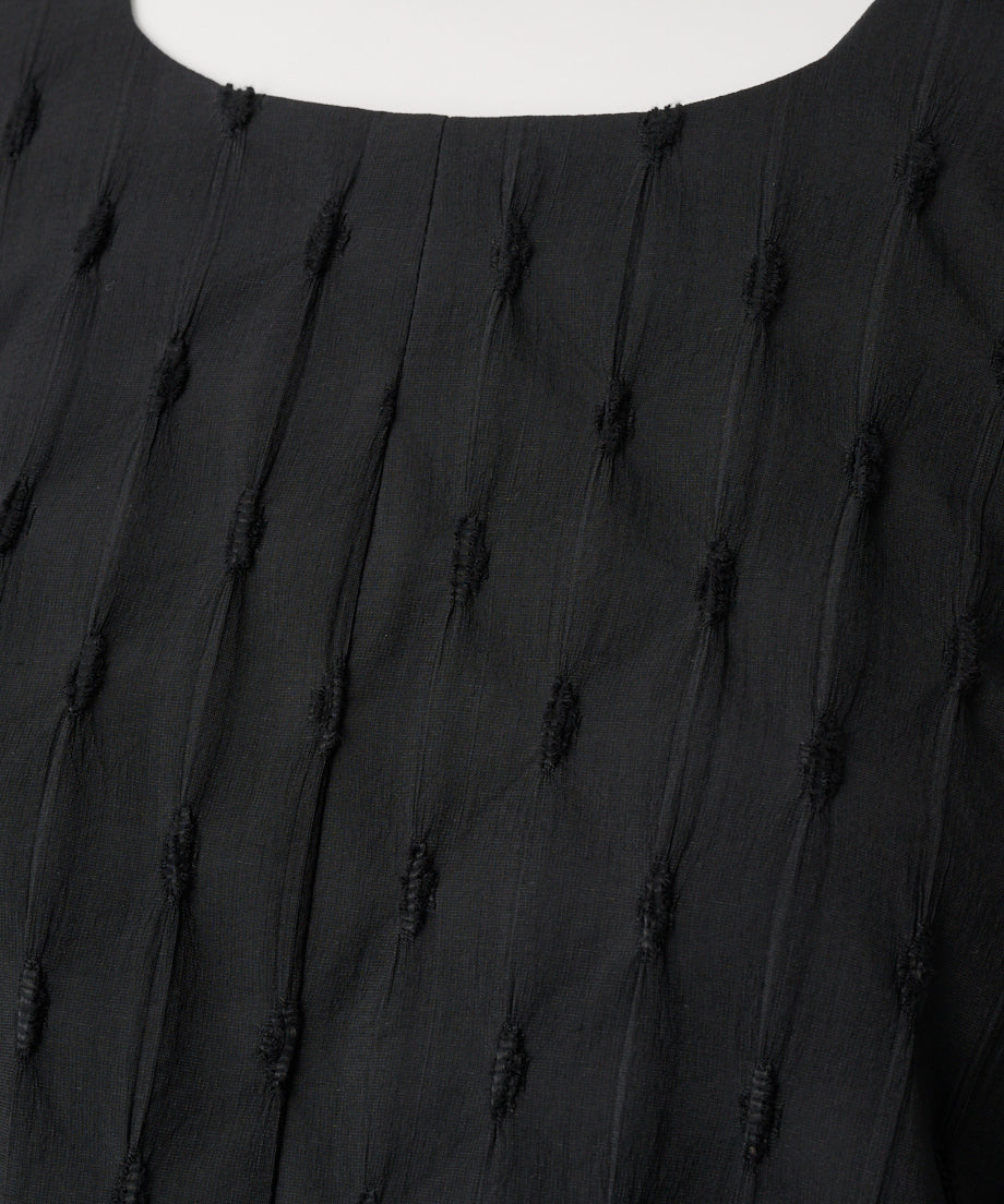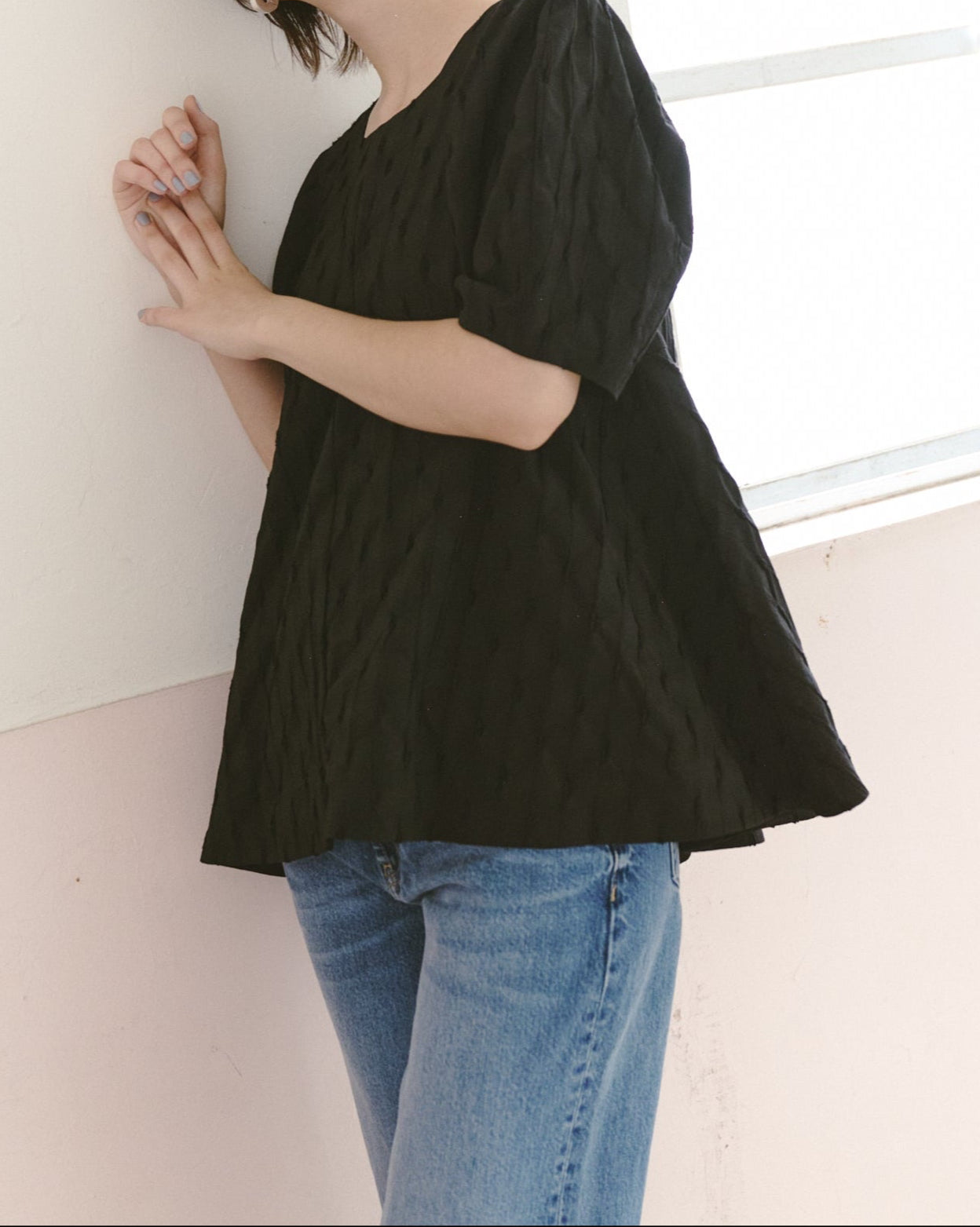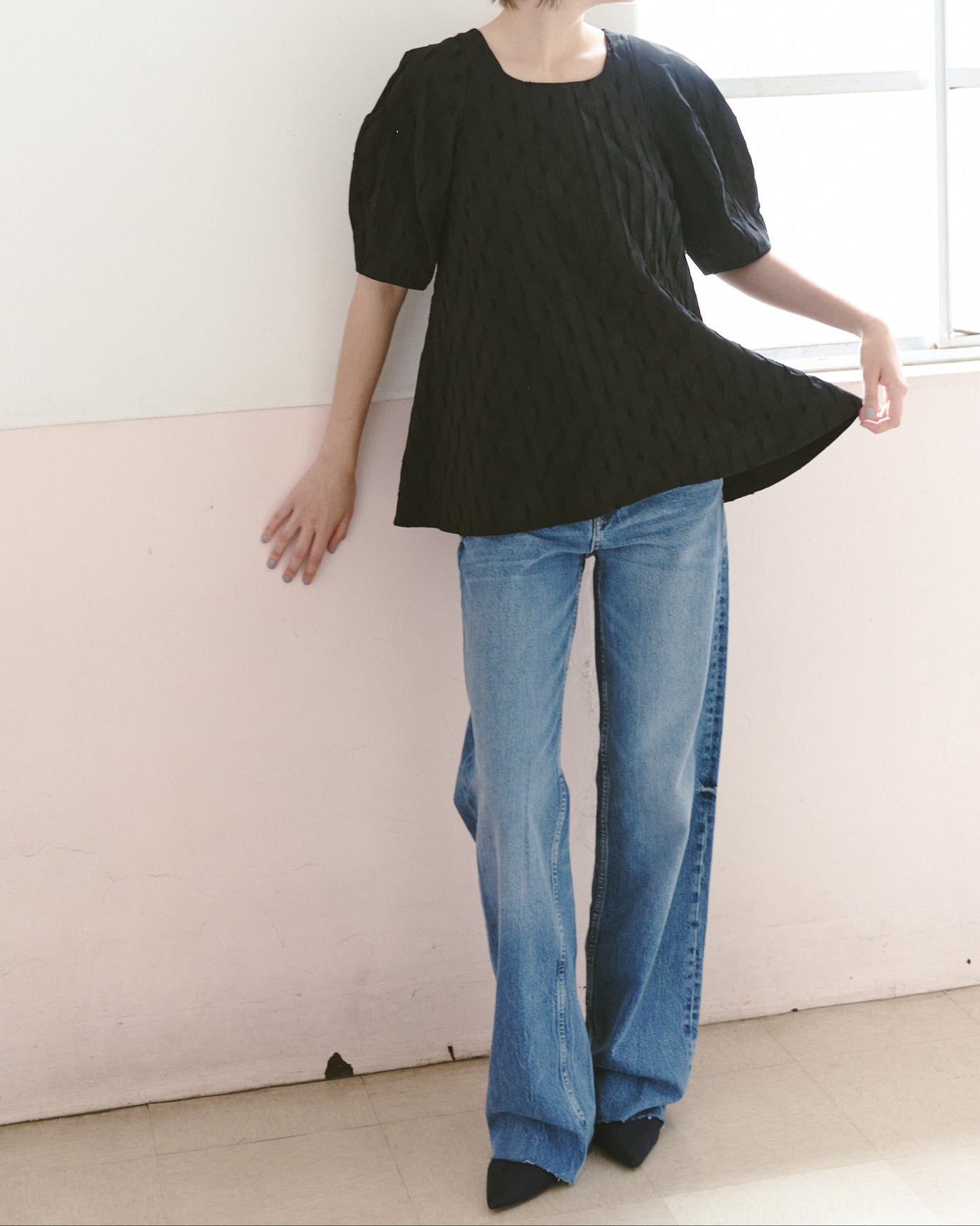 立体的に切り替えた丸みのある袖がポイントのドットジャカード生地のブラウスです。