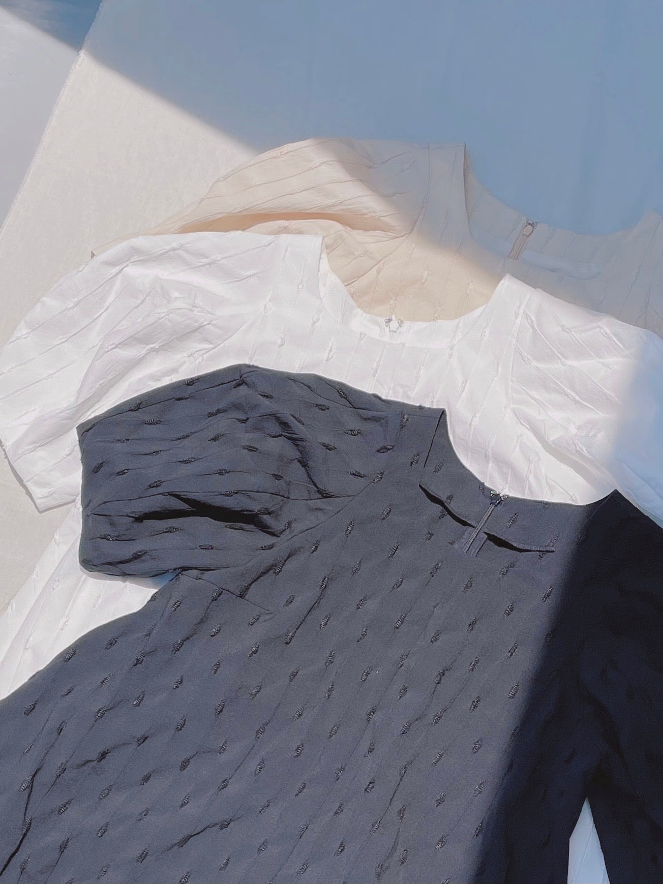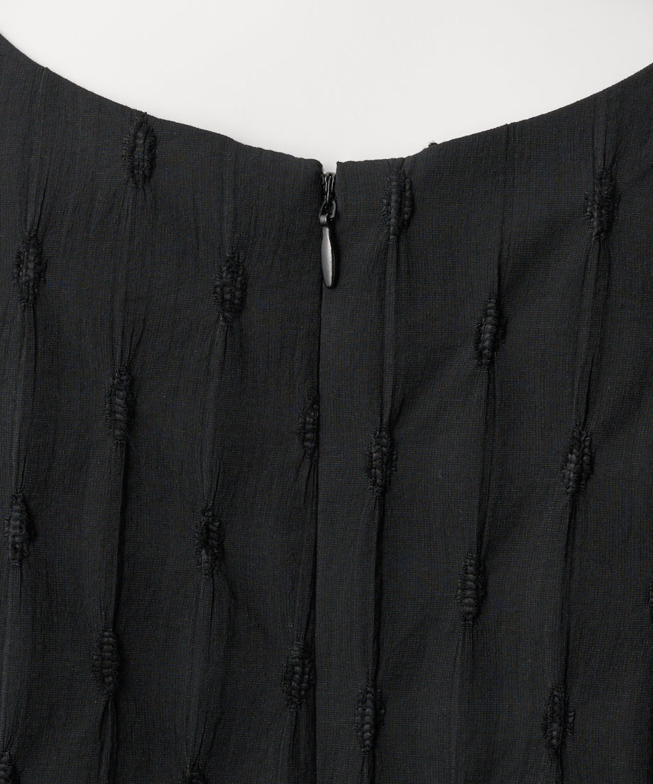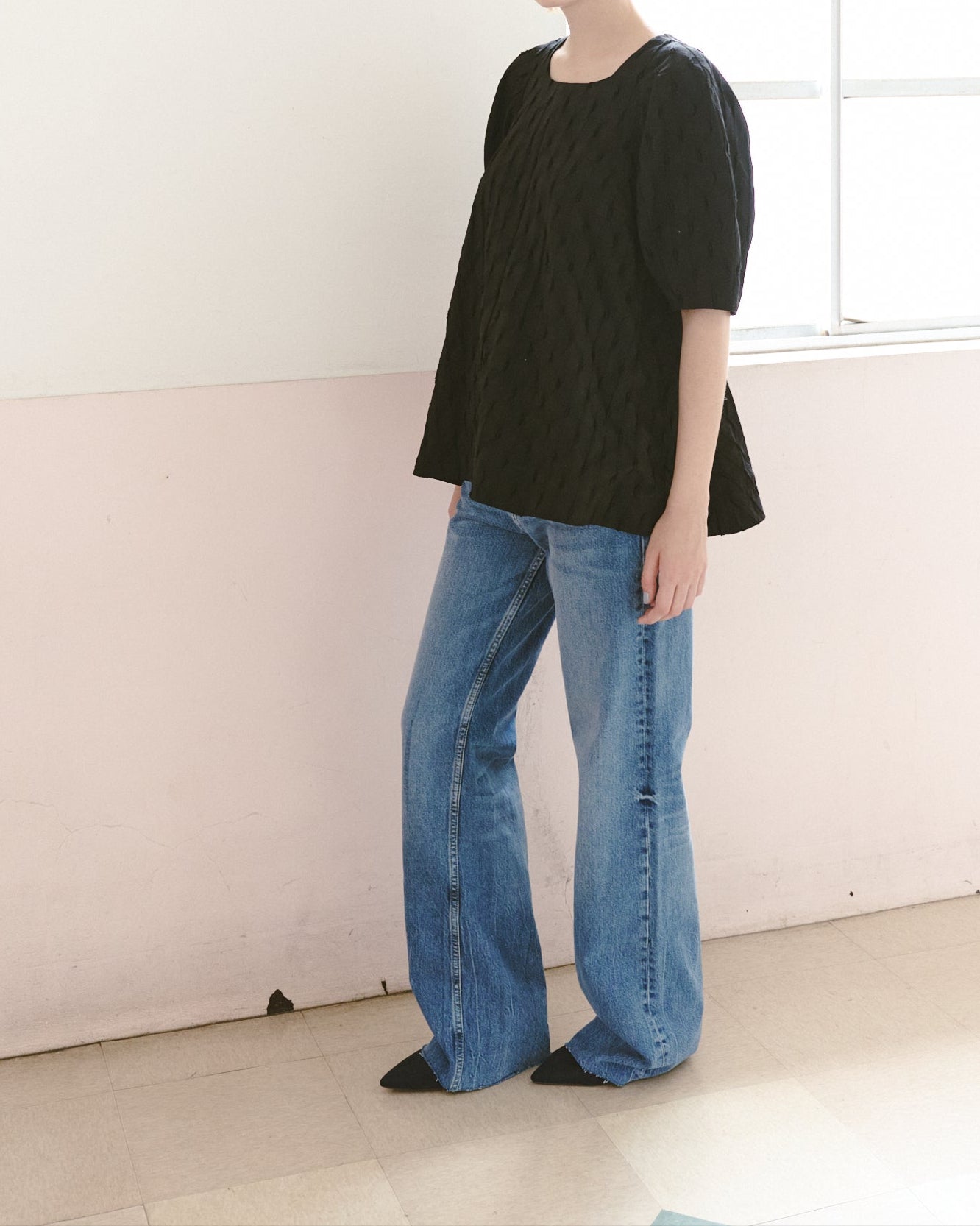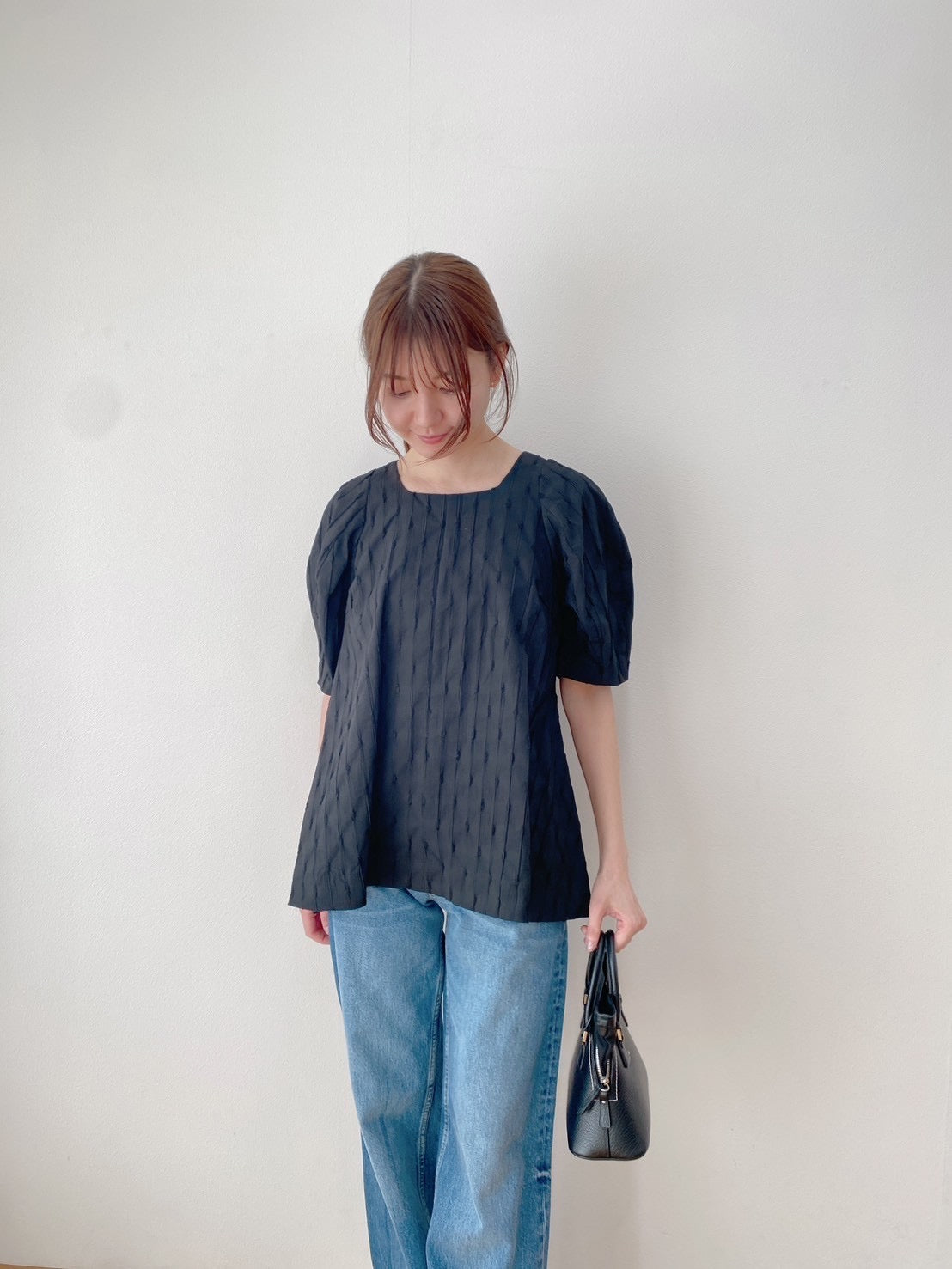立体的に切り替えた丸みのある袖がポイントのドットジャカード生地のブラウスです。