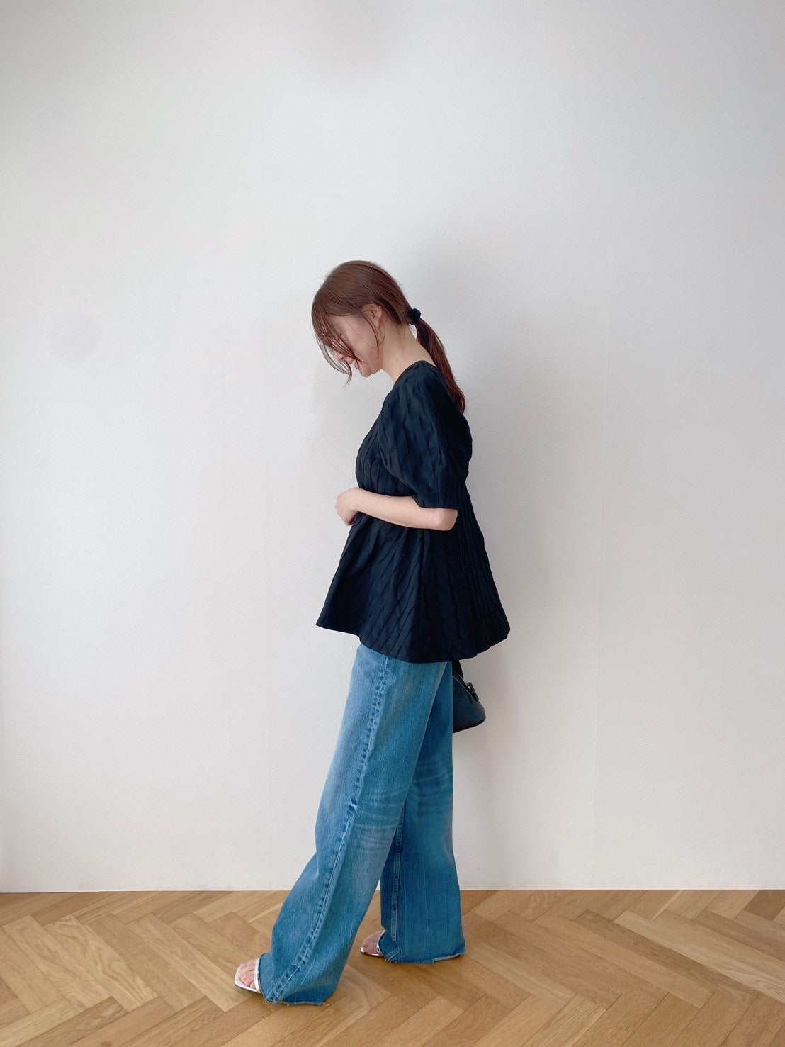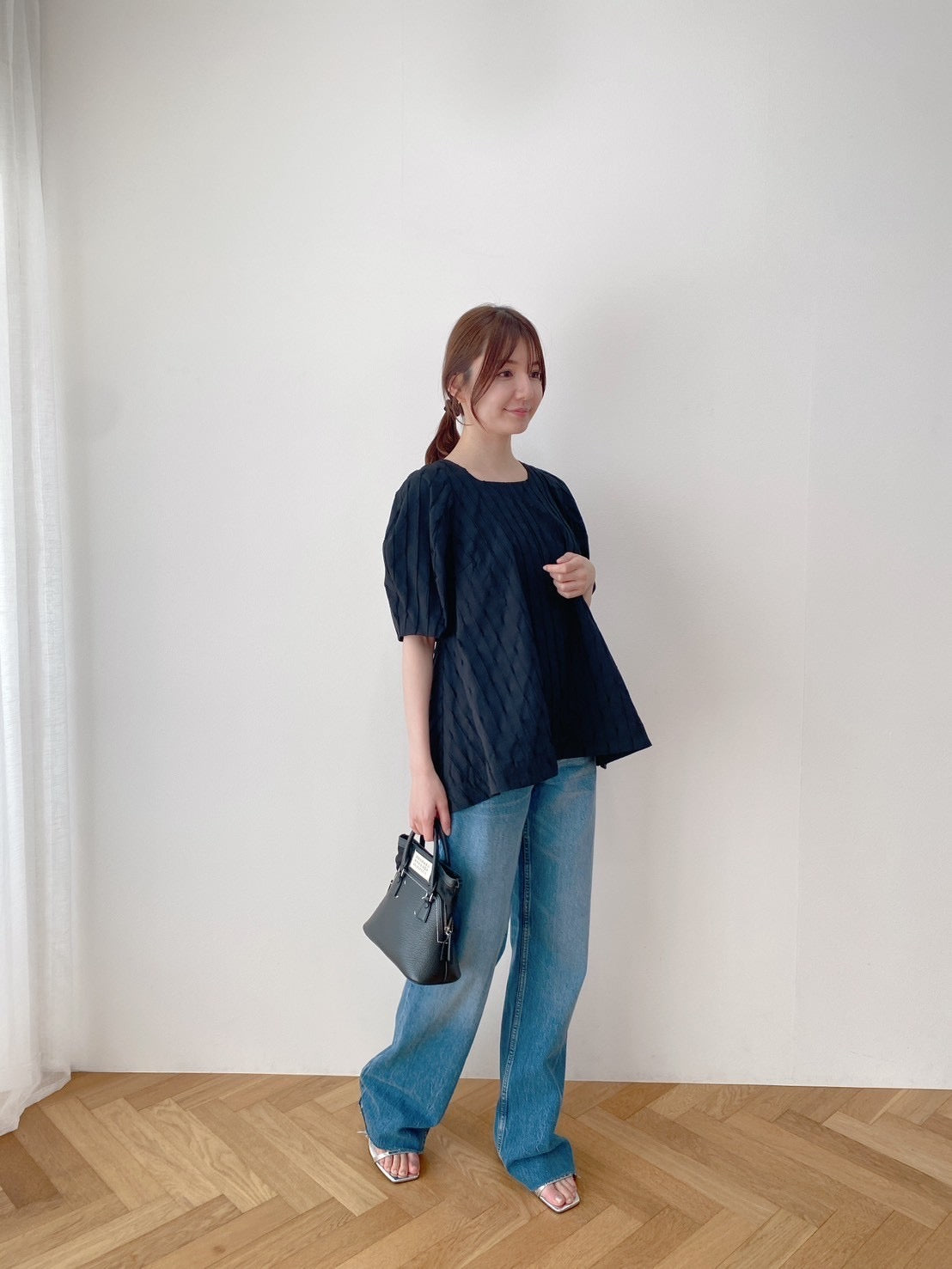 表面感のあるジャカード生地でシンプルなシルエットながら、カジュアルなボトムからキレイめ素材のボトムまで幅広く合わせられ、華やかなコーディネートに仕上がる一枚です。