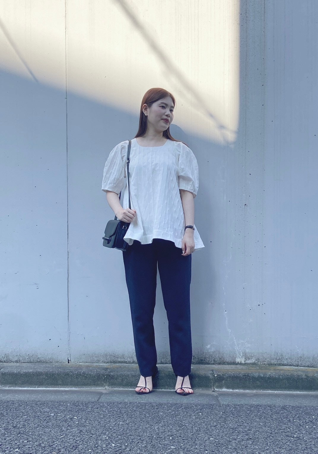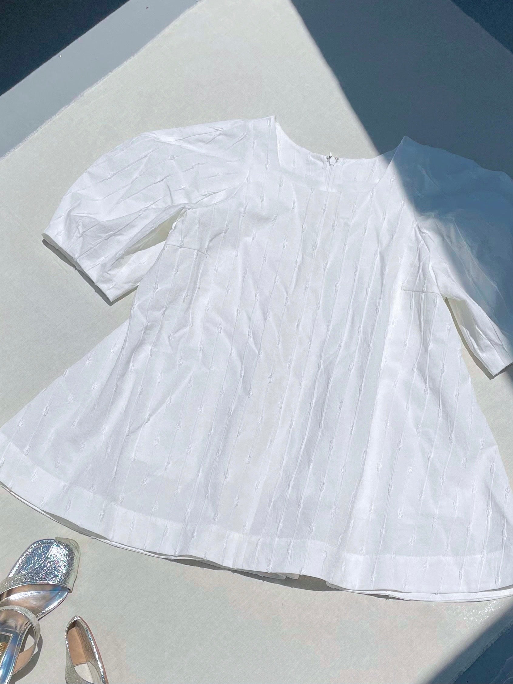 胸下から裾にかけて広がるテントシルエットは後ろでウエストを少し絞り、スタイルアップする形に計算されています。
