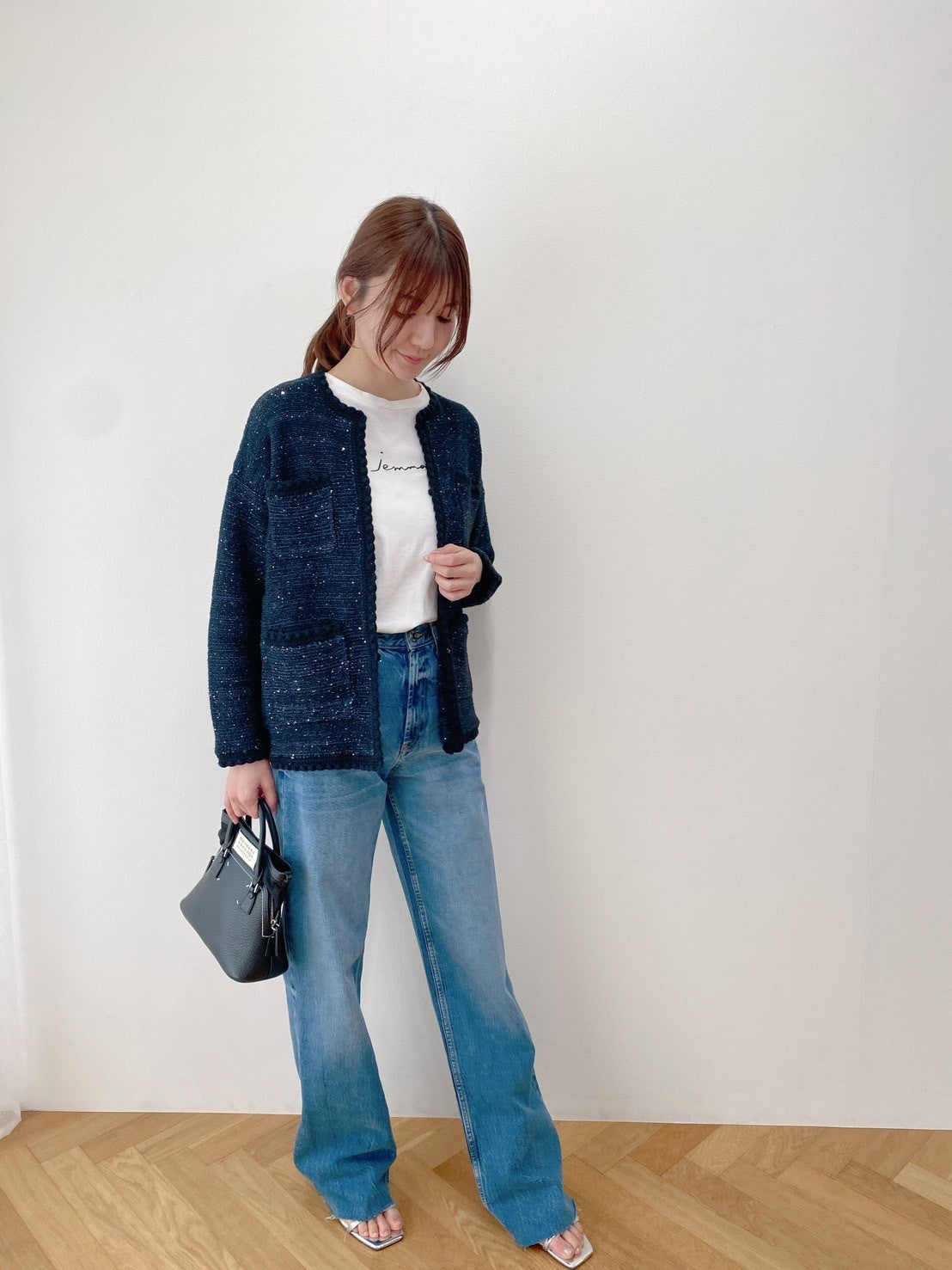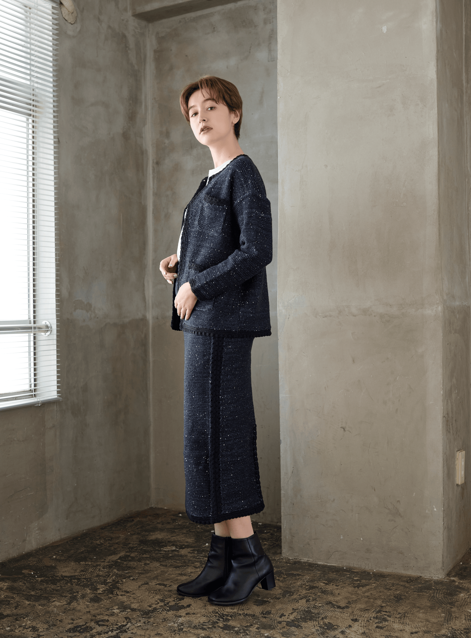 スパンコールヤーンをストレート糸に引き揃え、ツイード風に表情を持たせたカーディガン。