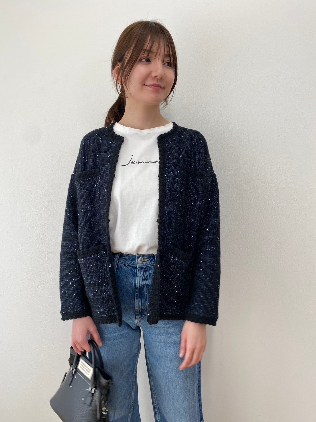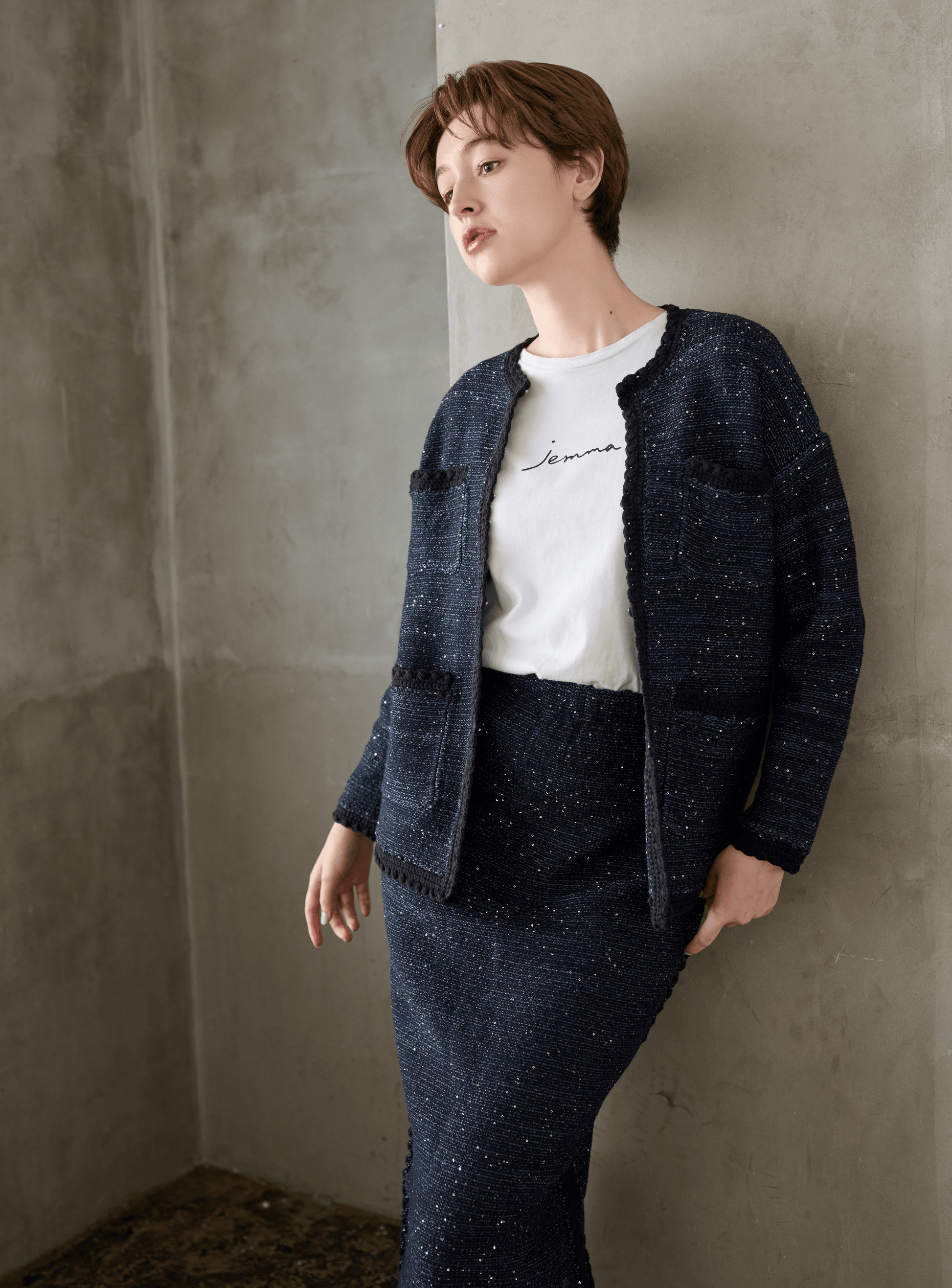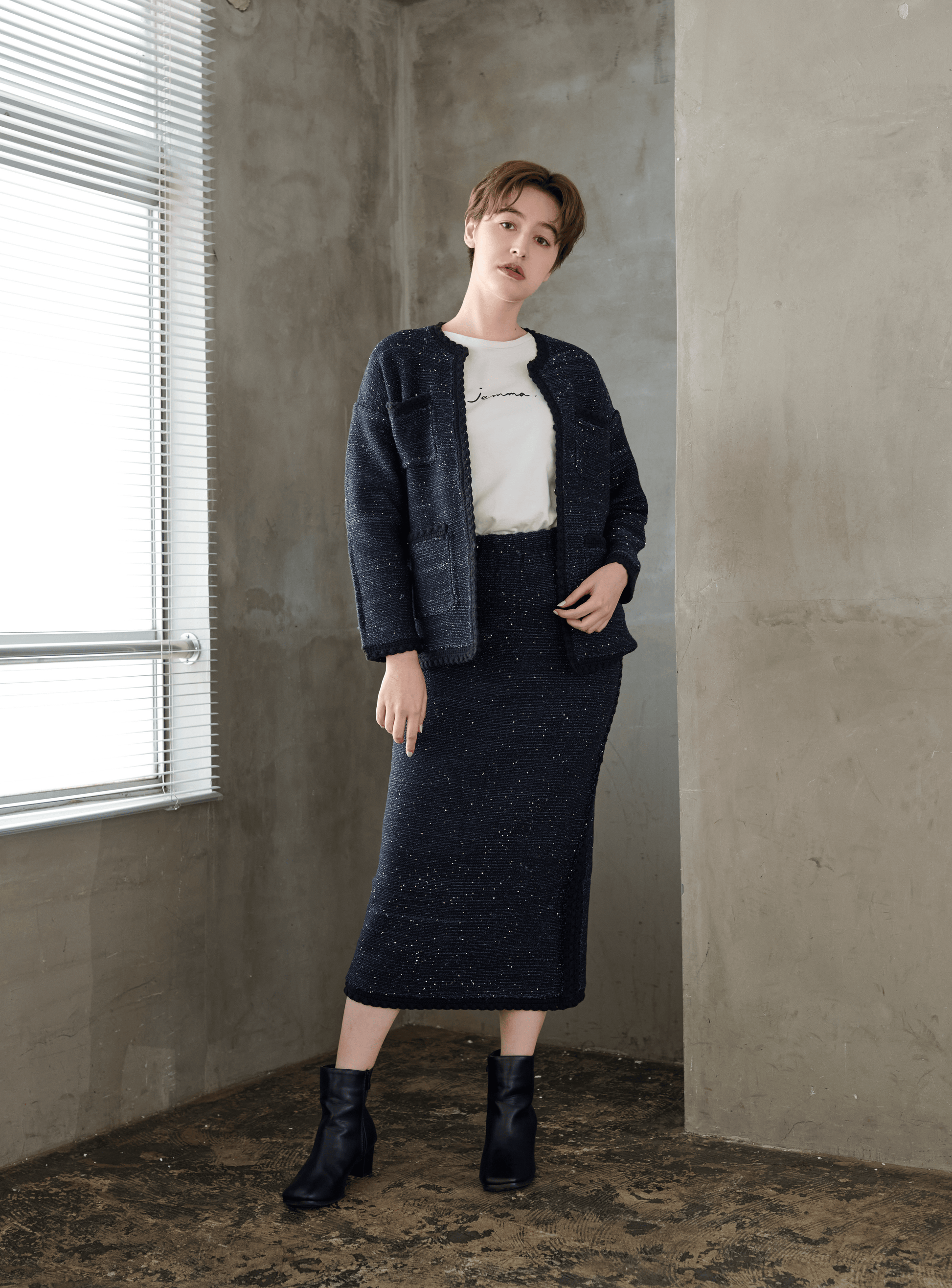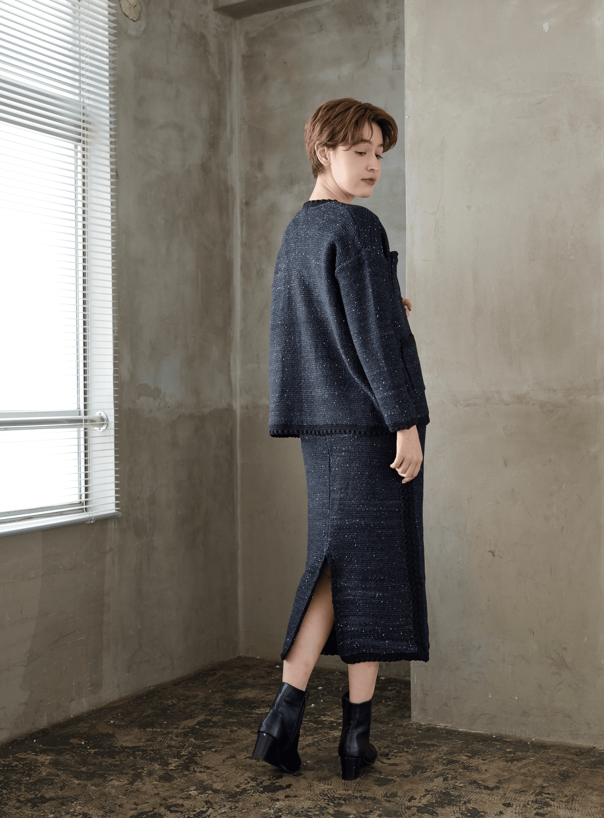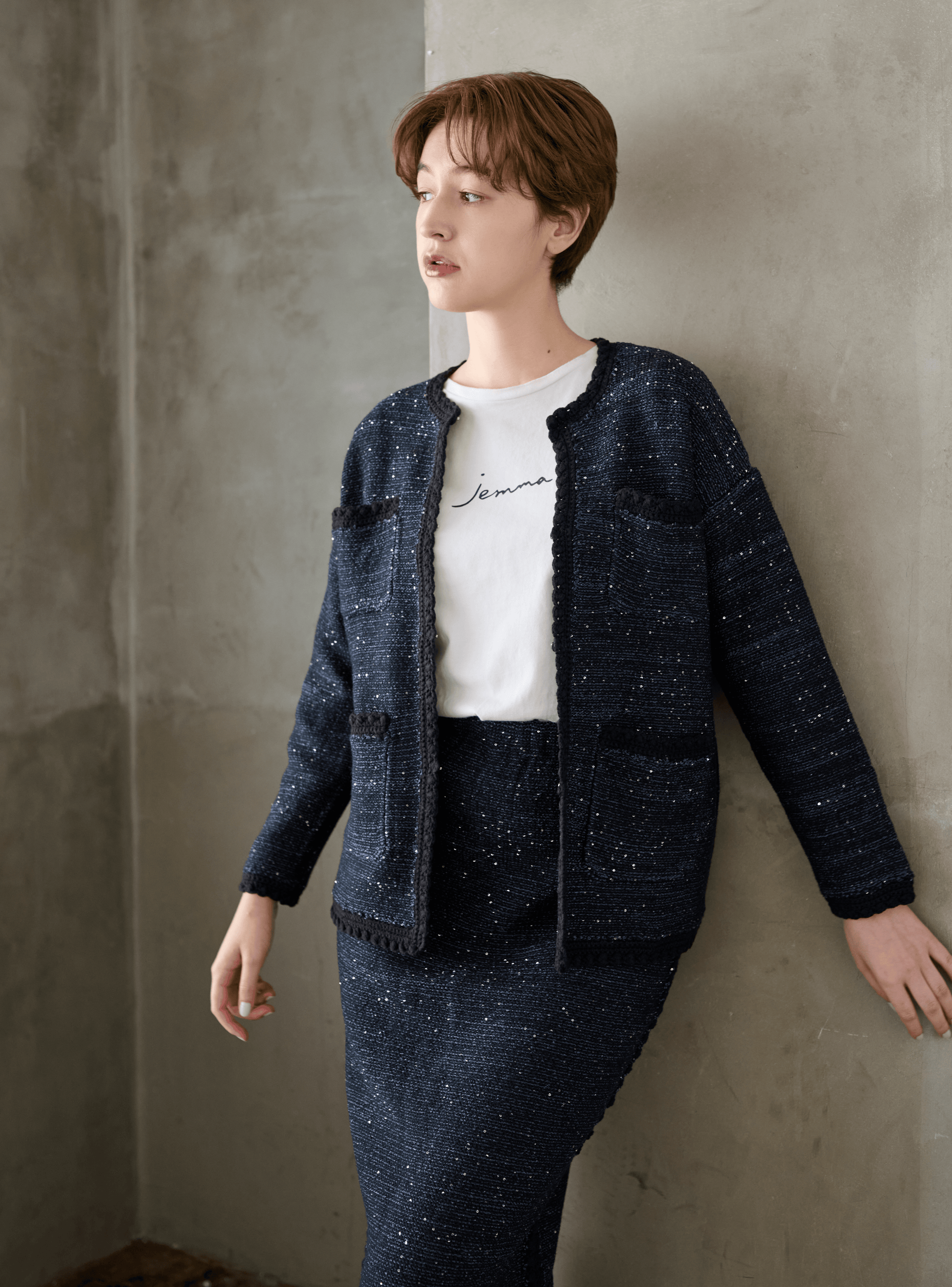 スパンコールヤーンをベースに、ストレート糸を組み合わせてツイード風に編み上げたニットは、程よい厚みと伸縮性があり気軽に羽織れるまだ肌寒い時期に大活躍な素材感です。