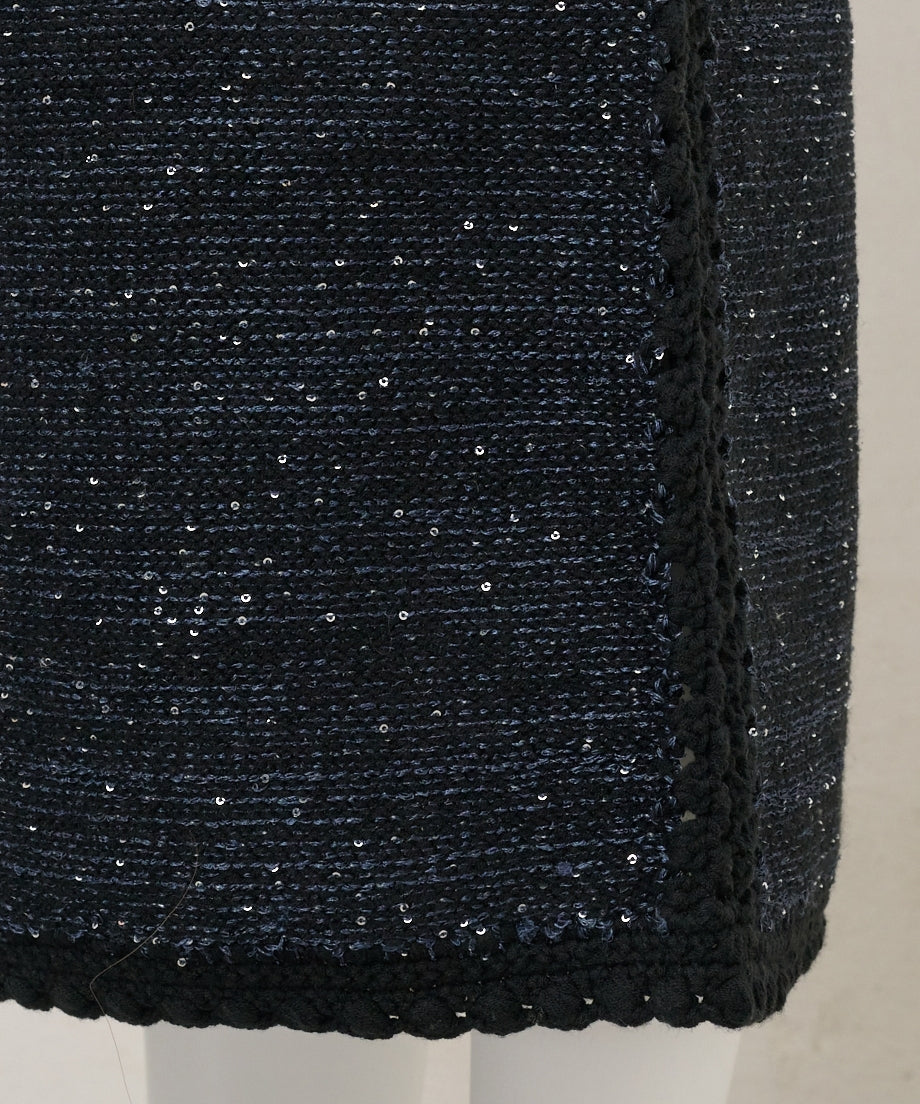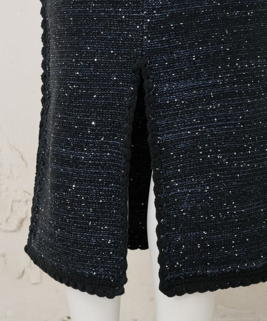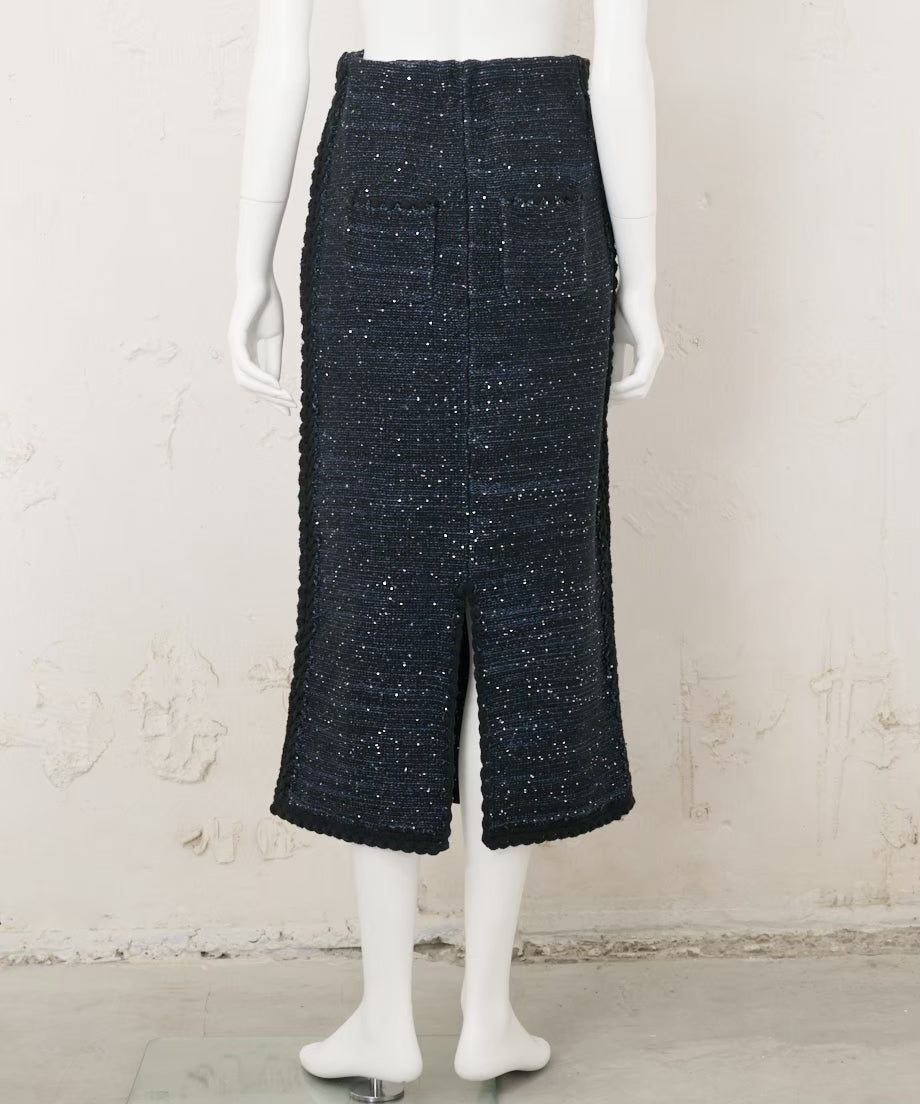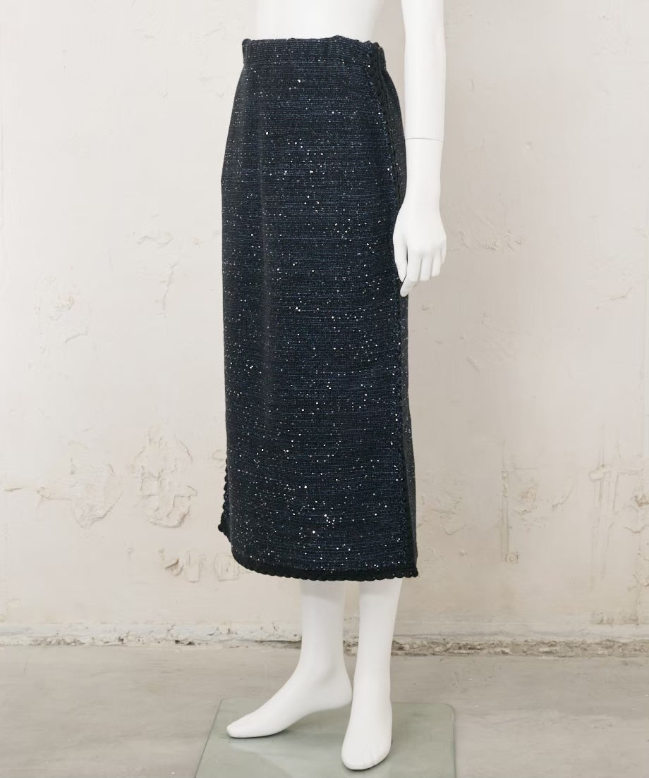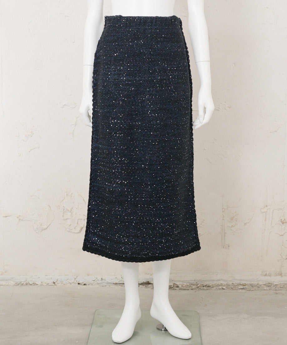 スパンコールヤーンをストレート糸に引き揃え、ツイード風に表情を持たせたスカート。