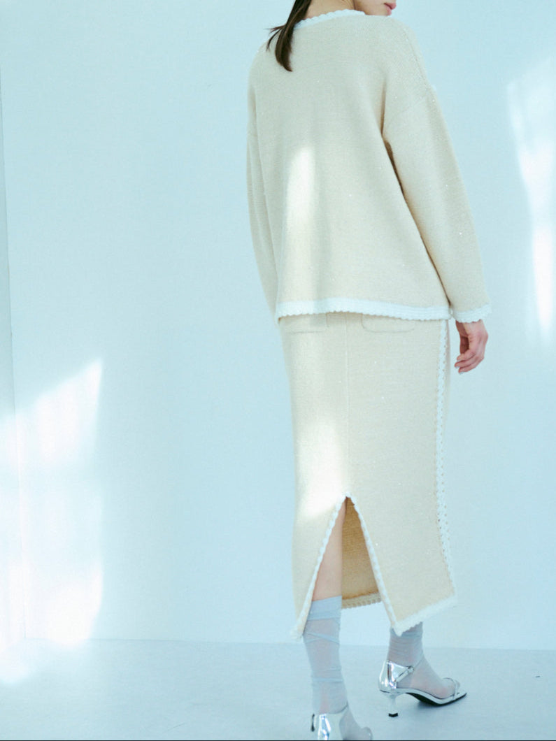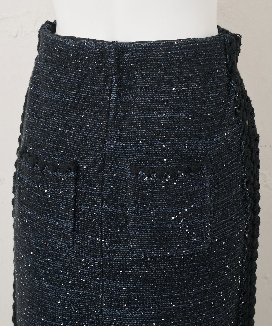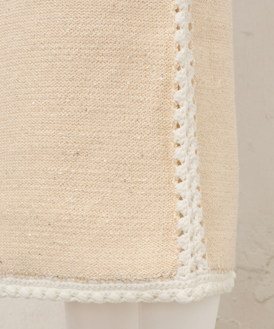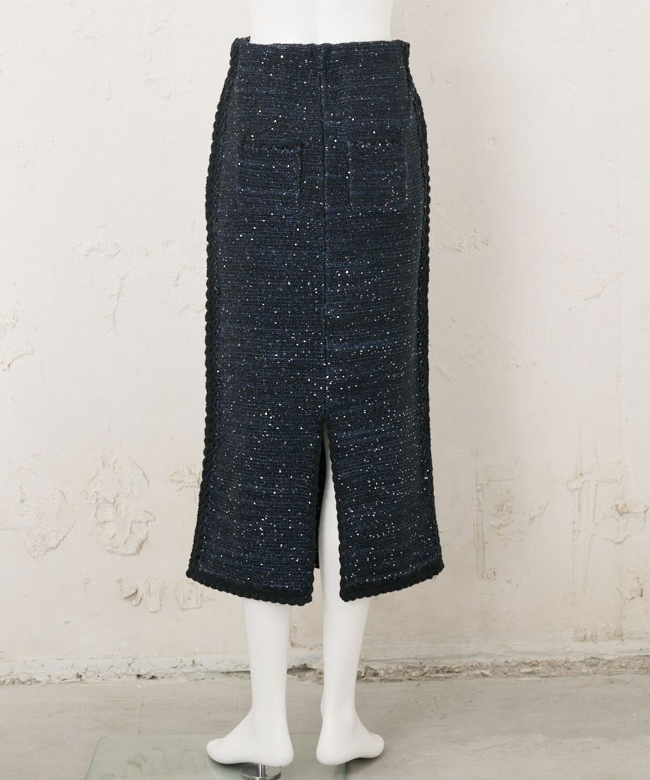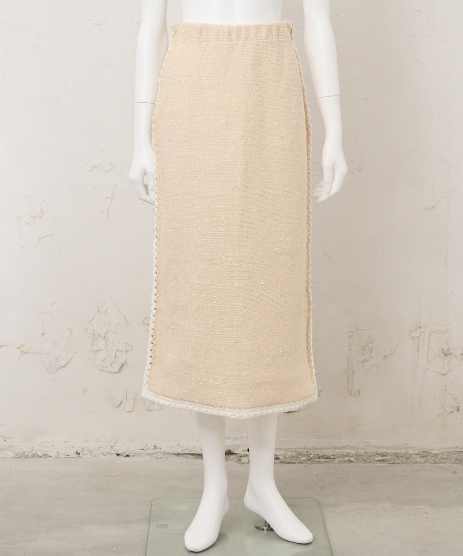 スパンコールヤーンをストレート糸に引き揃え、ツイード風に表情を持たせたスカート。