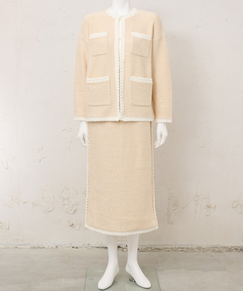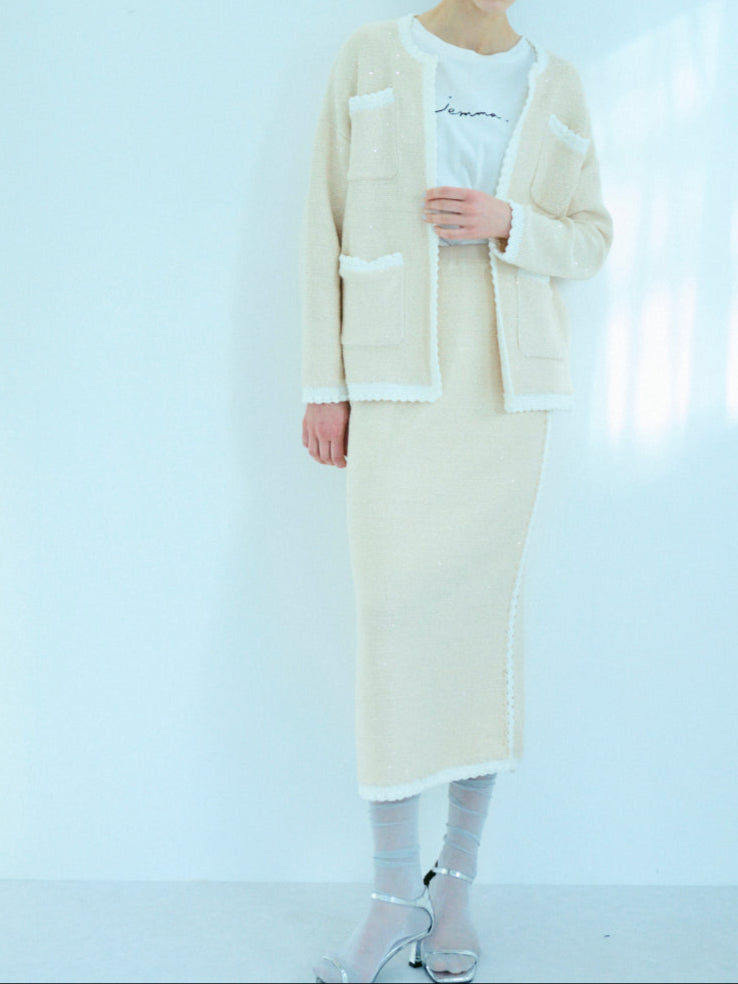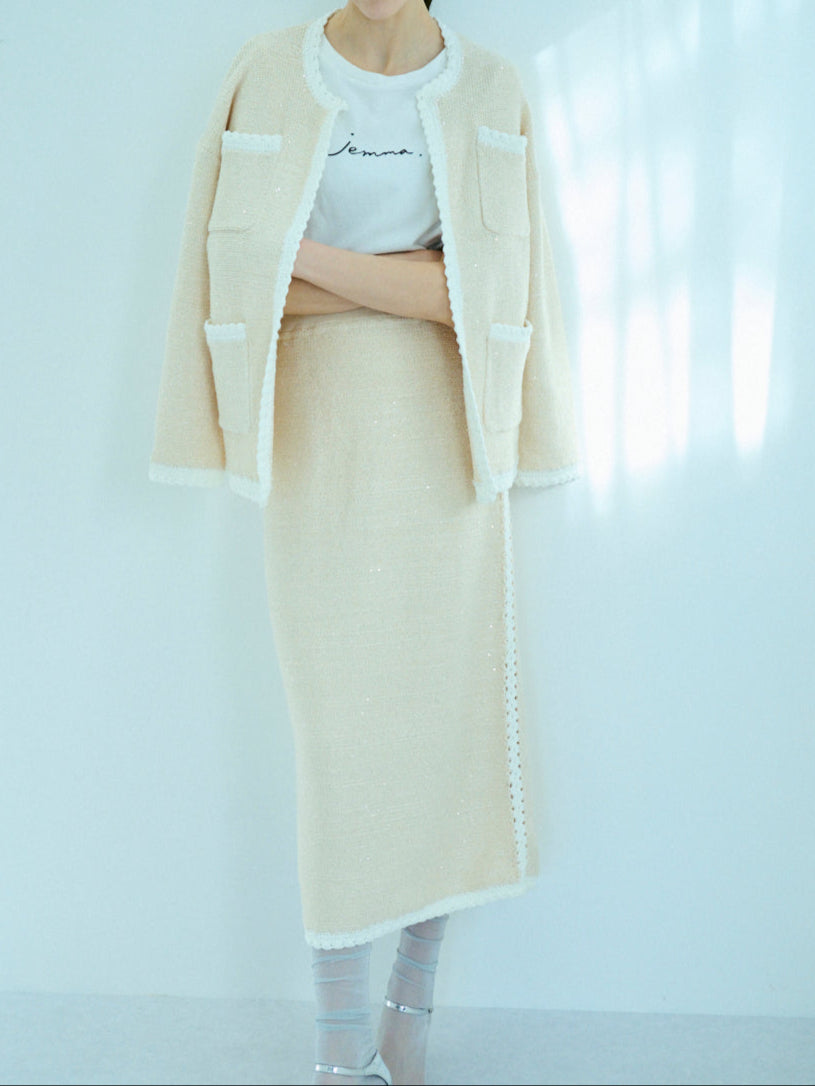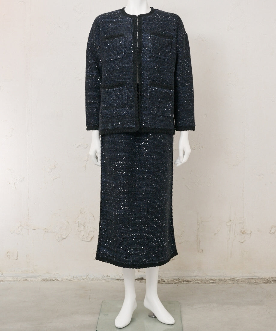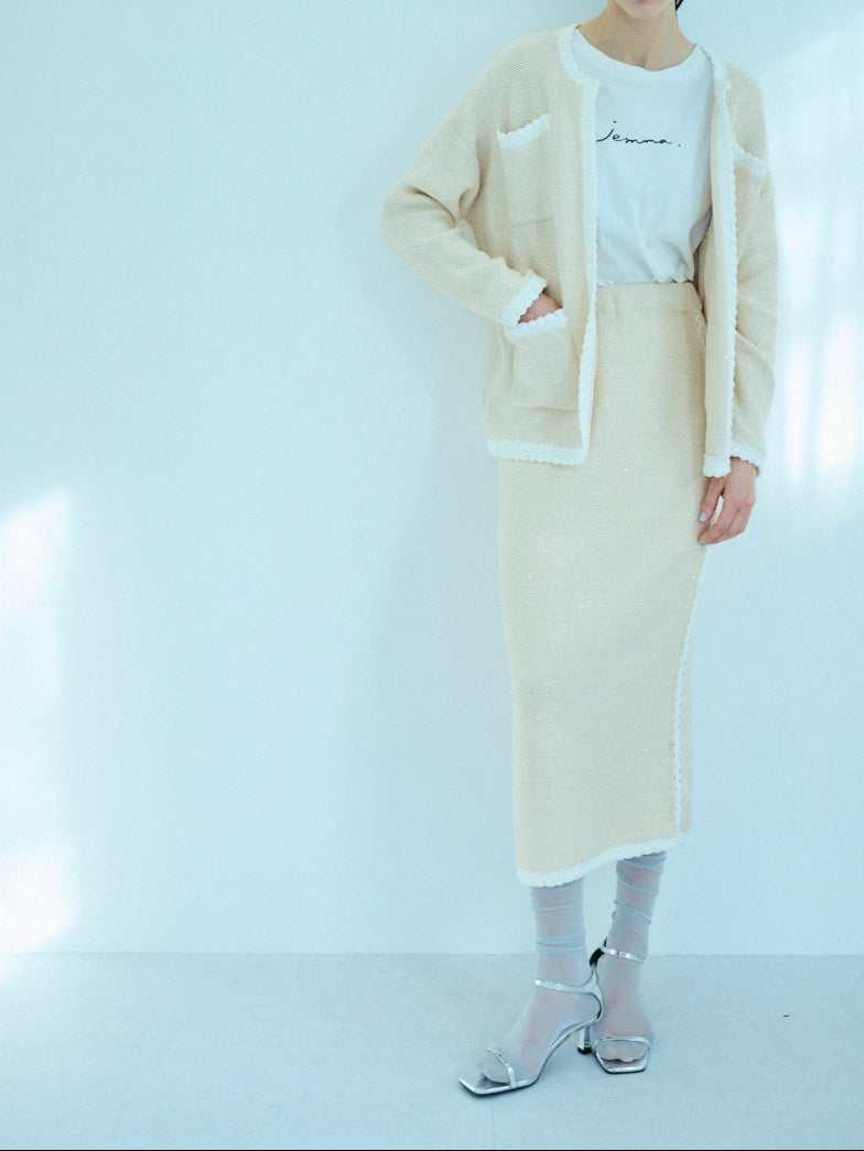 スパンコールヤーンをストレート糸に引き揃え、ツイード風に表情を持たせたスカート。