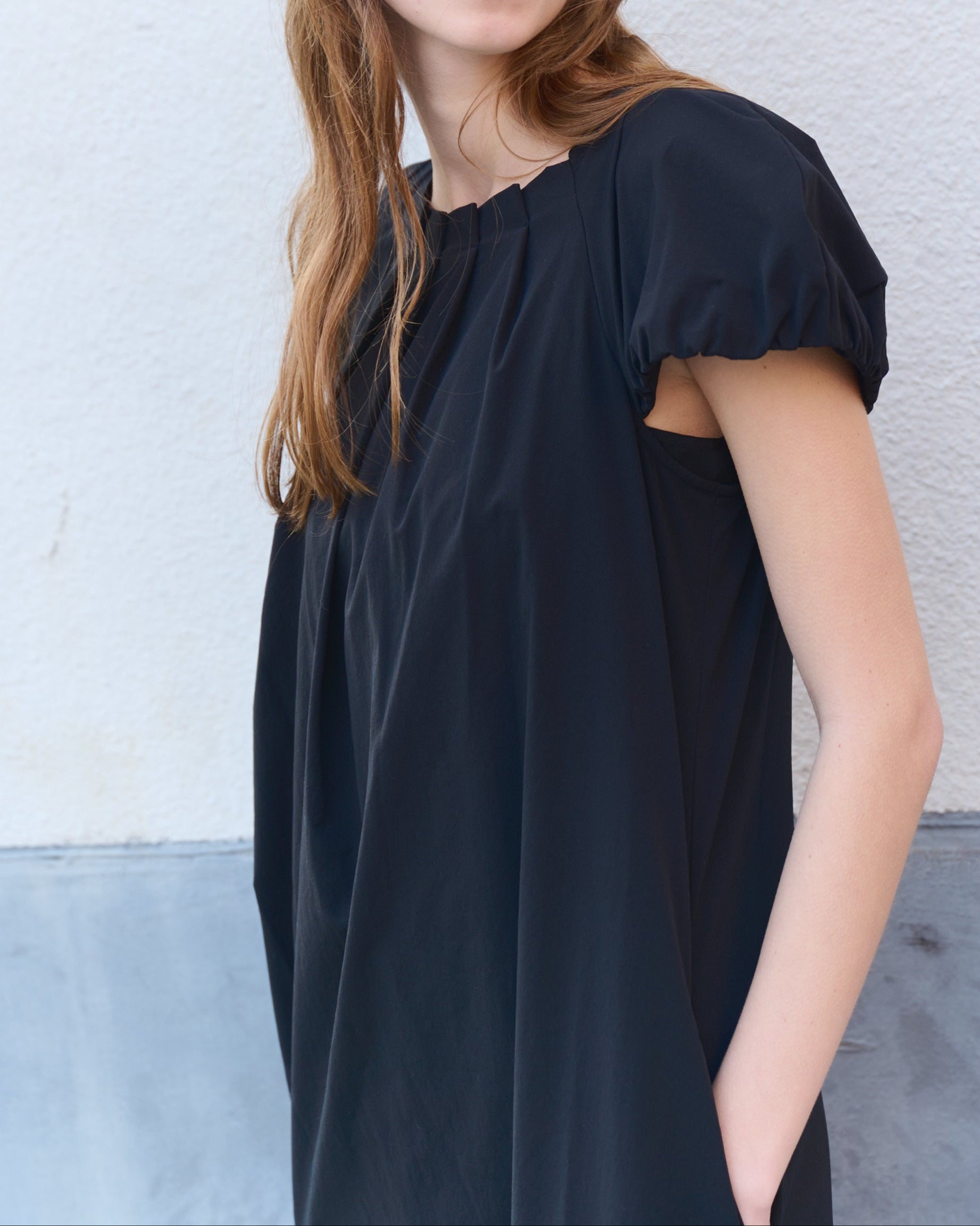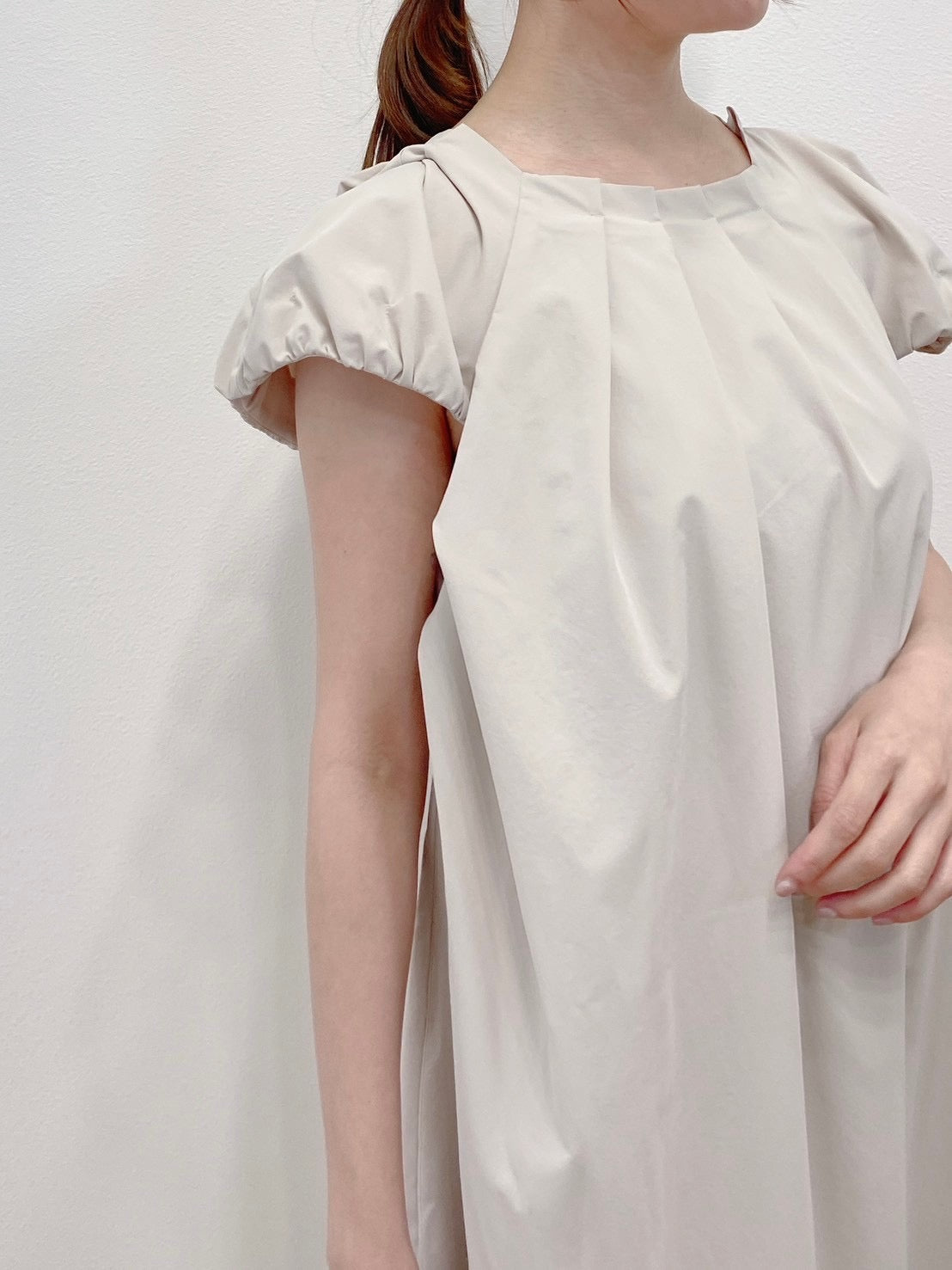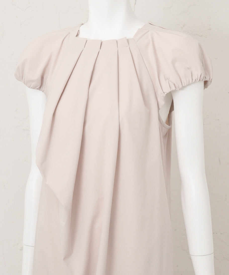 衿ぐりにランダムにタックを入れ、二の腕をカバーしてくれる少し丸みのあるフレンチパフスリーブに仕上げました。