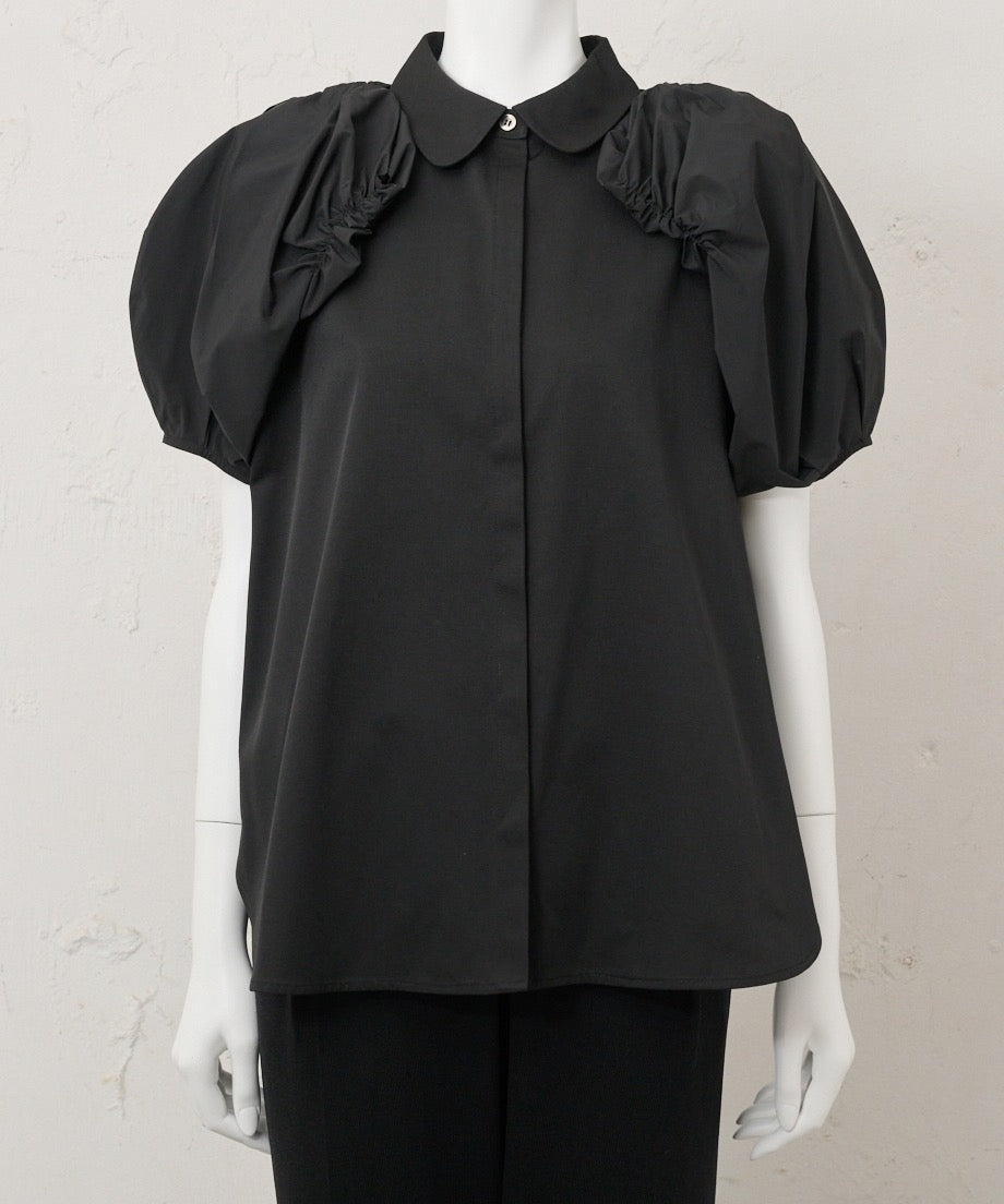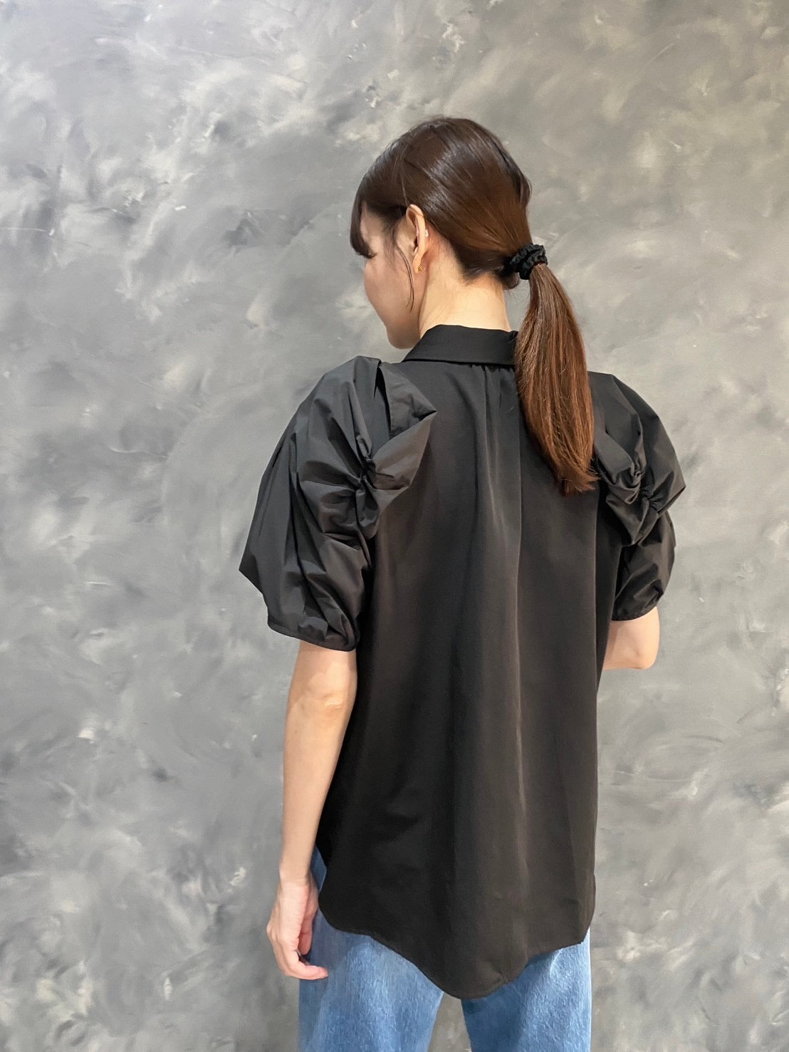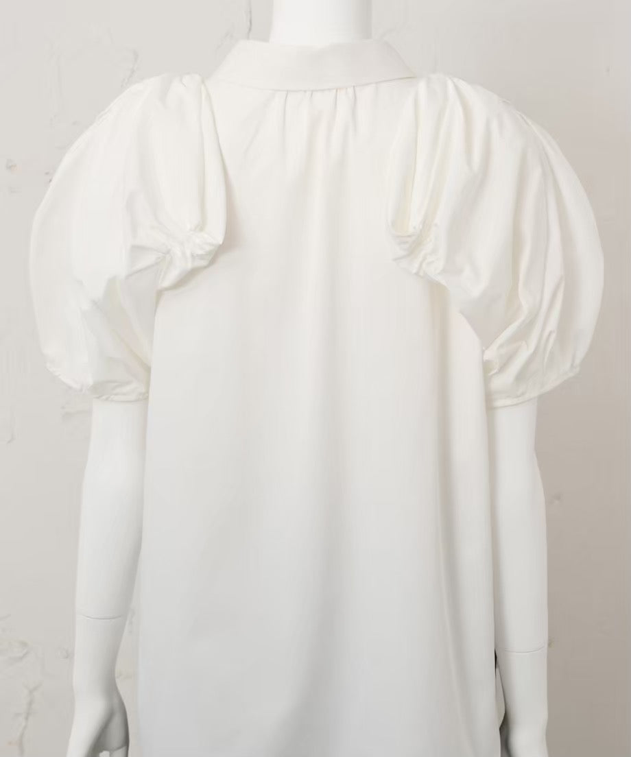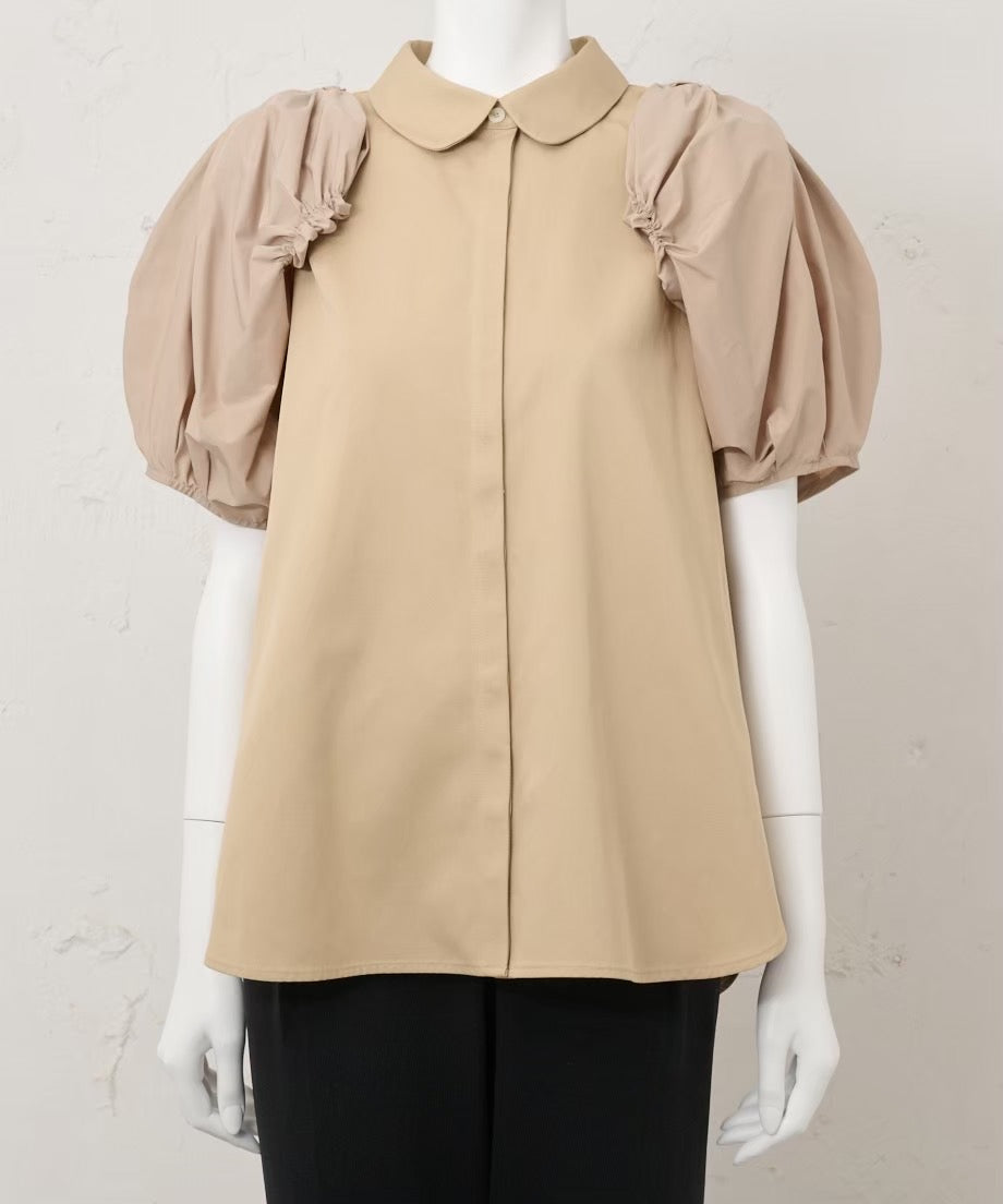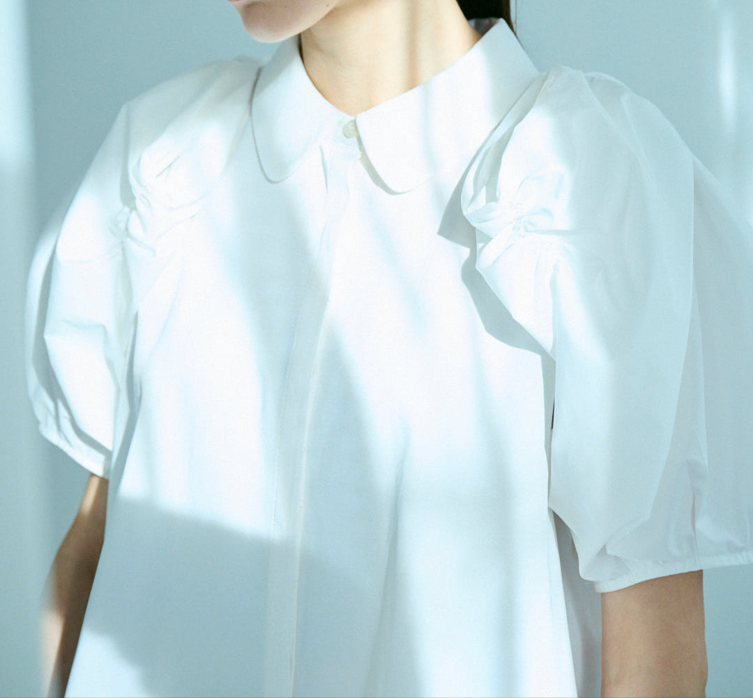 袖にハリ感のあるタフタ生地を使用しドレープ、ギャザーの入った立体的な袖を表現しています。身頃にはシワになりにくい綿ポリエステルの生地を使用しています。