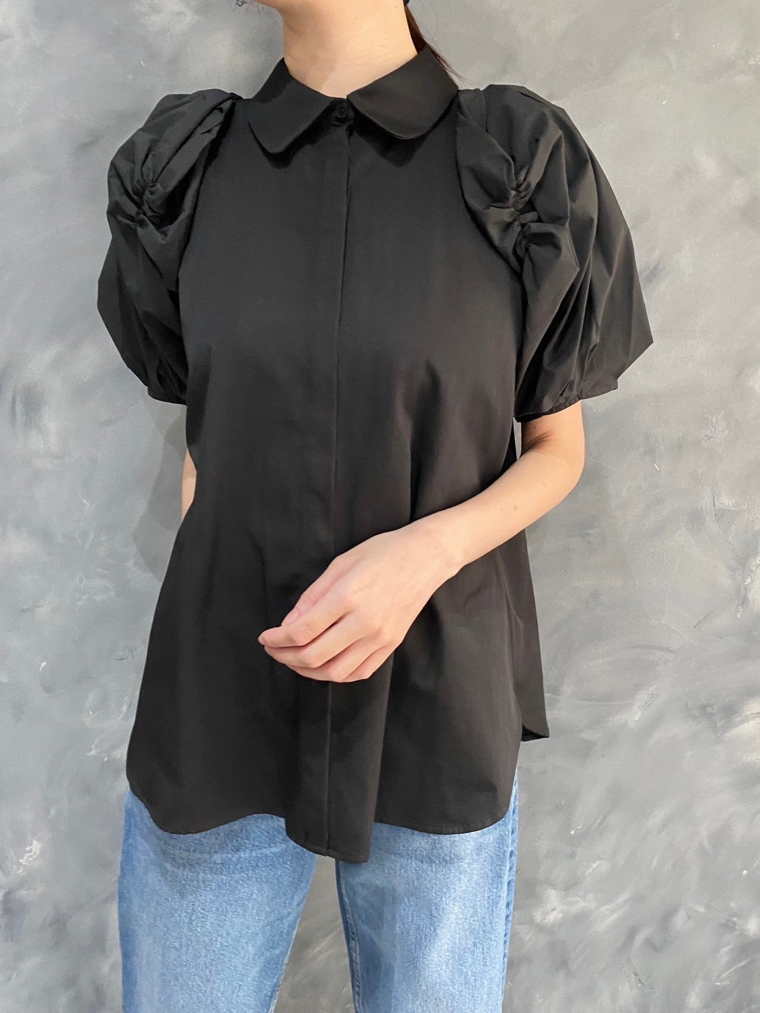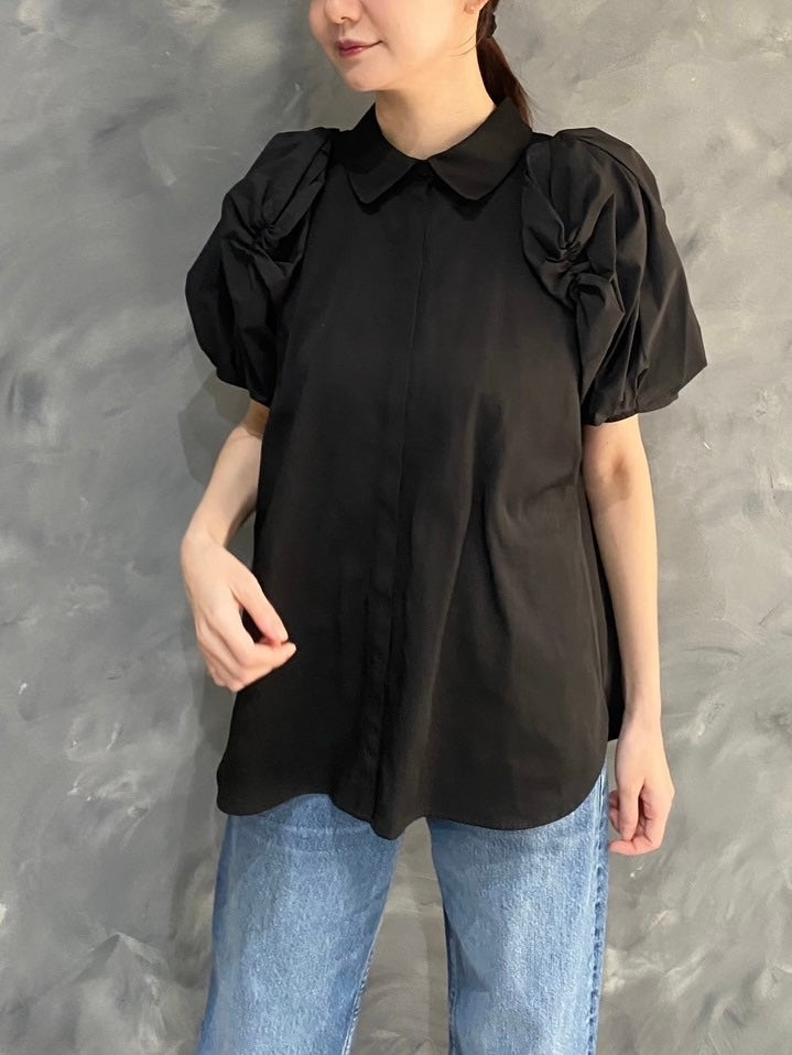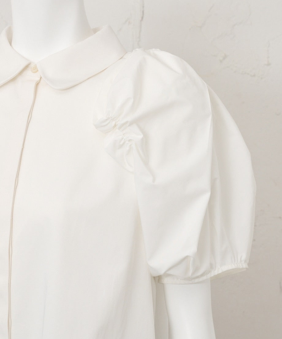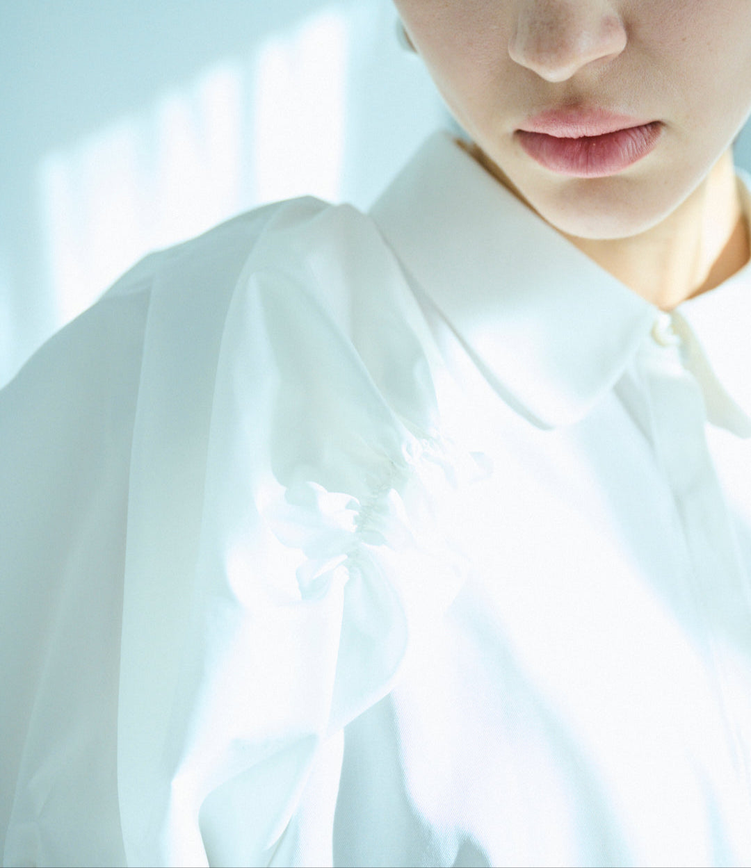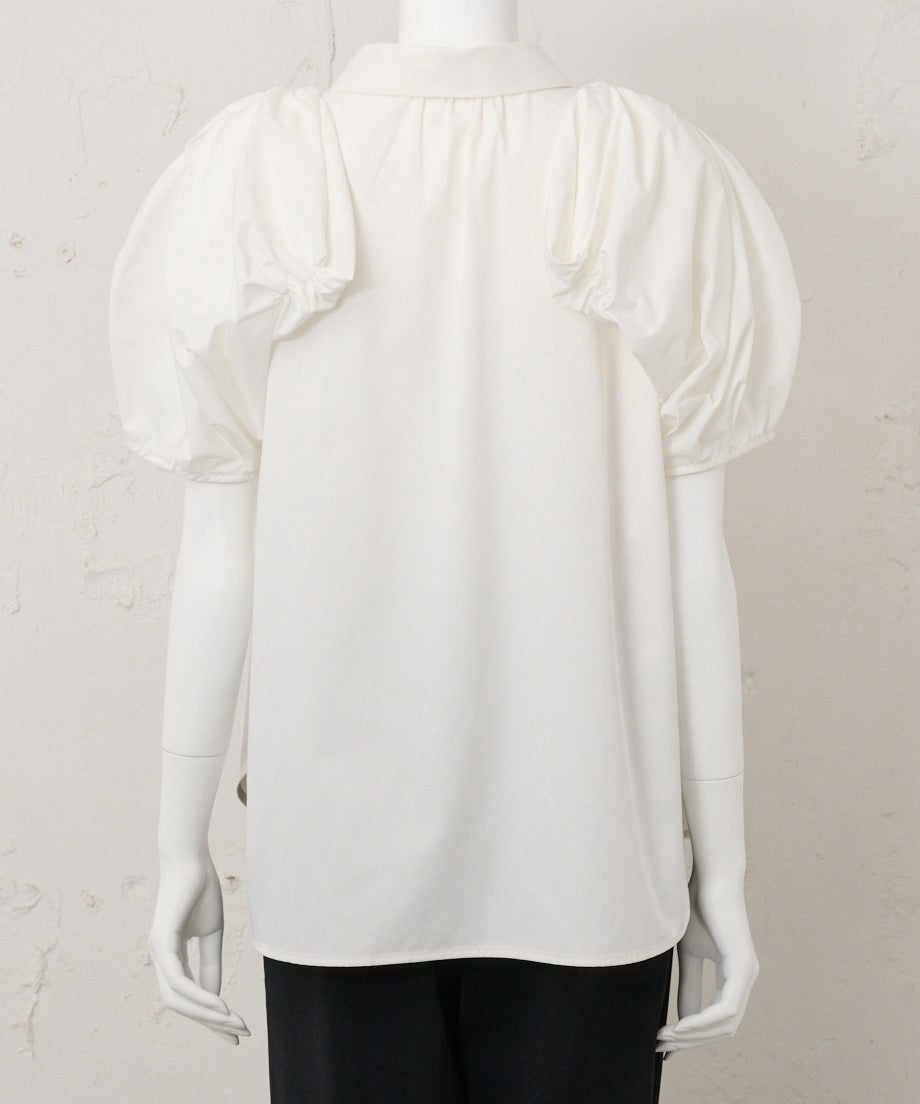 袖にハリ感のあるタフタ生地を使用しドレープ、ギャザーの入った立体的な袖を表現しています。身頃にはシワになりにくい綿ポリエステルの生地を使用しています。
