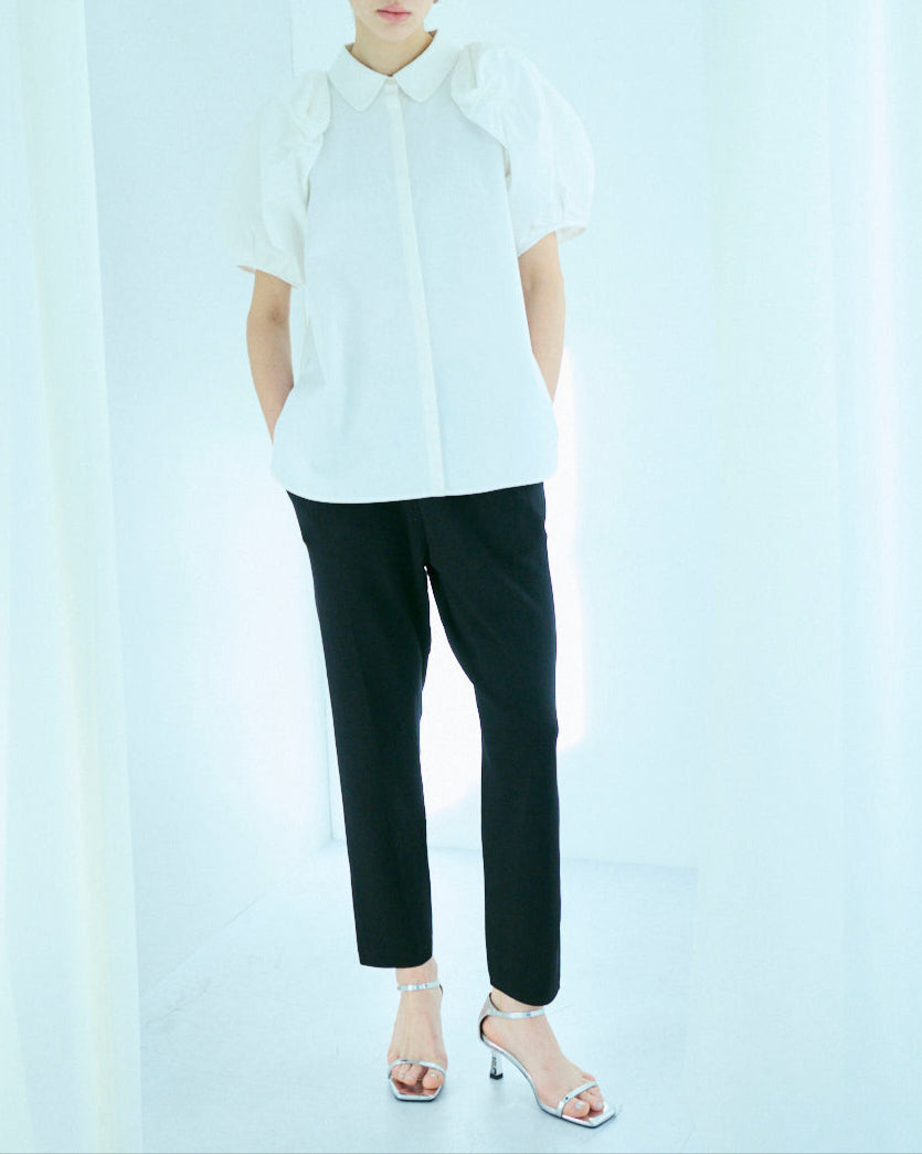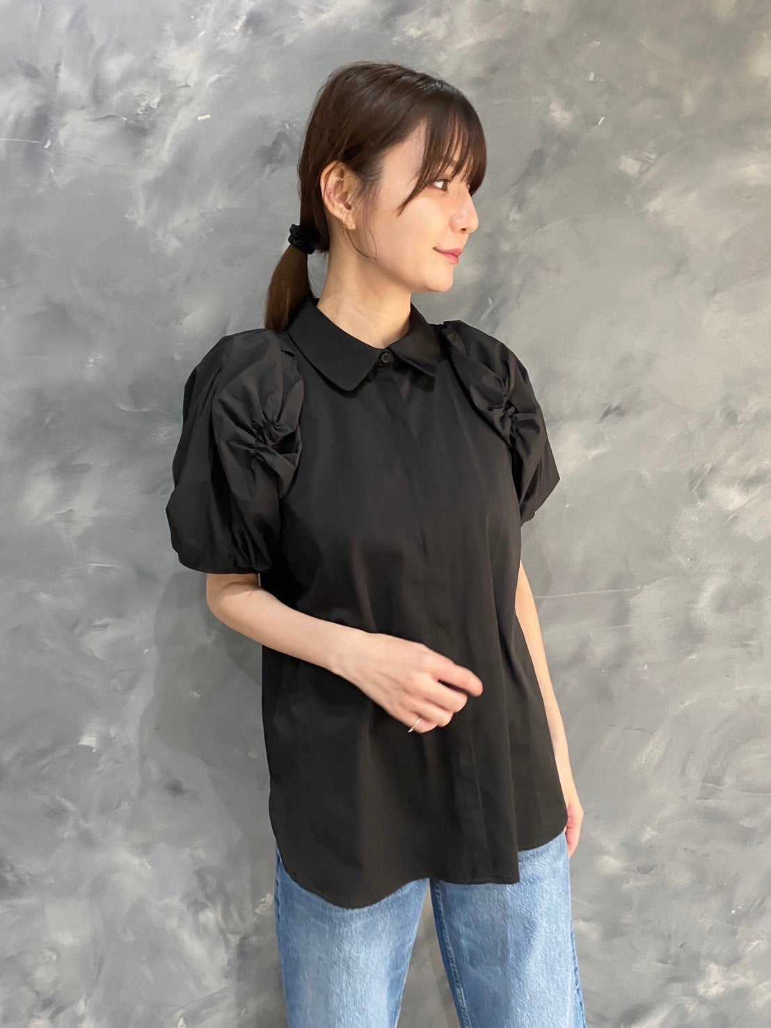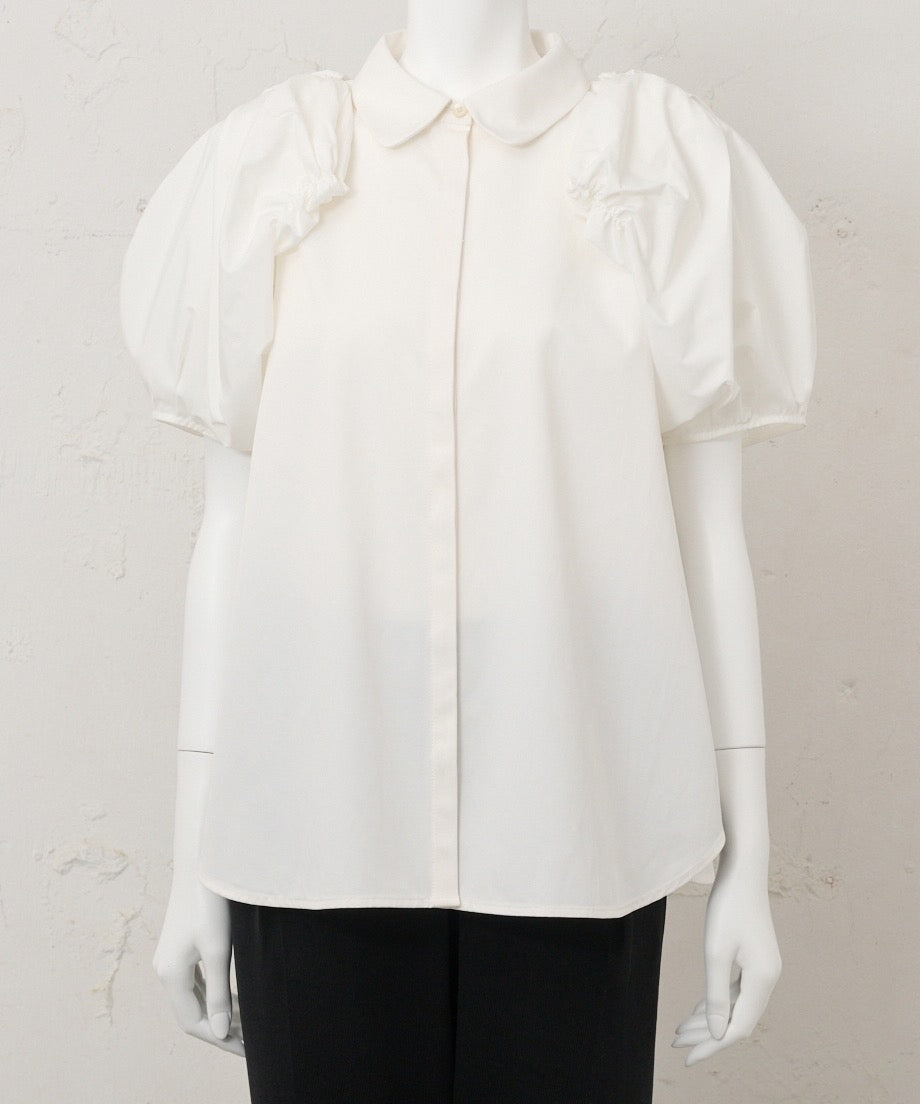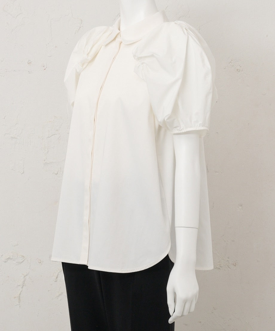 袖にハリ感のあるタフタ生地を使用しドレープ、ギャザーの入った立体的な袖を表現しています。身頃にはシワになりにくい綿ポリエステルの生地を使用しています。