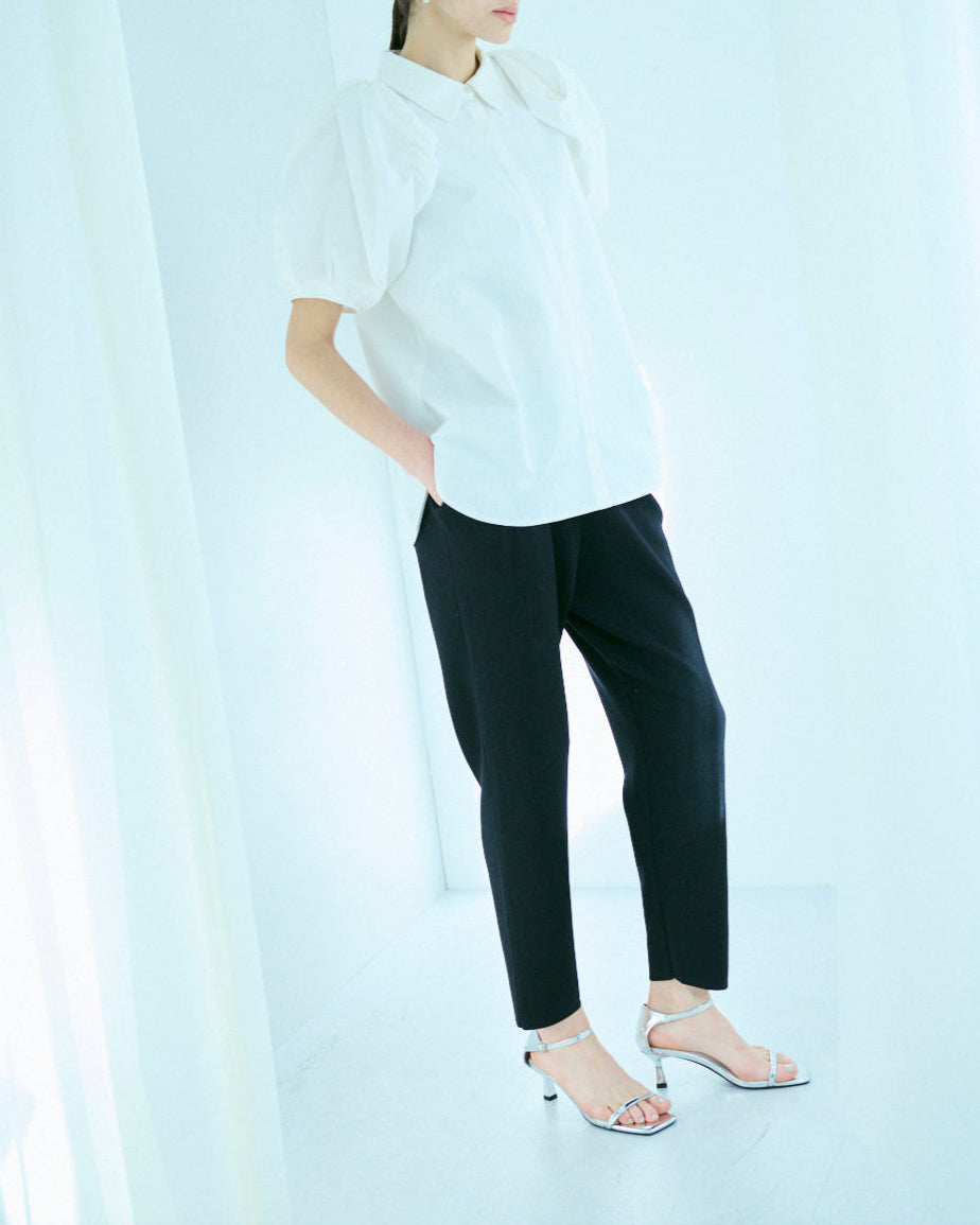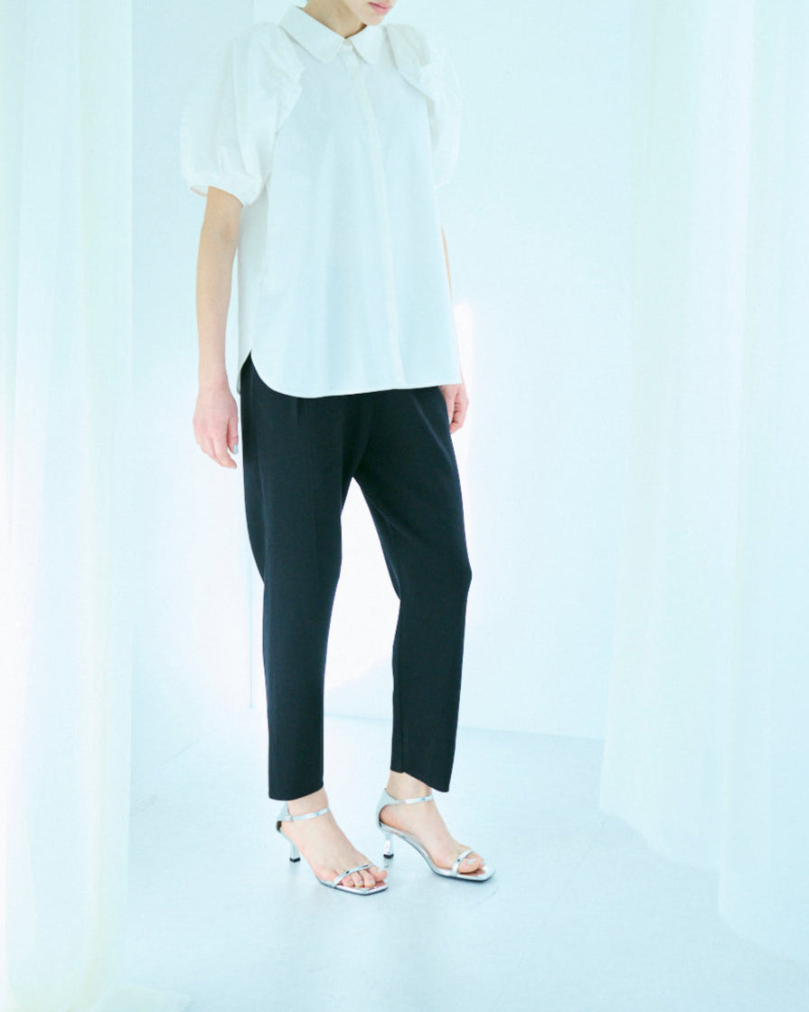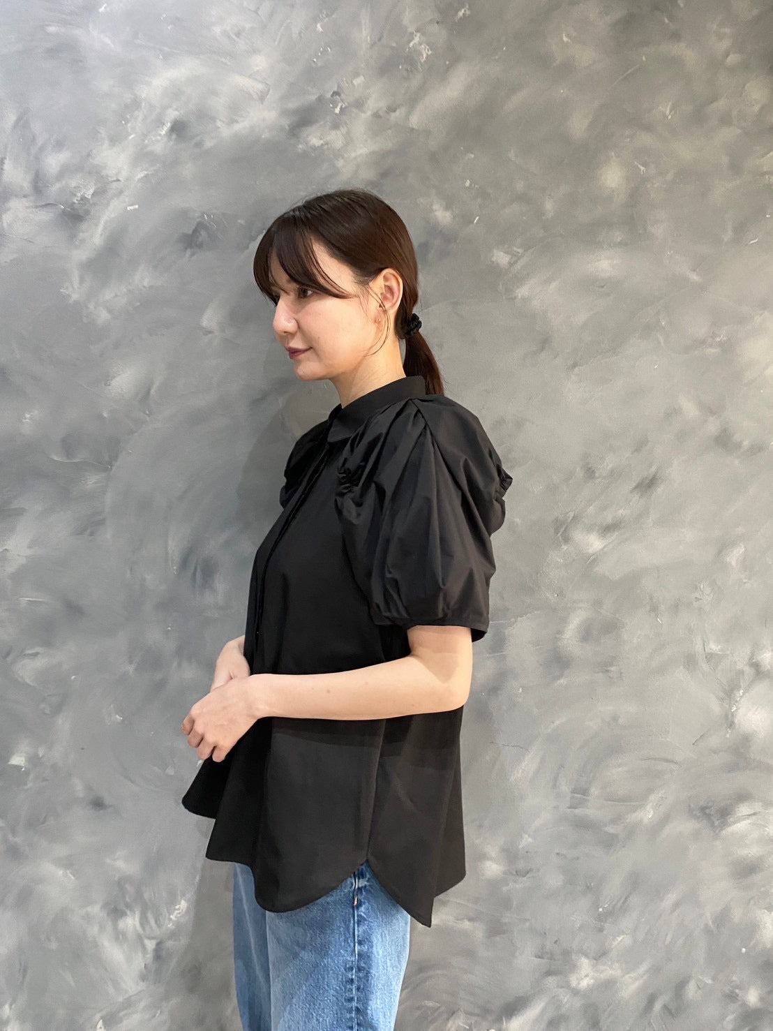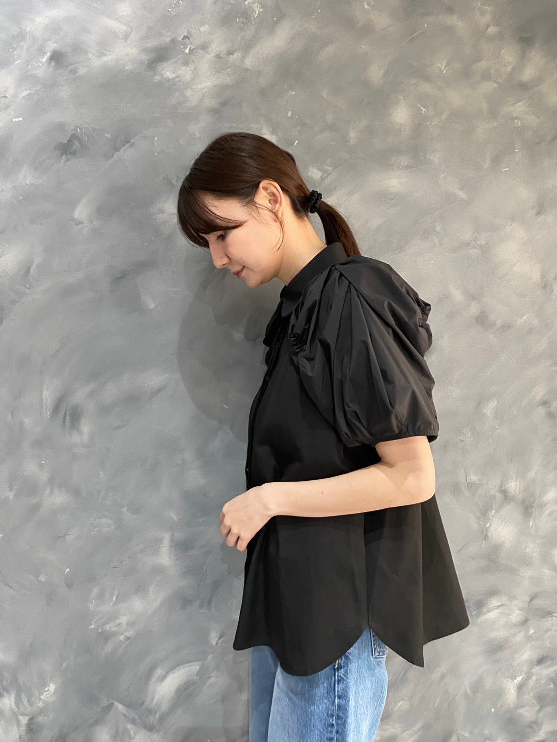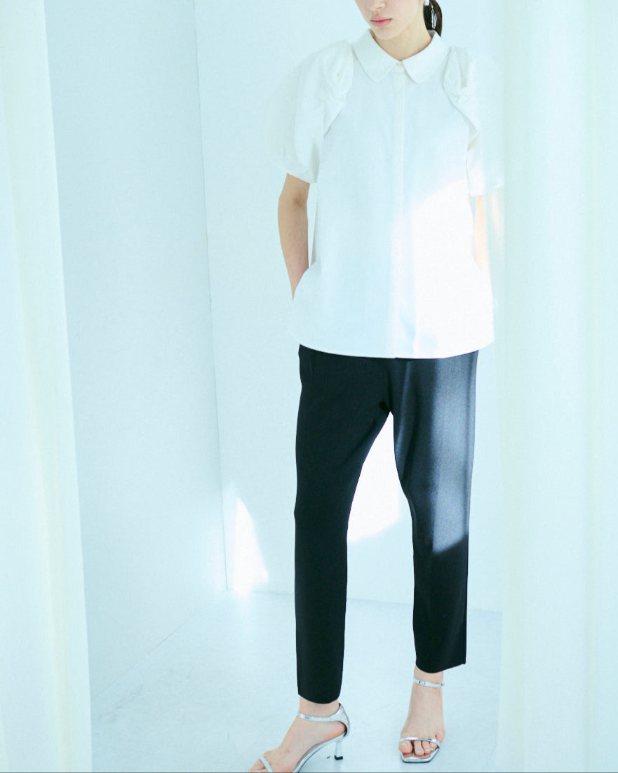 袖にハリ感のあるタフタ生地を使用しドレープ、ギャザーの入った立体的な袖を表現しています。身頃にはシワになりにくい綿ポリエステルの生地を使用しています。