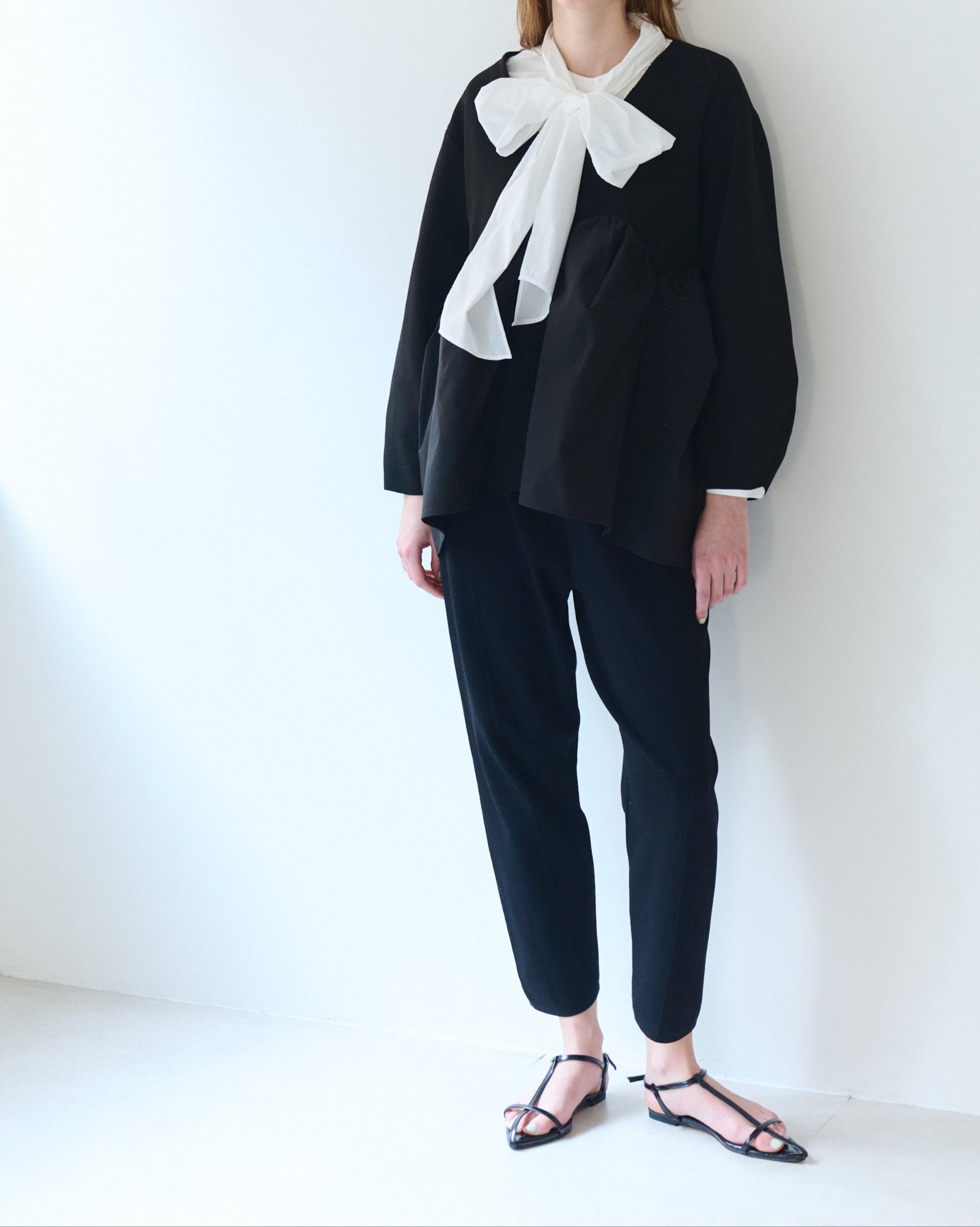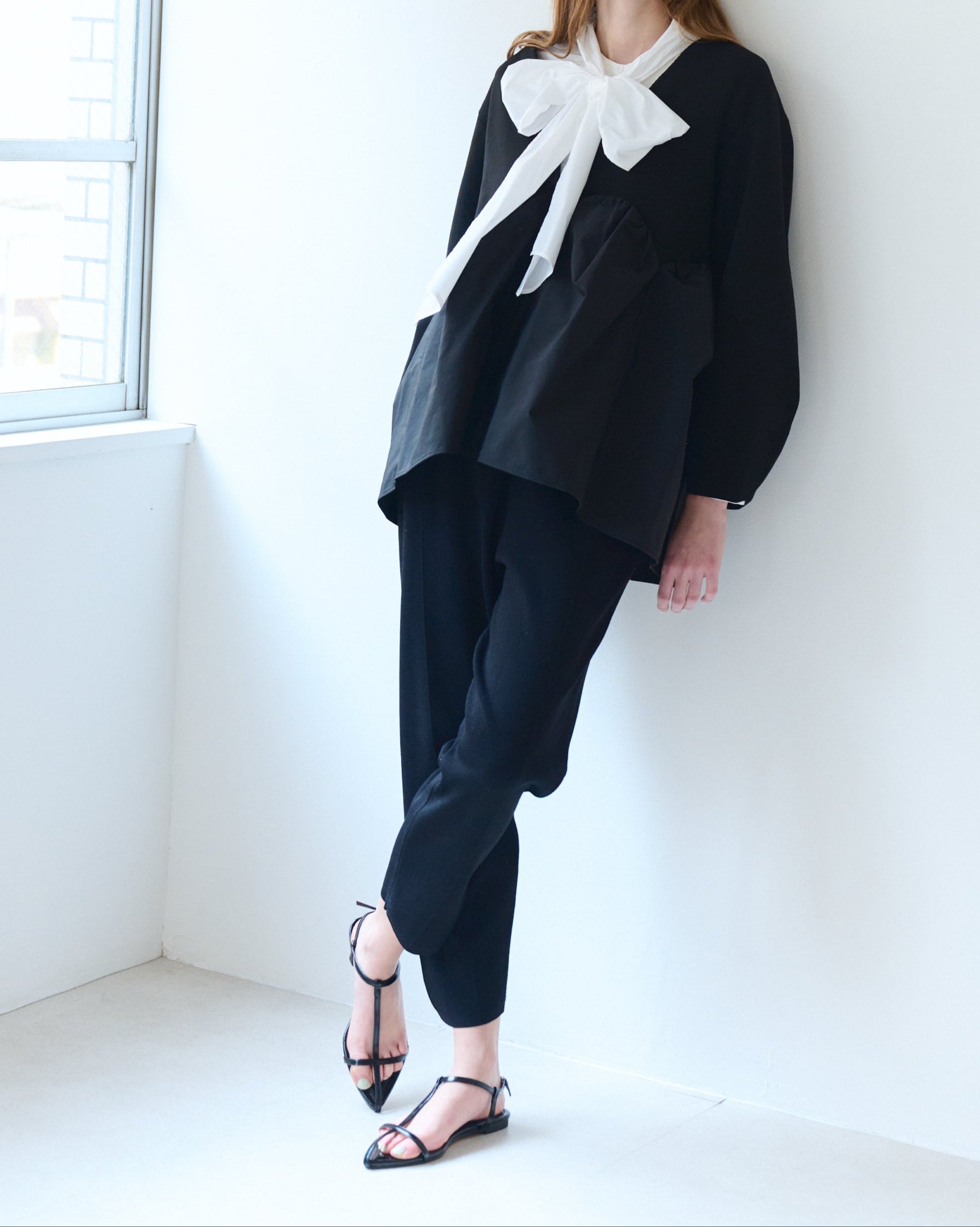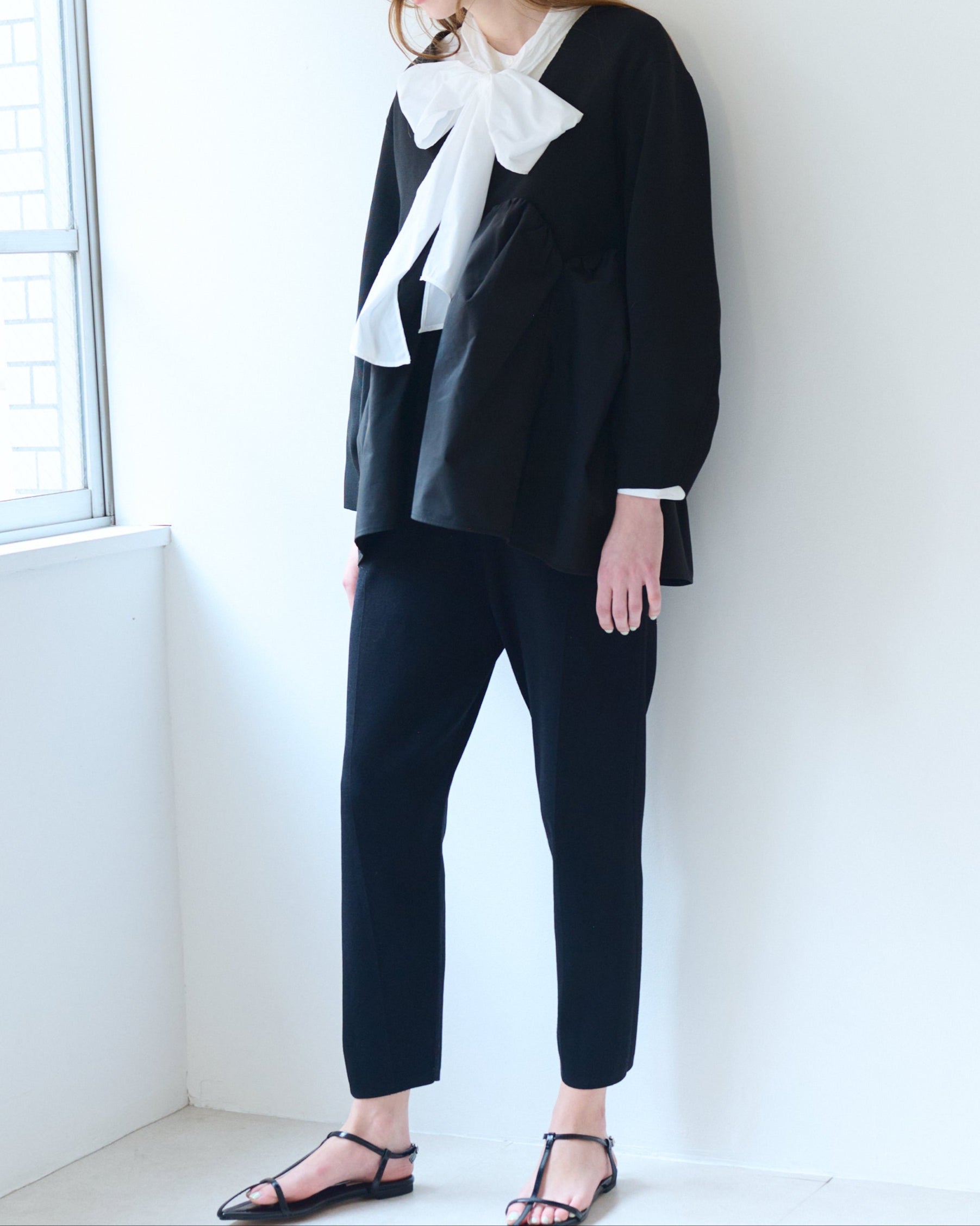 センタープレスの入ったテーパードパンツをニットで表現しました。