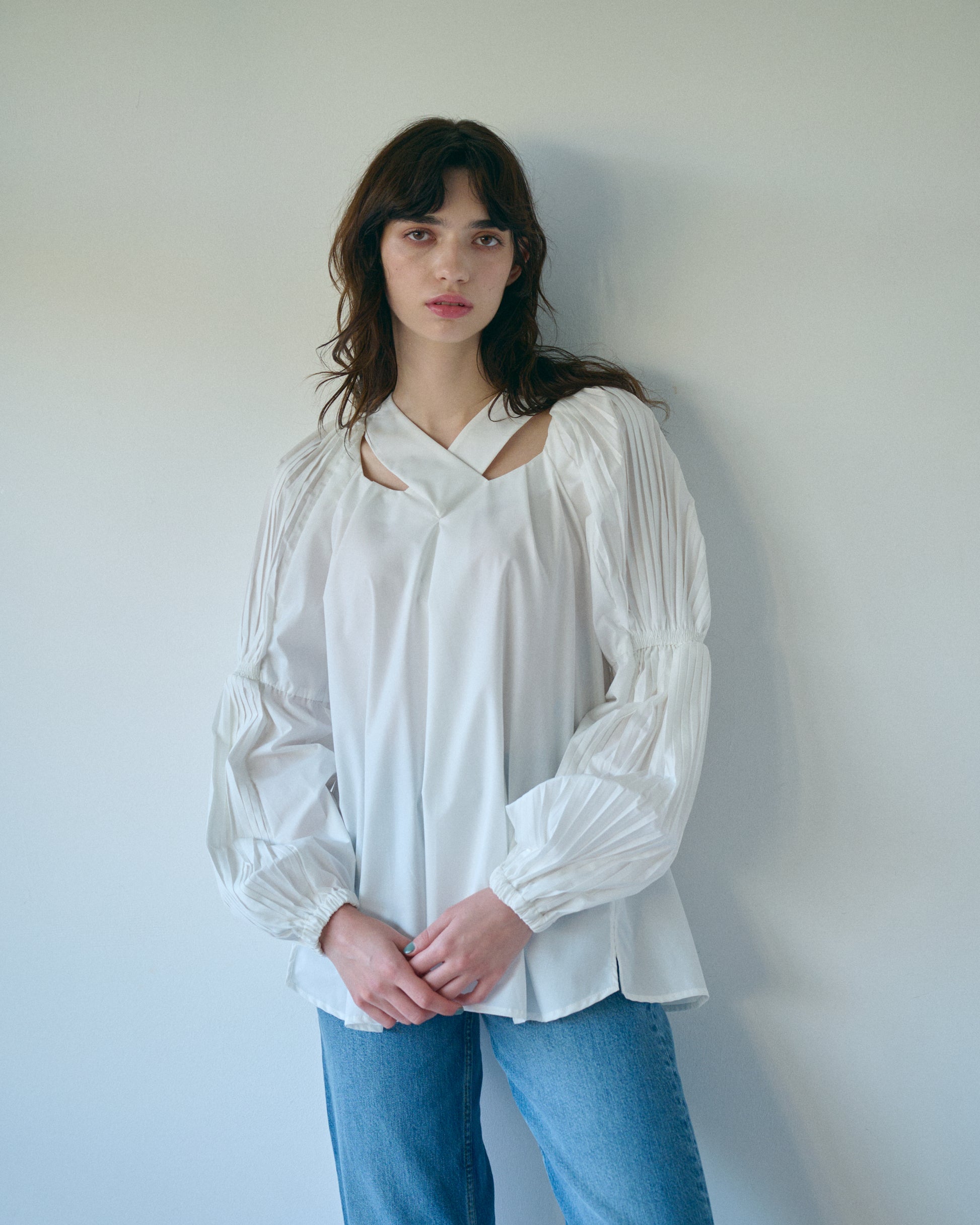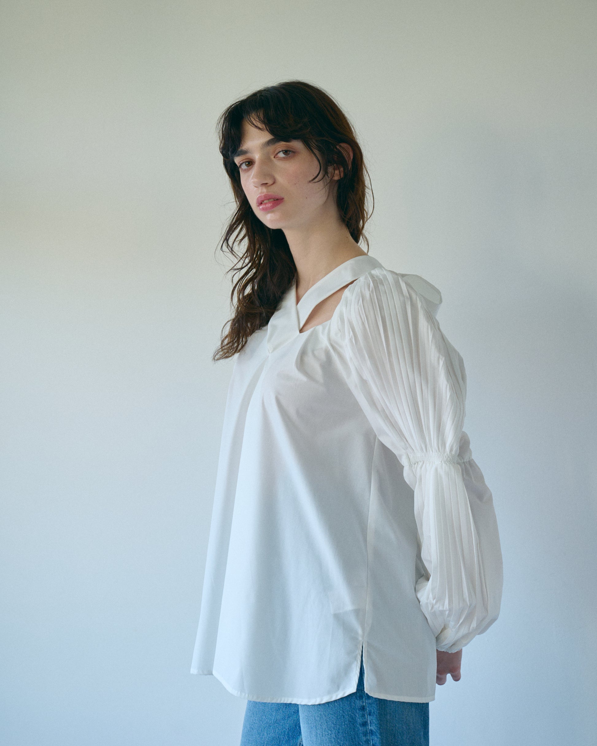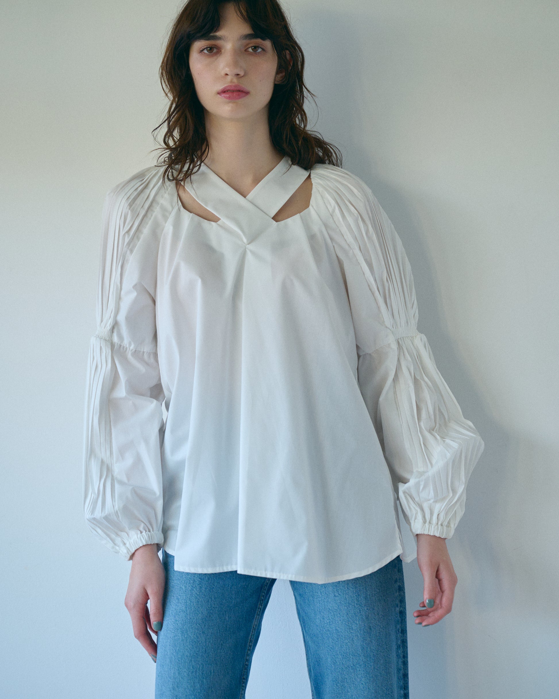 プリーツとシャーリングが入った印象的な袖のデザインや、デコルテがクロスに開いたデザインで、ヘルシーで上品な大人の肌見せと華やかさを演出してくれるブラウス。