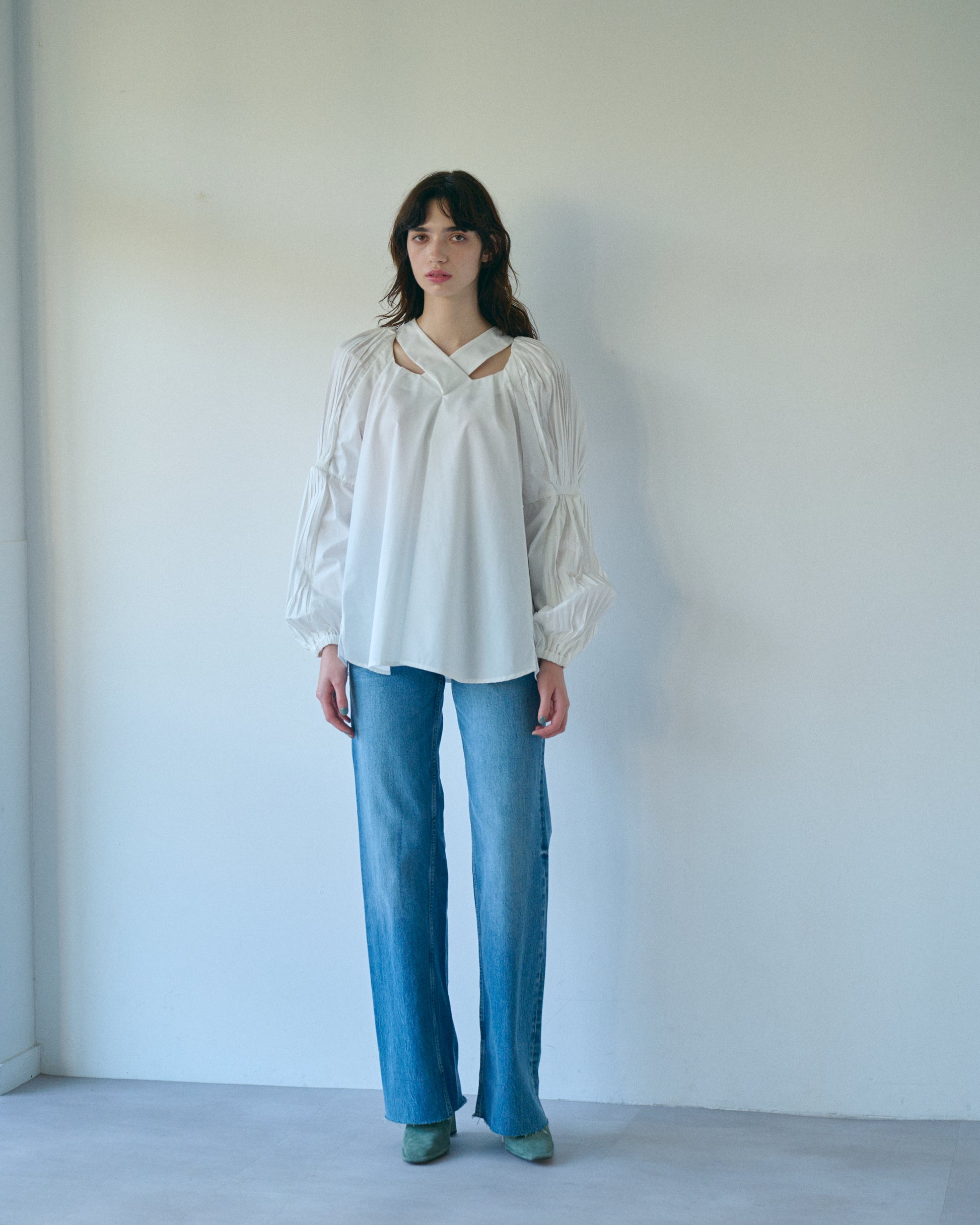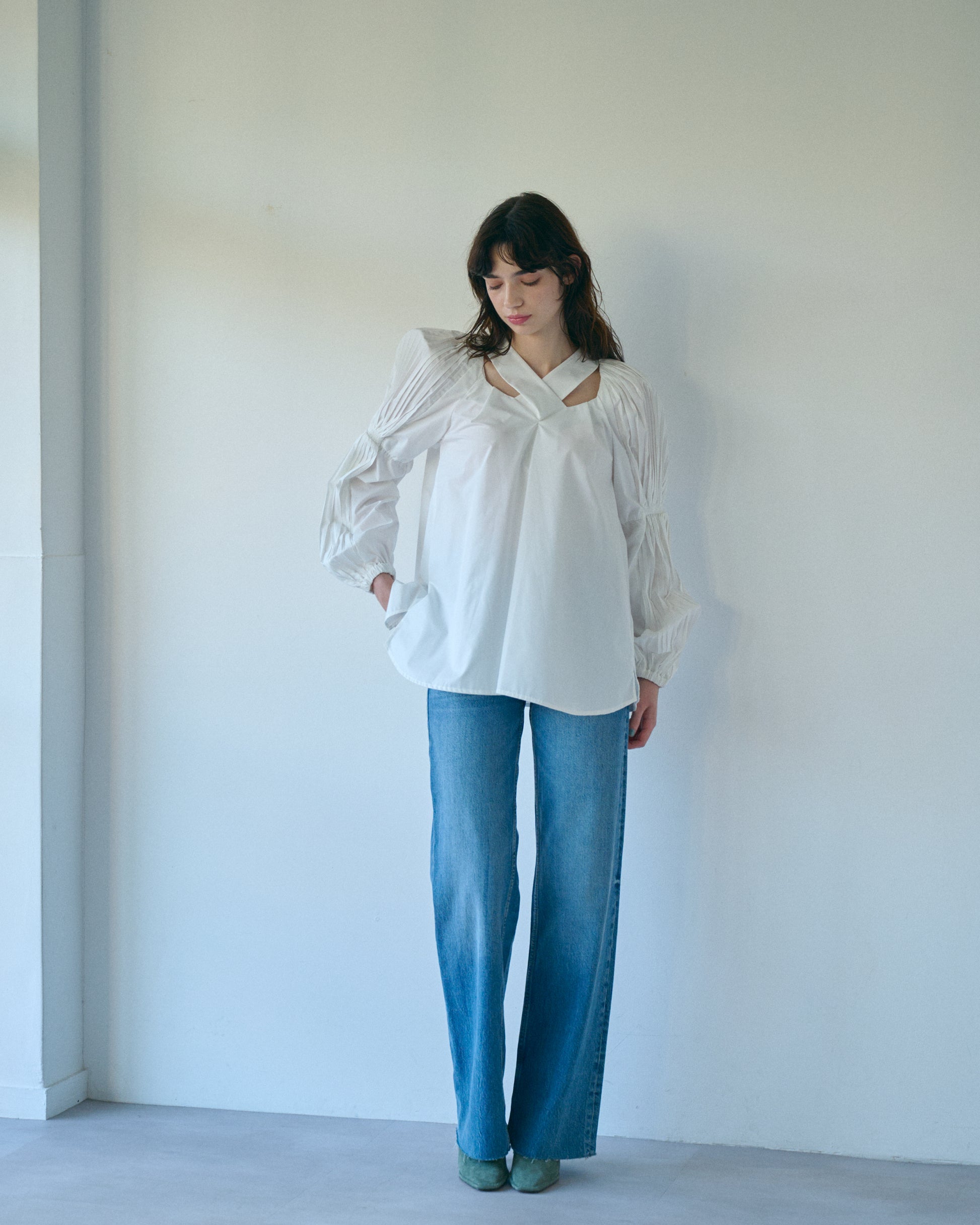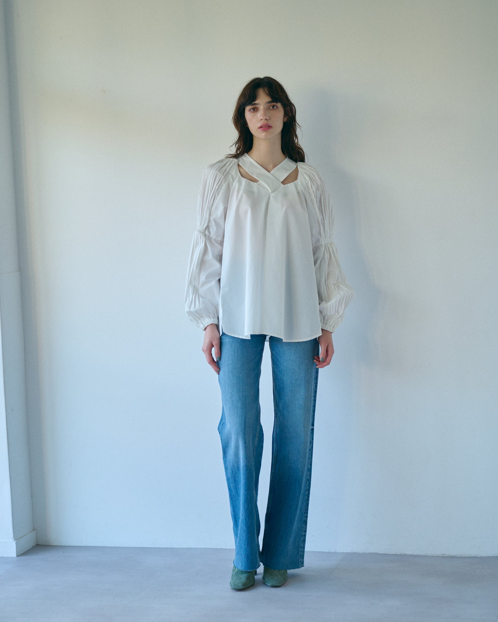 プリーツとシャーリングが入った印象的な袖のデザインや、デコルテがクロスに開いたデザインで、ヘルシーで上品な大人の肌見せと華やかさを演出してくれるブラウス。