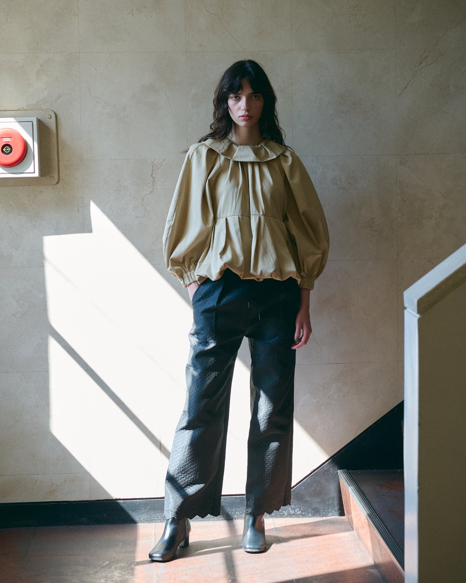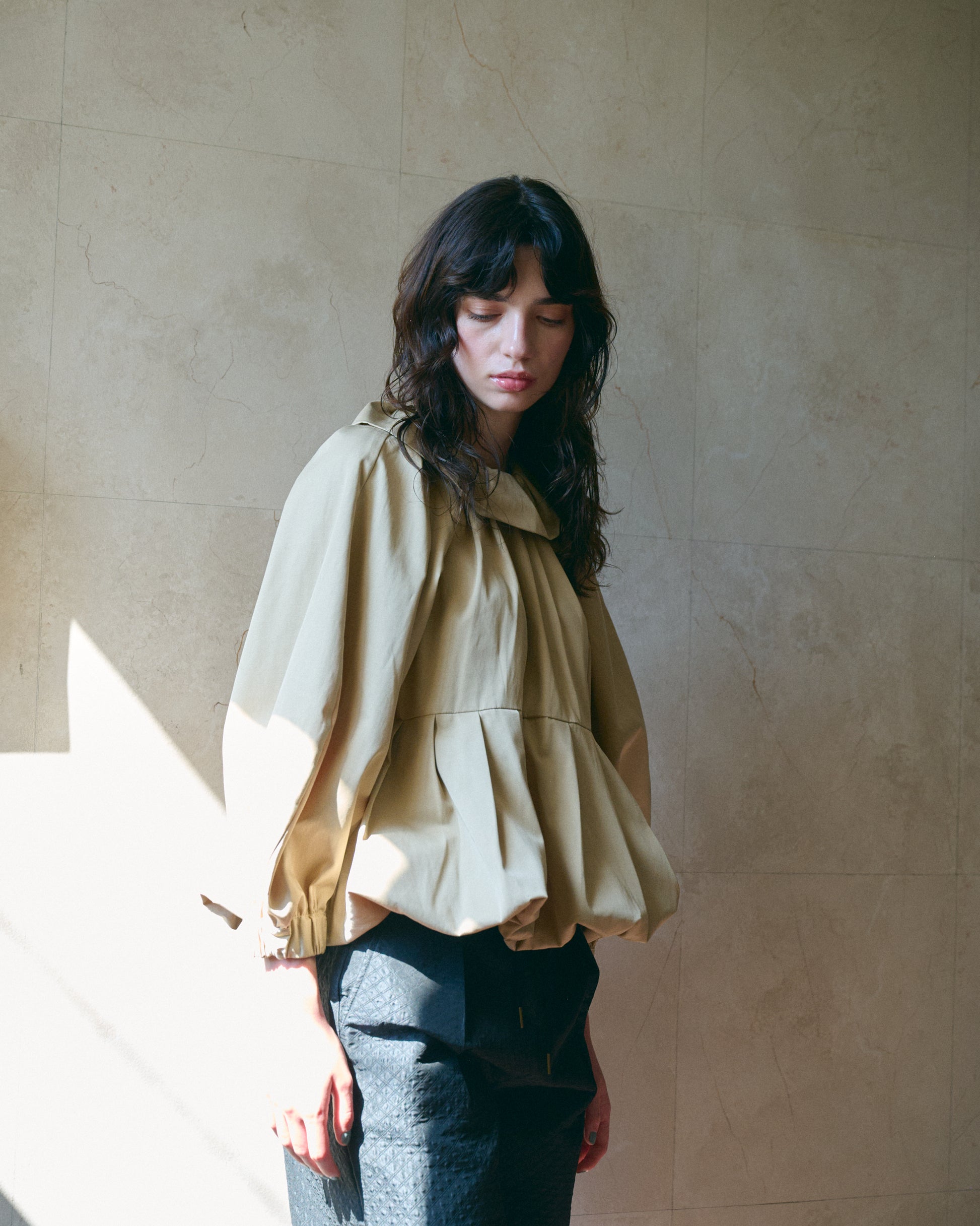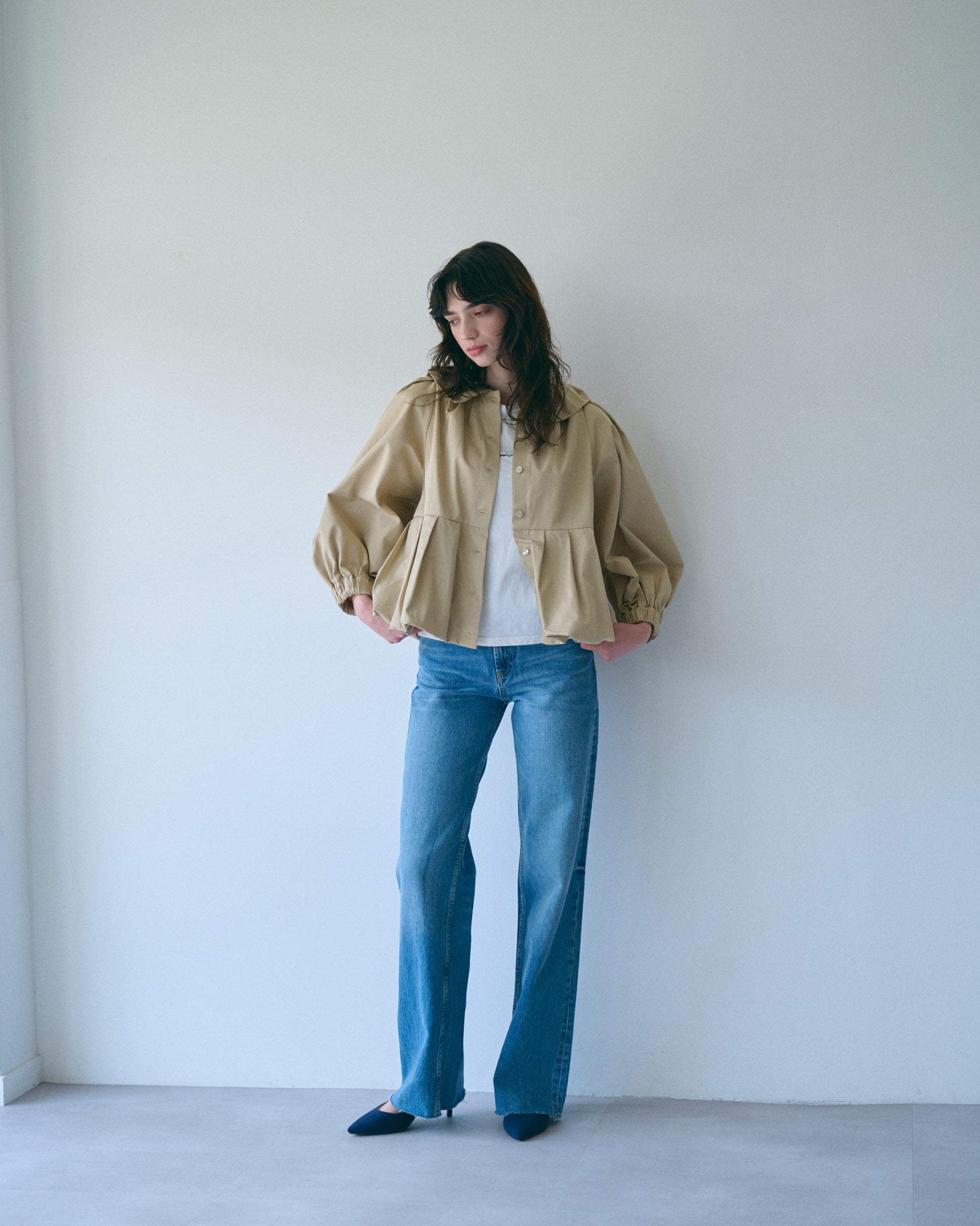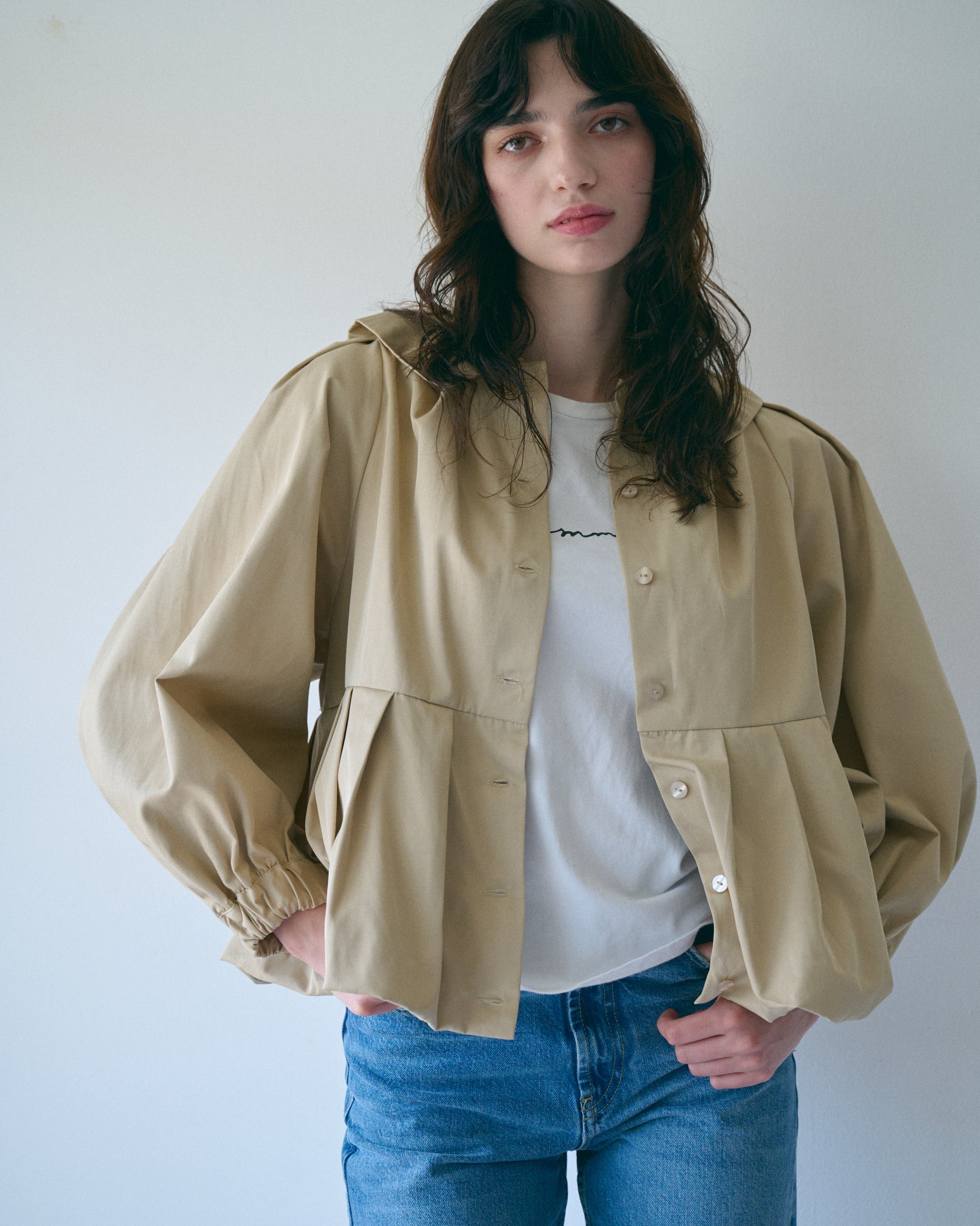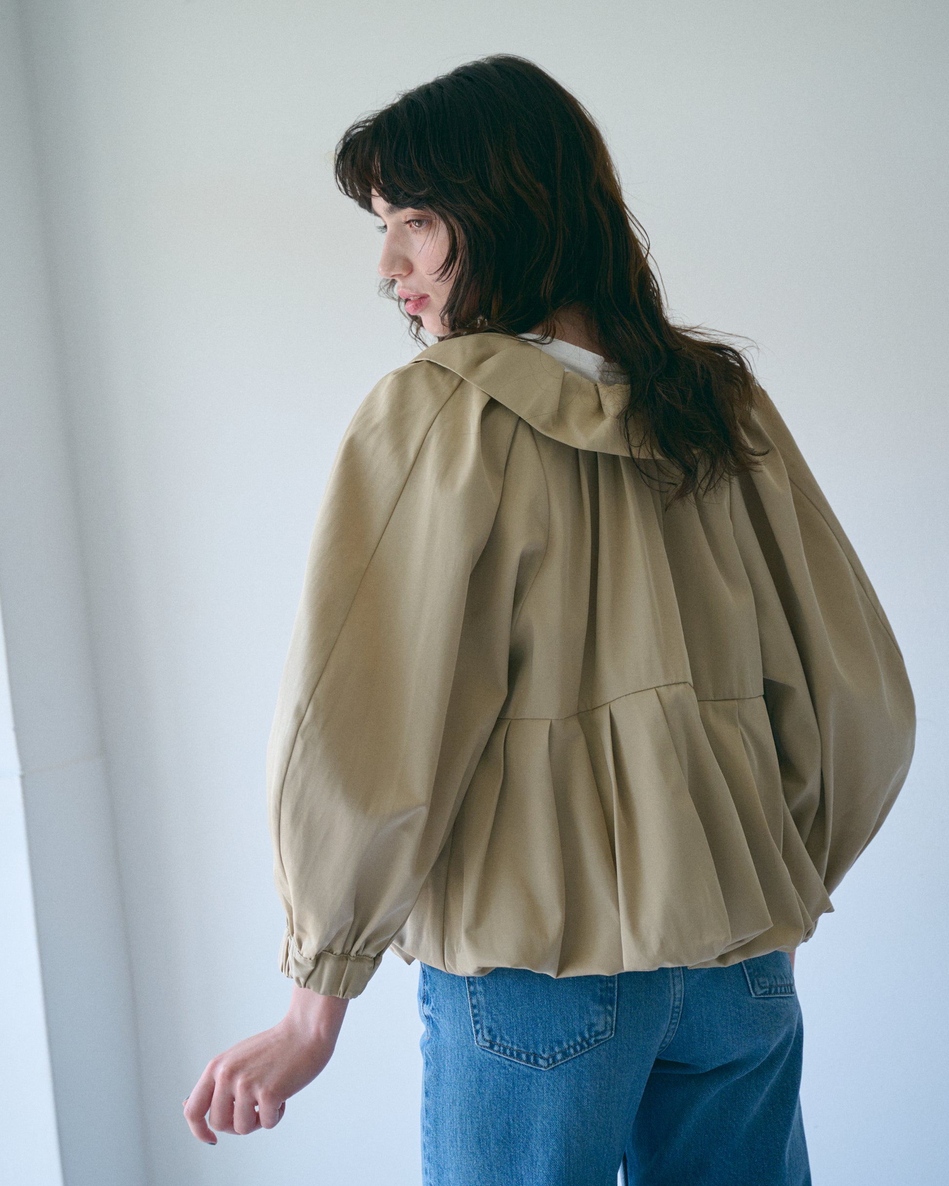 タックの入ったバルーン衿がデザインポイント。