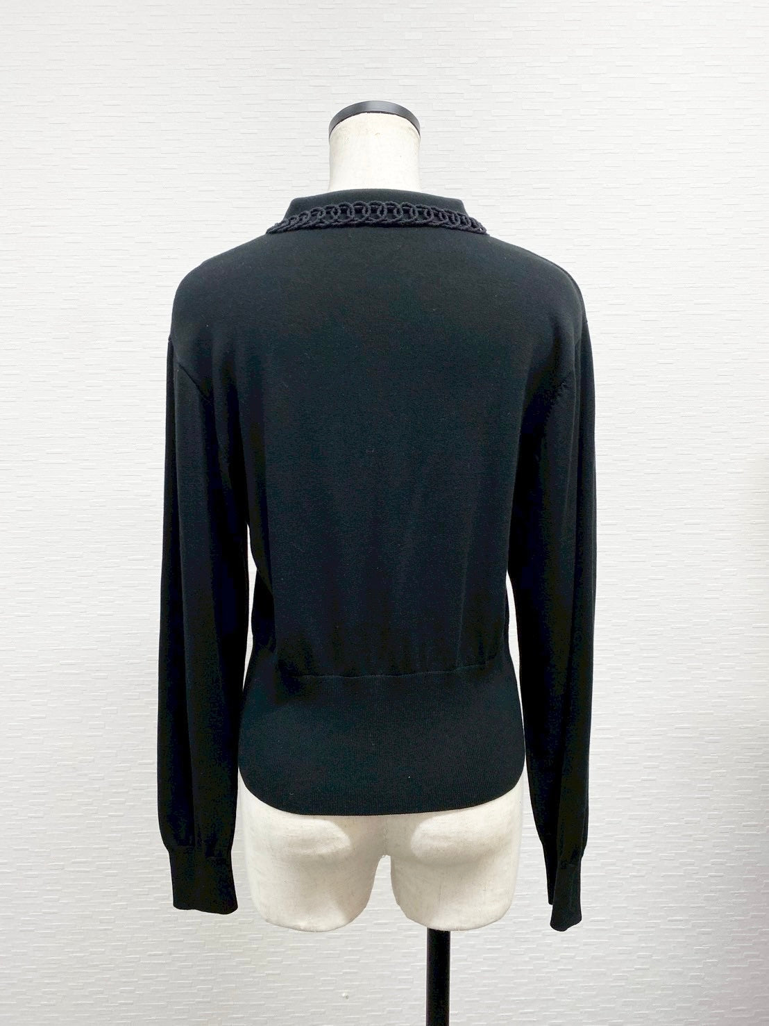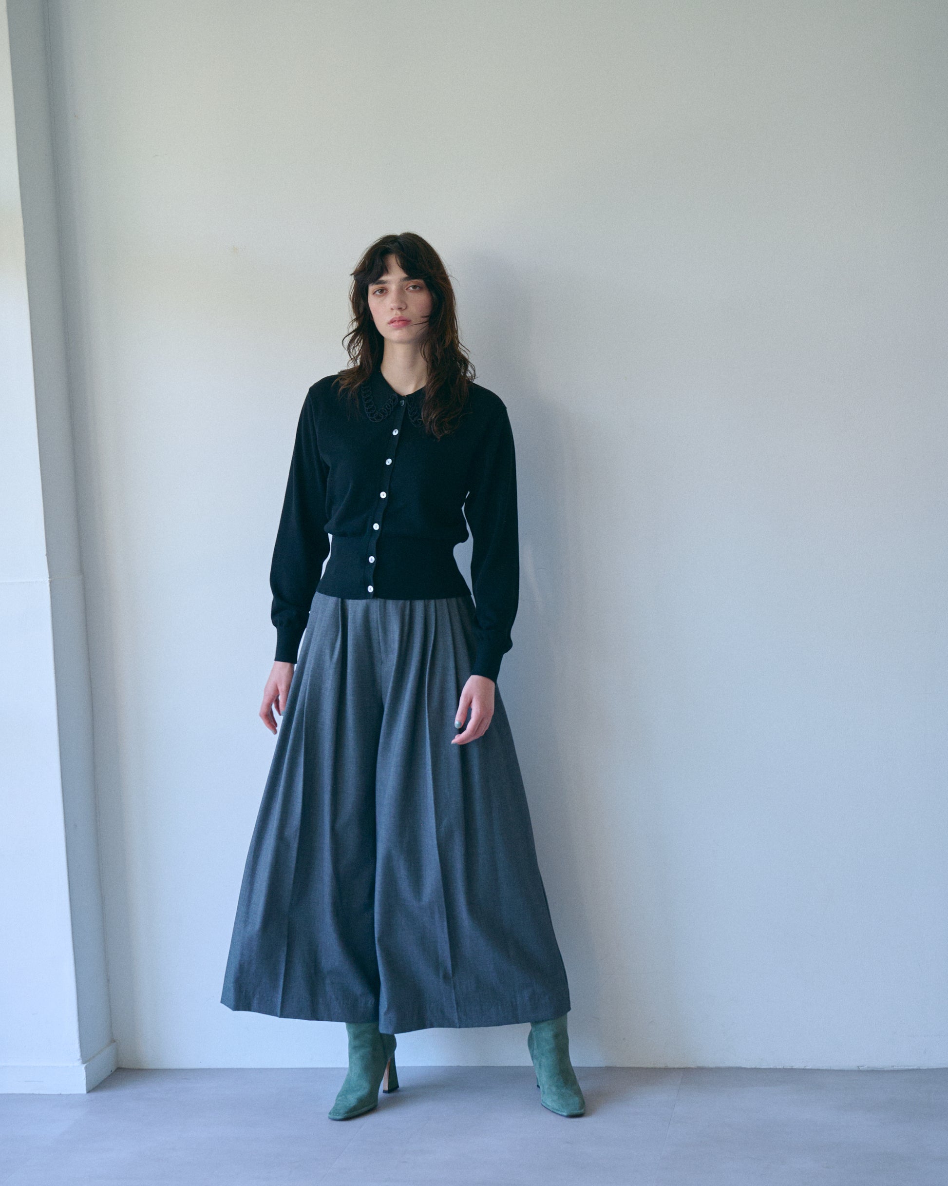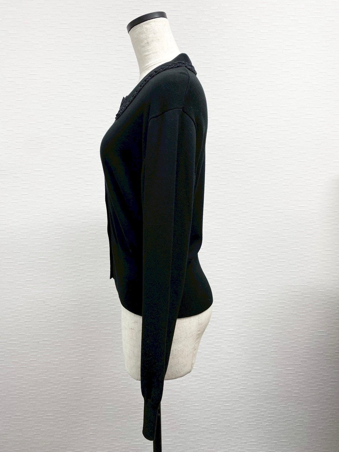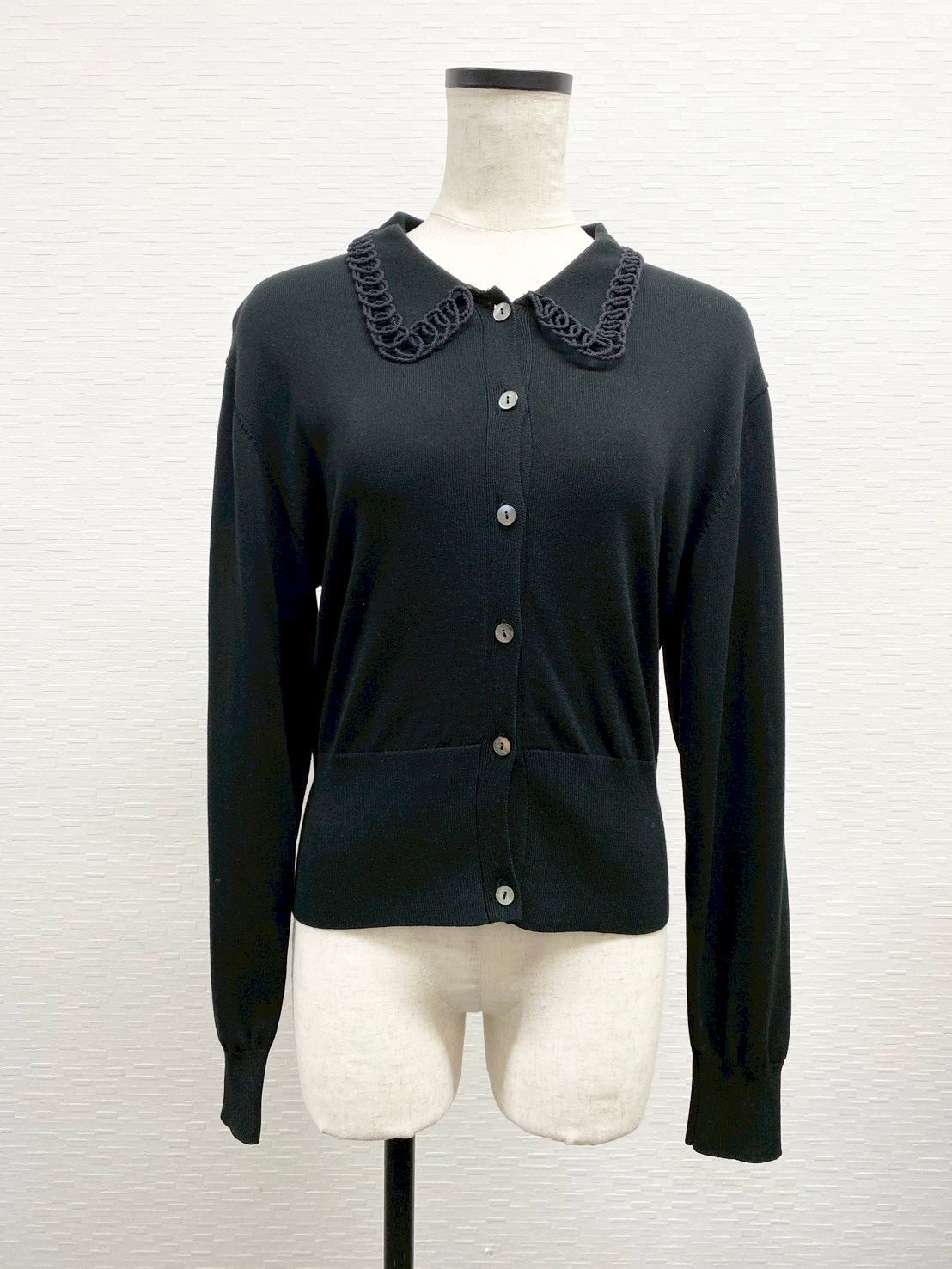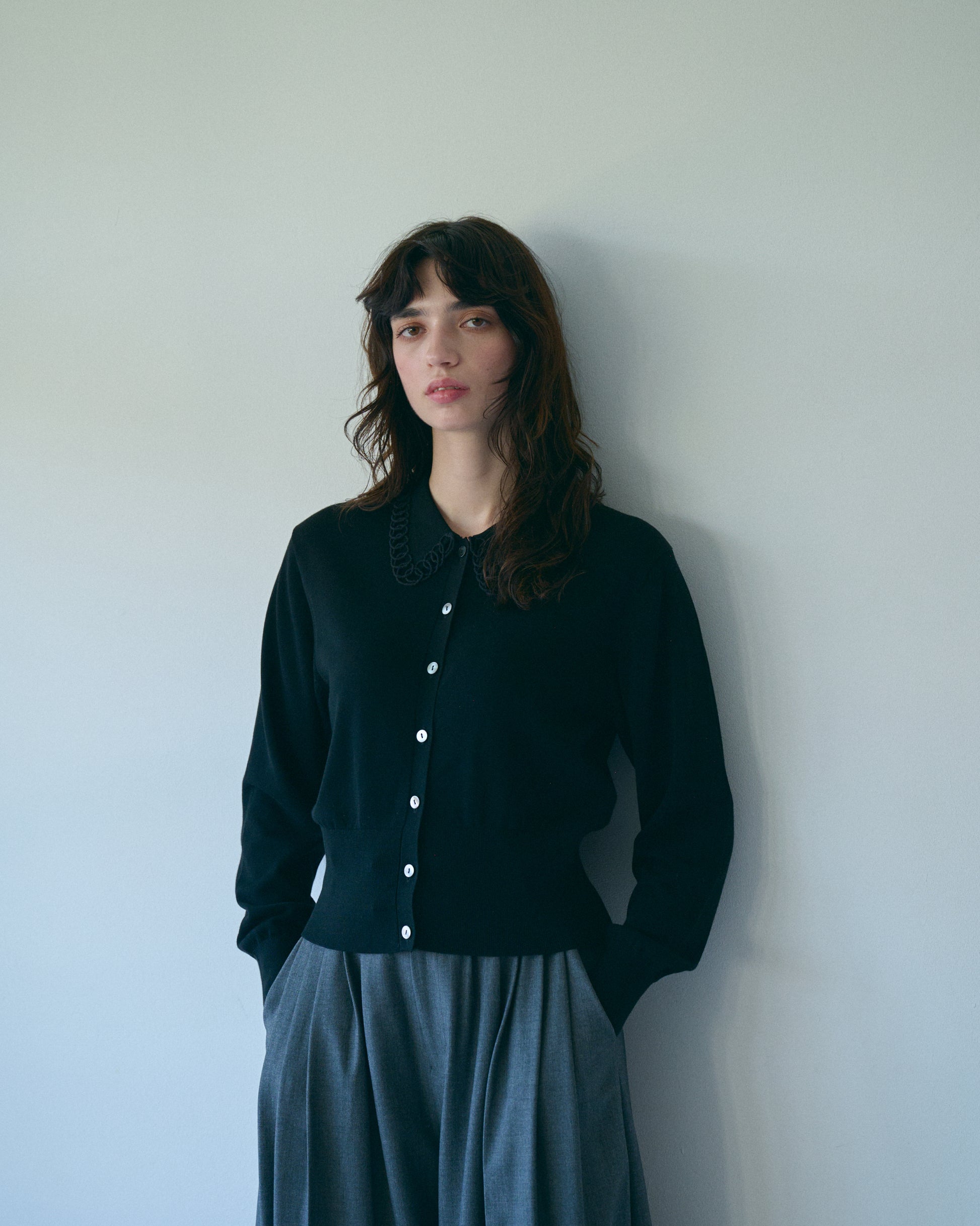 襟部分にレースのようなフェミニンなコード刺繍をあしらった上品な印象のニットカーディガン。前のボタンを留めてトップスとしての着用も可能です。