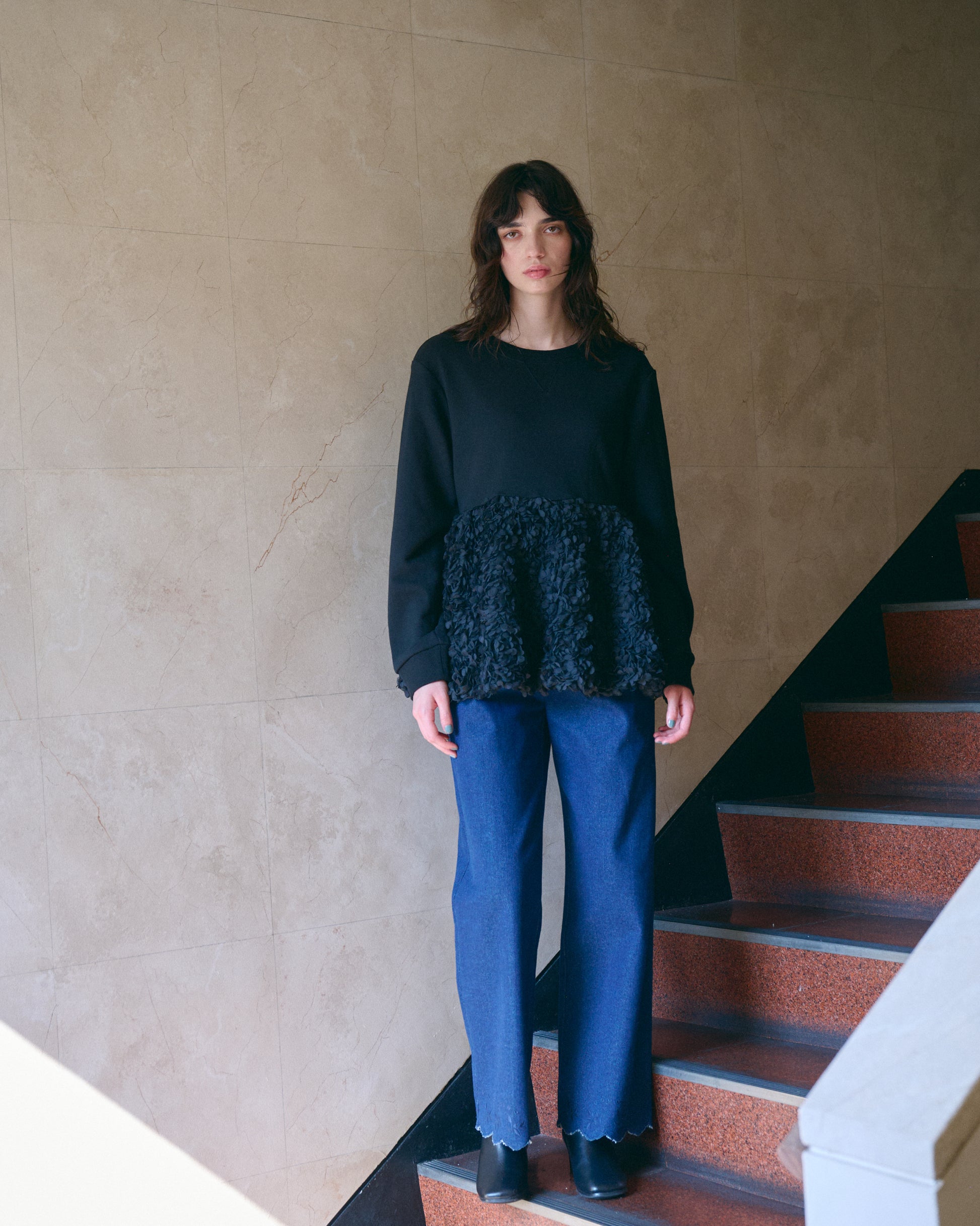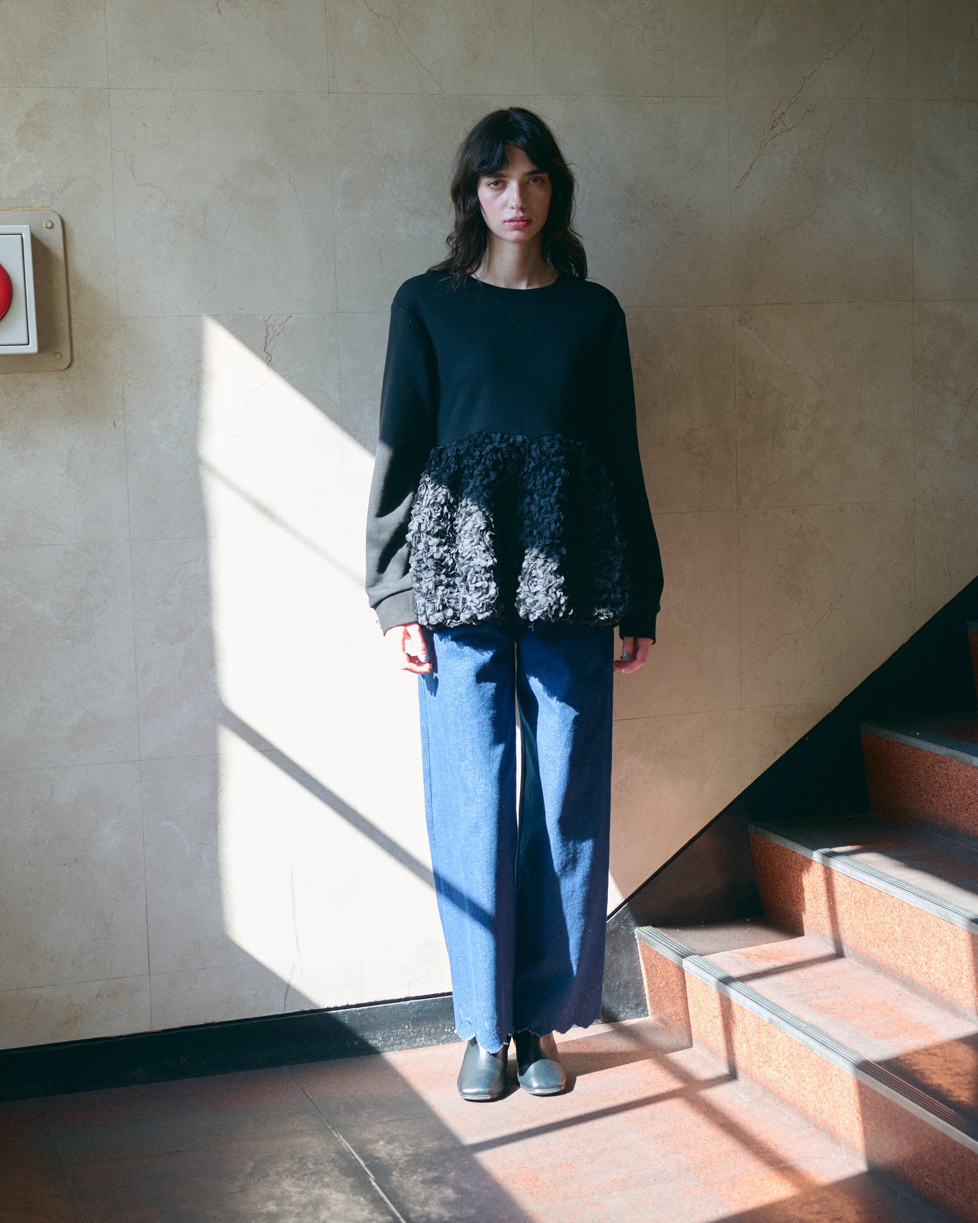 裾にオリジナルのカットワーク刺繍を施した、ストレートデニムパンツ。ウエストはゴム仕様でイージーな履き心地が嬉しいポイント。ウエストのタックがウエスト周りを綺麗に見せてくれます。ウエストにはグログランリボンを採用し、カジュアルな仕様ながら上品見えを叶えてくれます。ポケットを備えたデザインでデイリーにお使いいただけます。ワンウォッシュが入った程よいカジュアルさのデニムです。