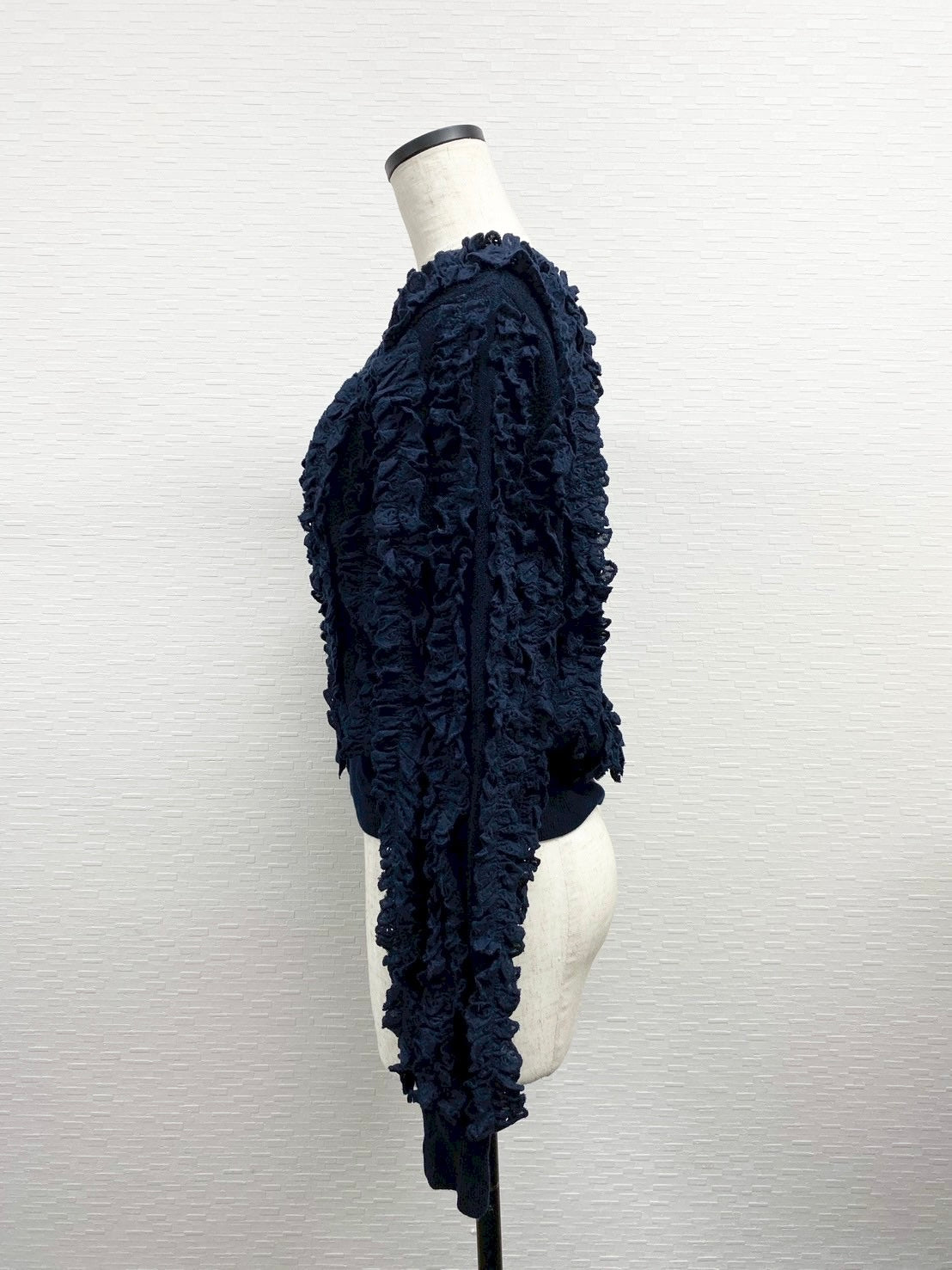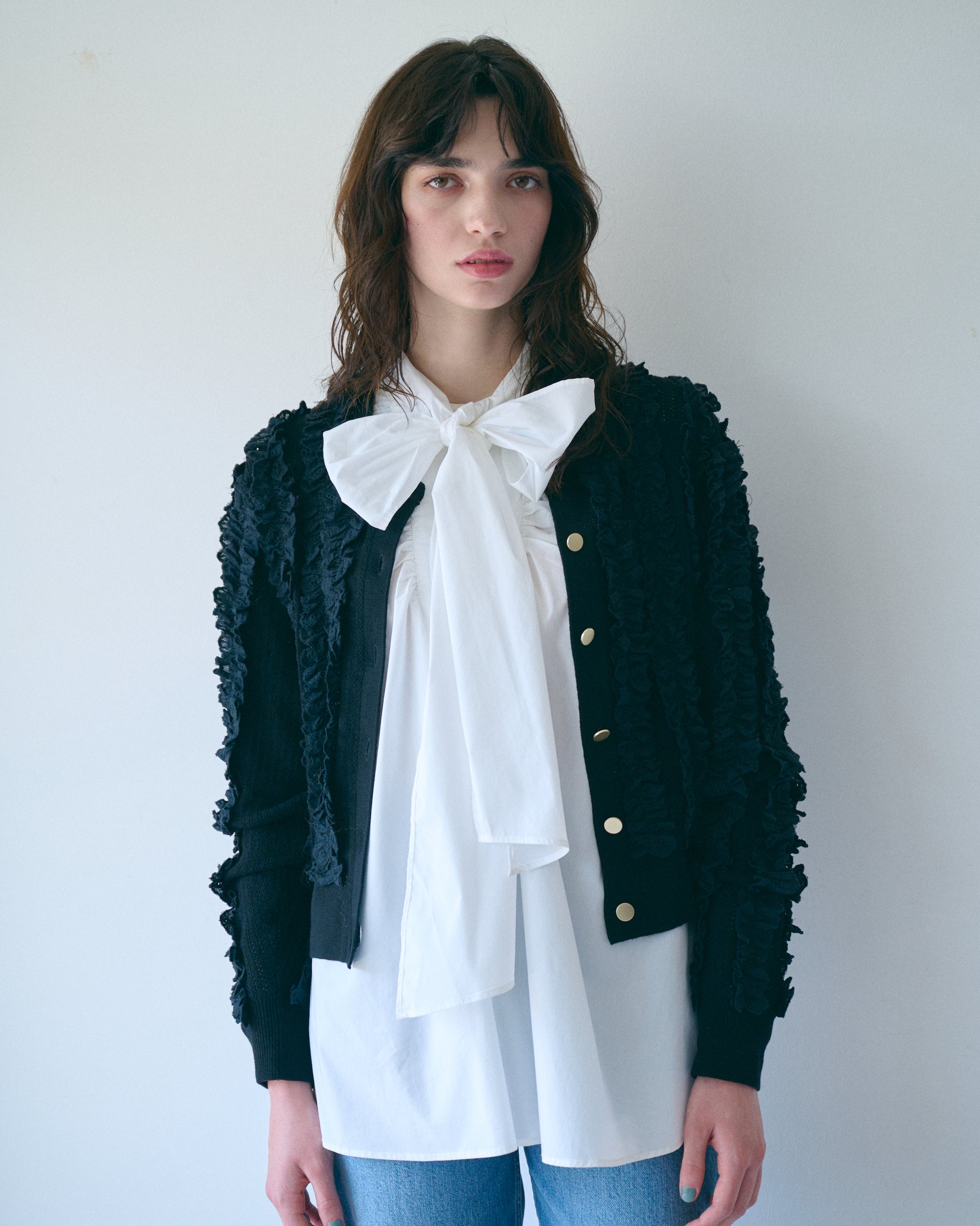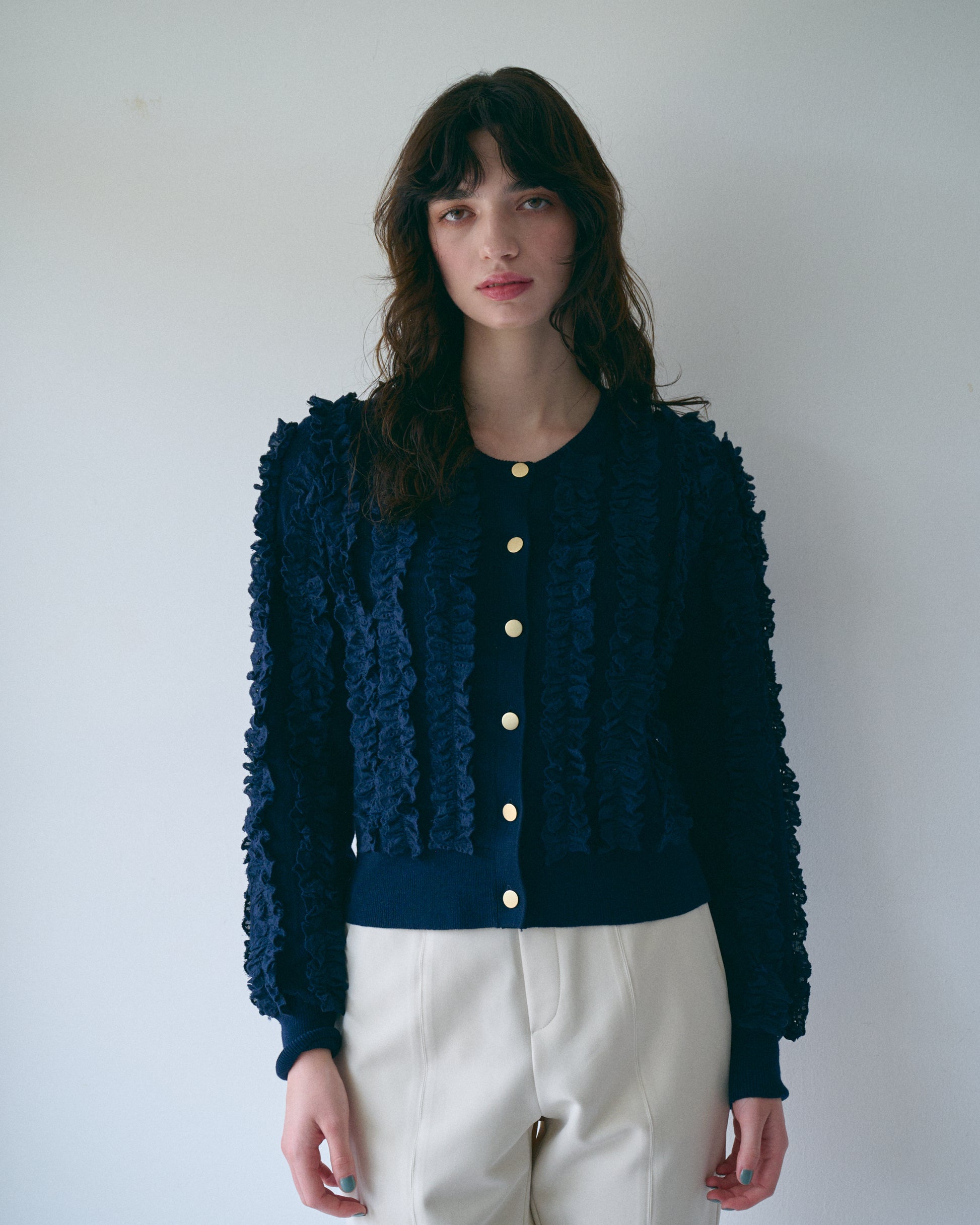たっぷりとギャザーをよせたレースが目を魅くフェミニンな印象のニットカーディガン。