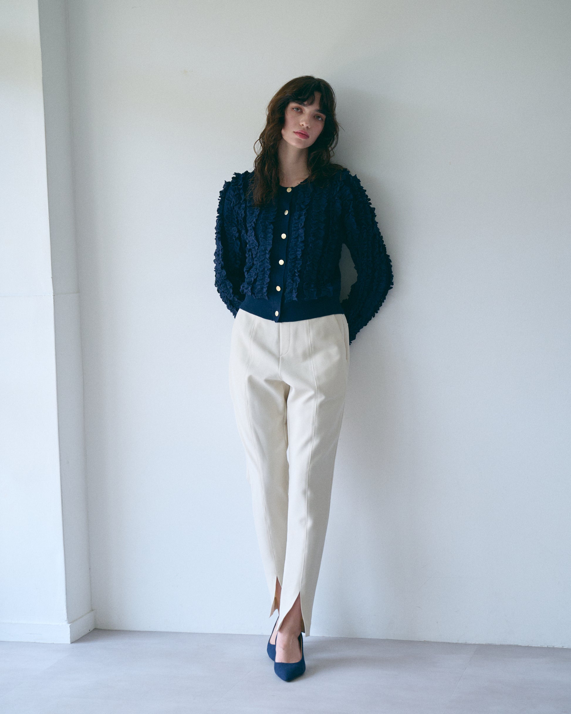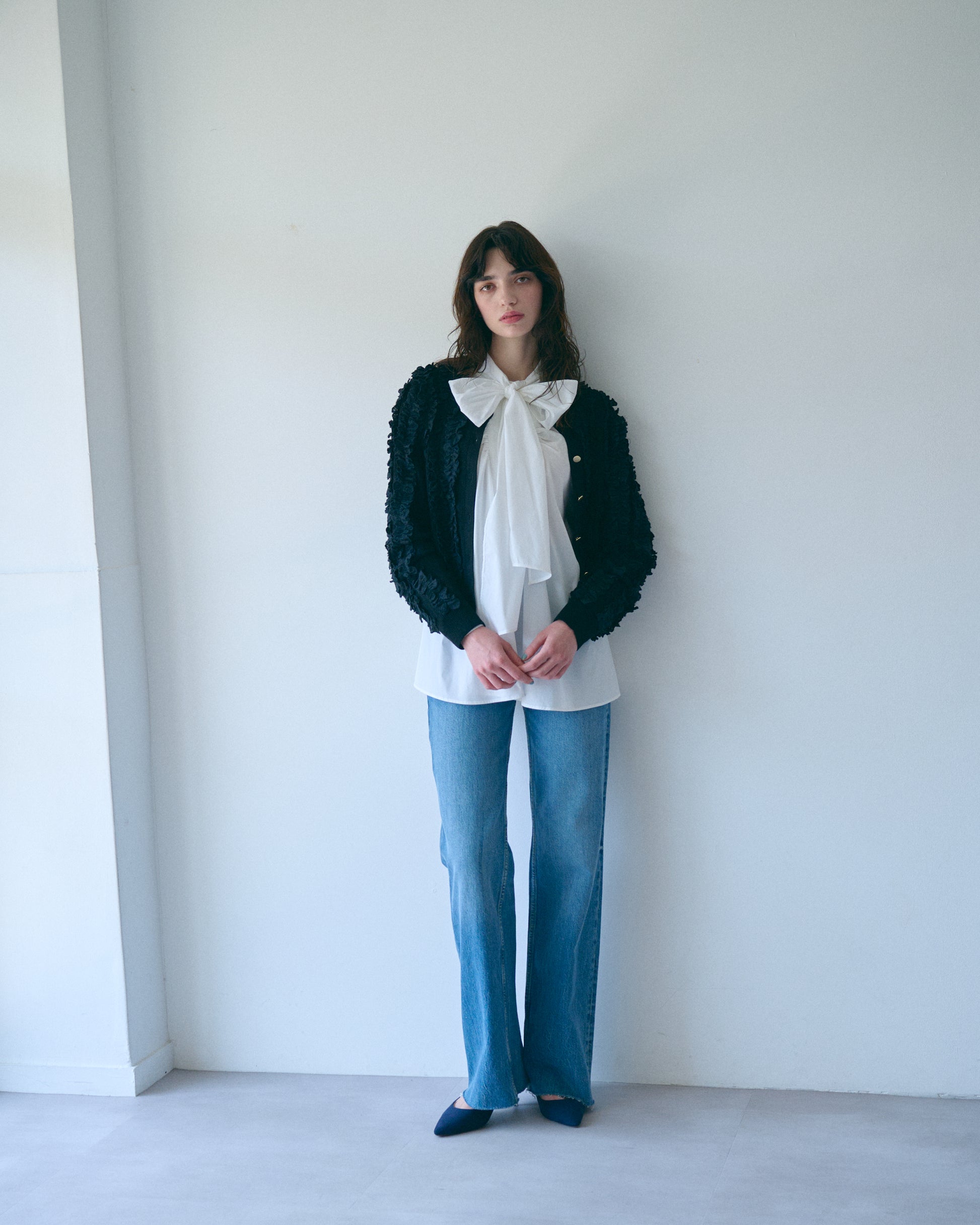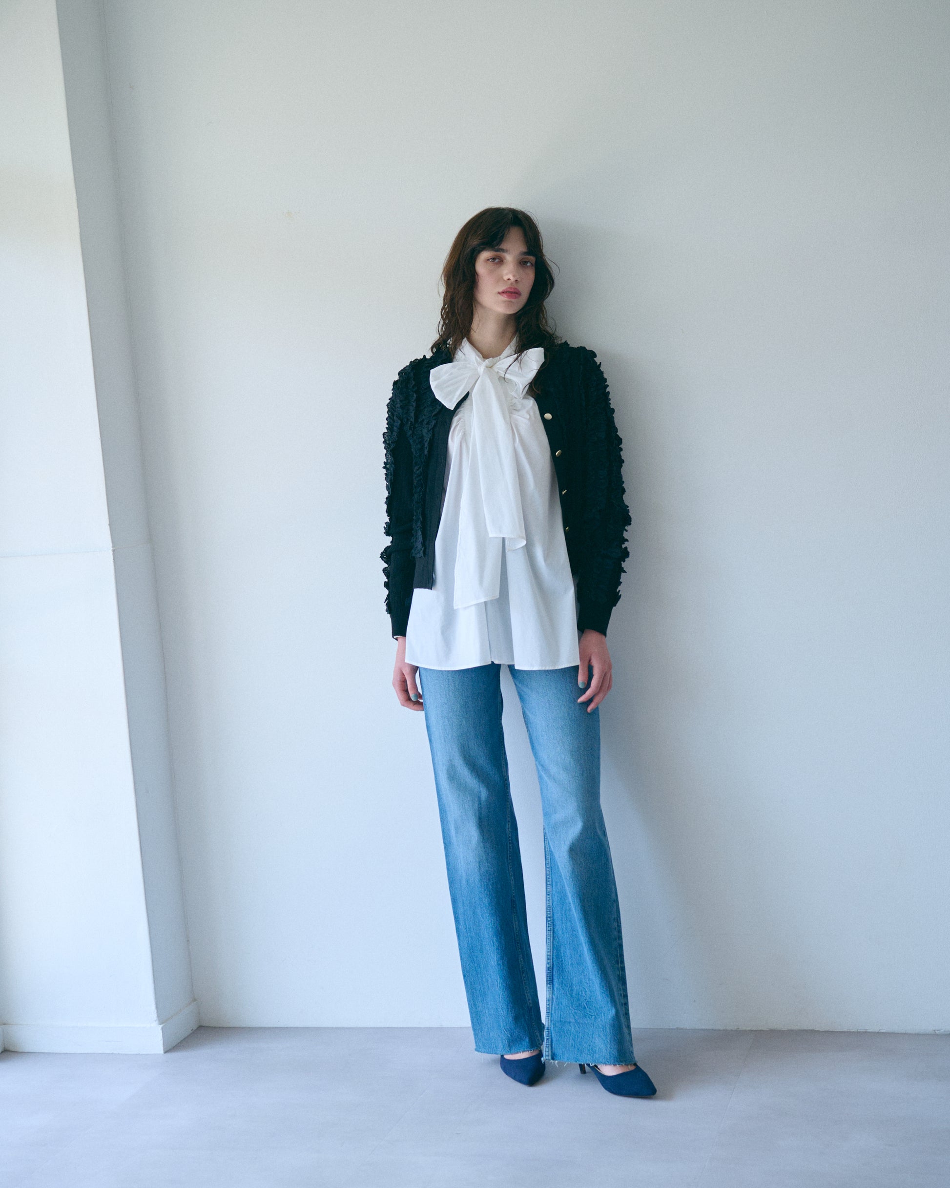 インナーにベーシックなカットソーやブラウスを重ねると、レースフリルの繊細なディテールが際立ち、コーディネートが洗練された印象に仕上がります。