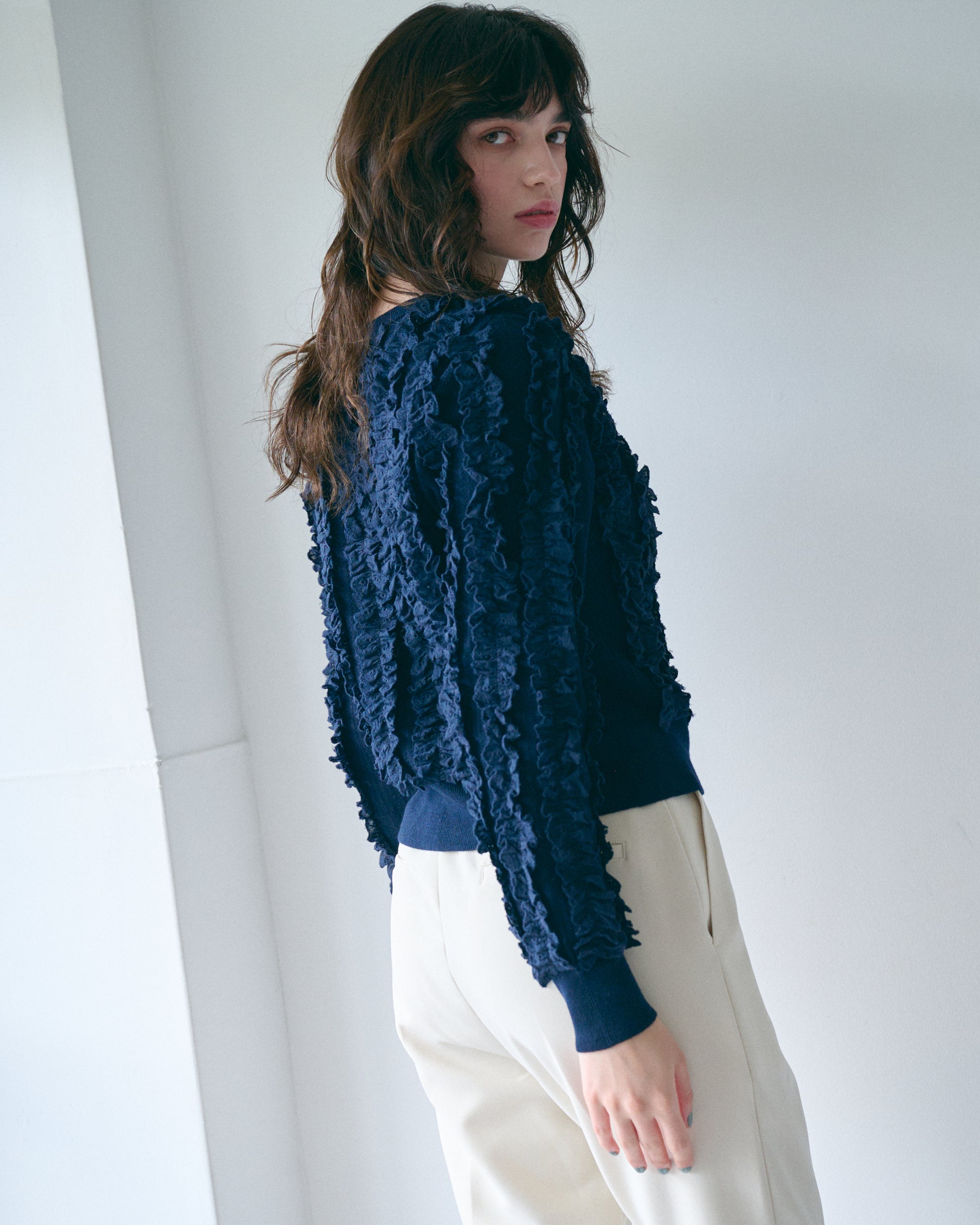 柔らかなニット素材に、繊細なレースを組み合わせて華やかさをプラス。軽さと柔らかさ、そして程よい伸縮性を兼ね備えた素材感です。快適な着心地と上品な印象を両立した一着に仕上がっています。